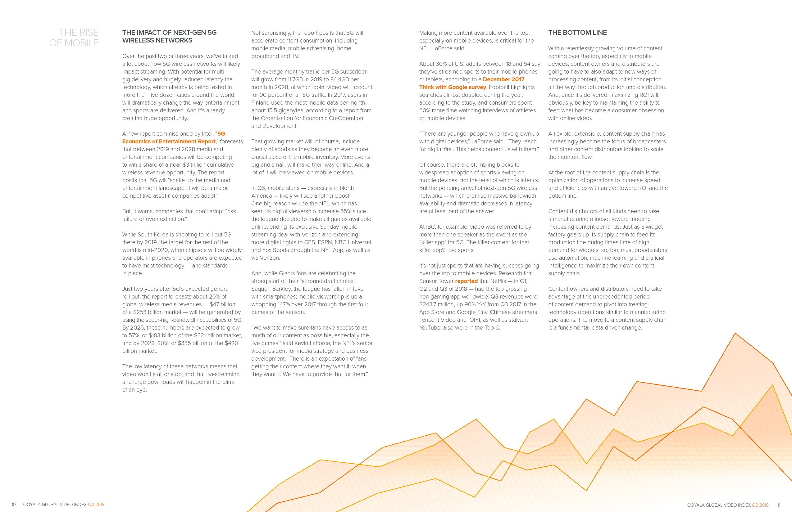 在过去两三年中,视频行业一直在探讨5G无线网络将会如何影响流媒体服务。5G网络意味着更多网络传输和降低延迟的新技术的运用,目前这些新技术已经在全球60多个国家开始测试,未来也将深刻地影响娱乐和体育内容的传播,这也是大量机会产生的契机。