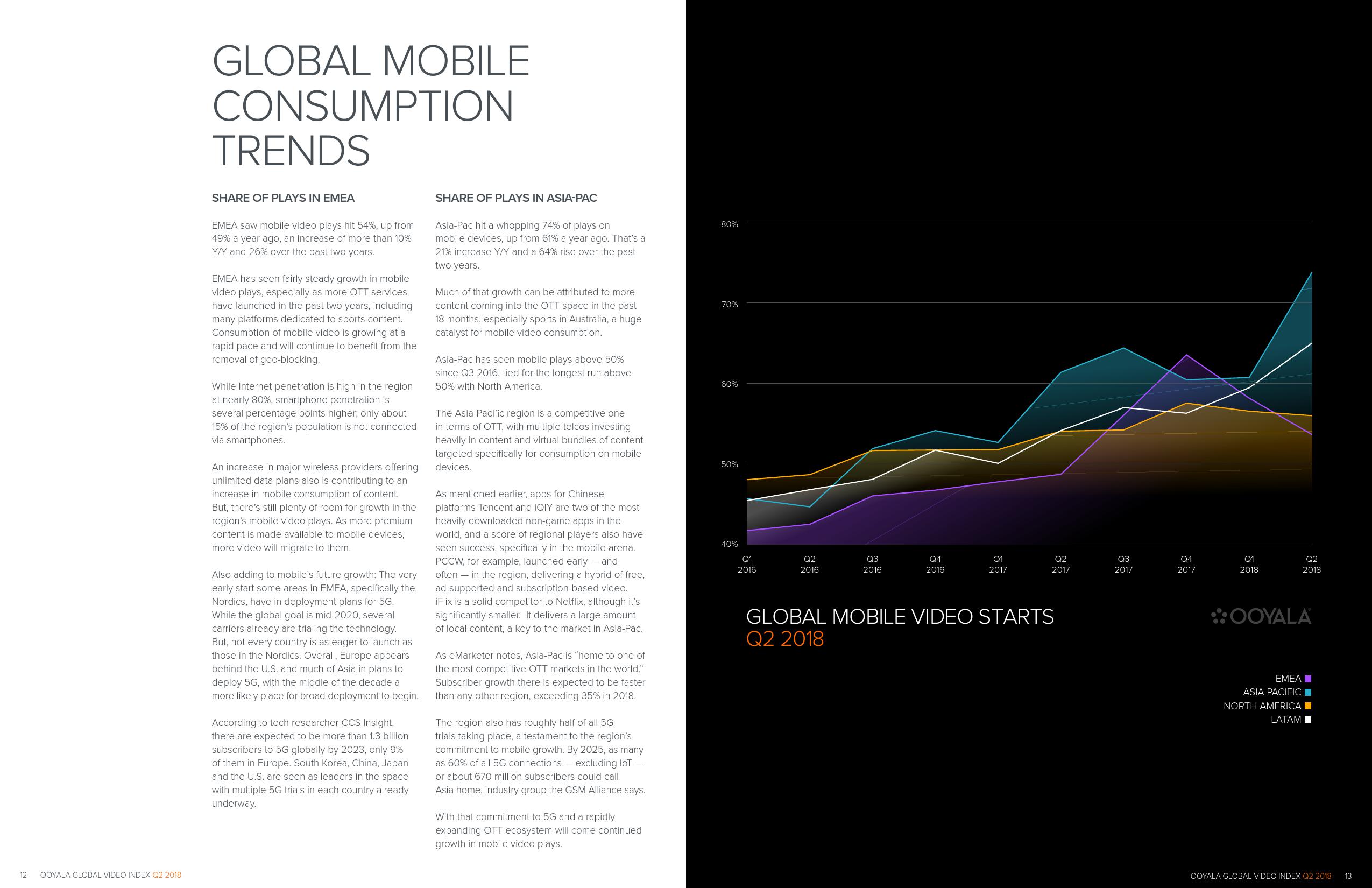 欧洲、中东和非洲地区移动视频播放率从去年的49%增长到54%,同比增长超过10%,过去两年共增长了26%。该地区在移动视频播放量方面的增长保持稳定,尤其是在过去两年中新增了更多OTT服务,包括很多体育内容平台。