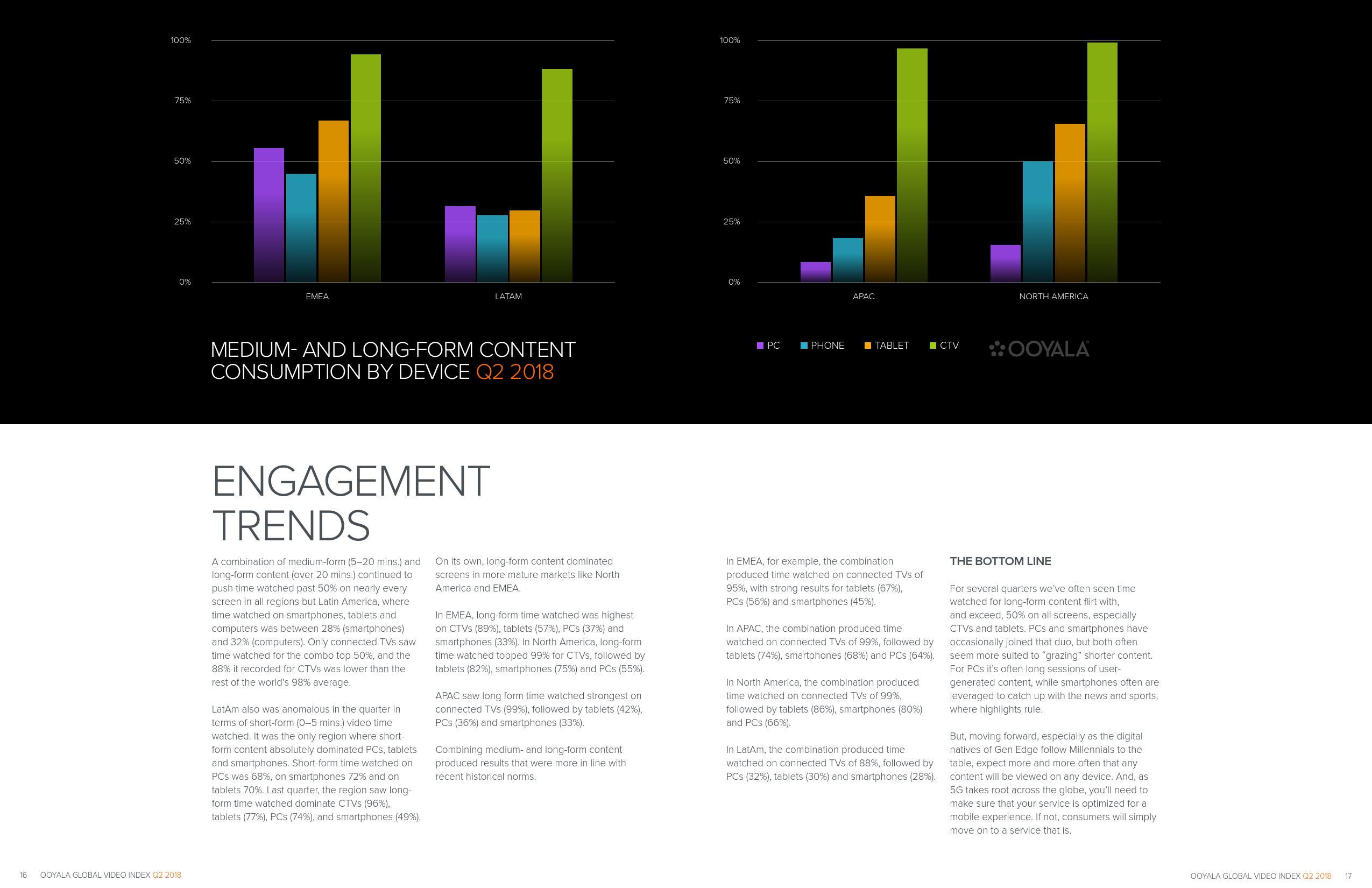 中等长度视频(5-20分钟)和长视频(20分钟以上)加起来在所有设备上的观看时间超过了50%,除拉丁美洲以外的各地区都呈现出了这个特点。而拉丁美洲地区在智能手机上的视频观看时间为28%,电脑上为32%,只有网络电视的中等和长视频观看量超过50%,88%的中长视频观看率则低于世界其他地区的98%。