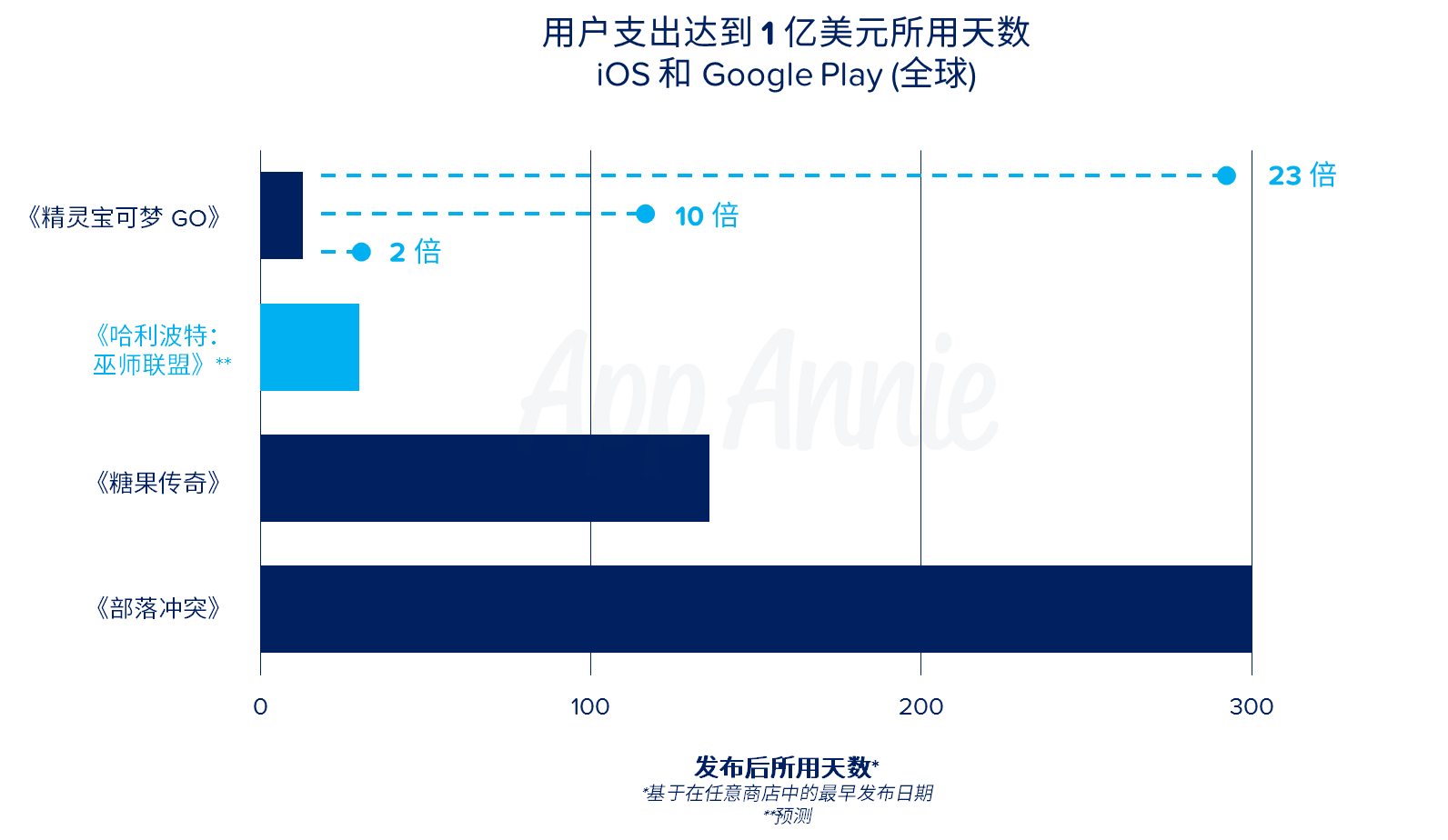 《精灵宝可梦 GO》打破了移动游戏记录,用户支出在发布后的两周内就达到 1 亿美元,成为用户支出最快达到 10 亿美元的游戏。虽然我们不指望《哈利波特:巫师联盟》能超越《精灵宝可梦 GO》,但若要《哈利波特:巫师联盟》在其发布后的 30 天内达到 1 亿美元的用户支出也并非易事。