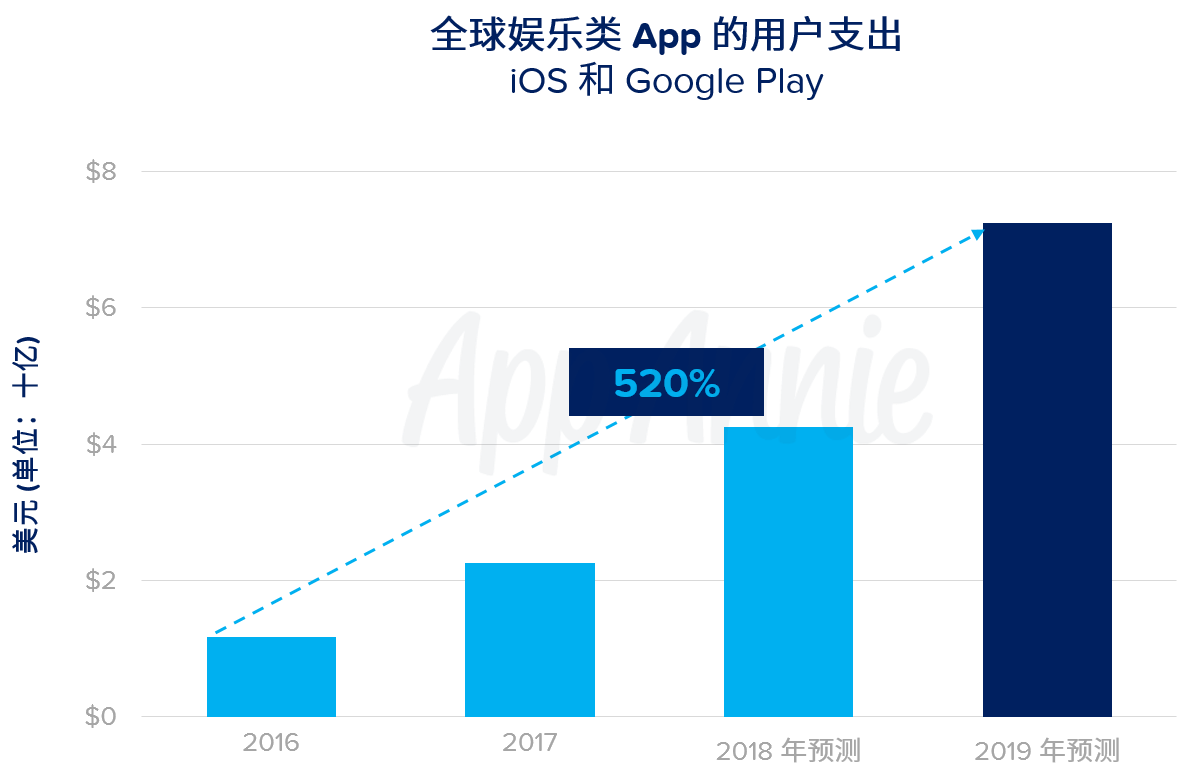 普通人平均每天在媒体上花费超过 7.5 小时——无论是收听音乐和观看视频、还是阅读和发帖。2019 年,在电视和互联网等媒体上所花费的每小时中,将有 10 分钟来自个人在移动设备上观看在线视频。从 2016 年到 2019 年,每台设备的在线视频观看总时长将增长 110%。娱乐 App 的全球用户支出将增长 520%,主要来自在线视频 App 的 App 内订阅。在线观看将继续由短视频 App 主导推动——在美国排名前 10 的在线视频 App 中,用户 4/5 的观看时间 (即 5 分钟中有 4 分钟) 花在了 YouTube 上。此外,增长在某种程度上将由抖音等社交视频 App 以及 Instagram 和 Snapchat 等社交类 App 中短视频的兴起推动。