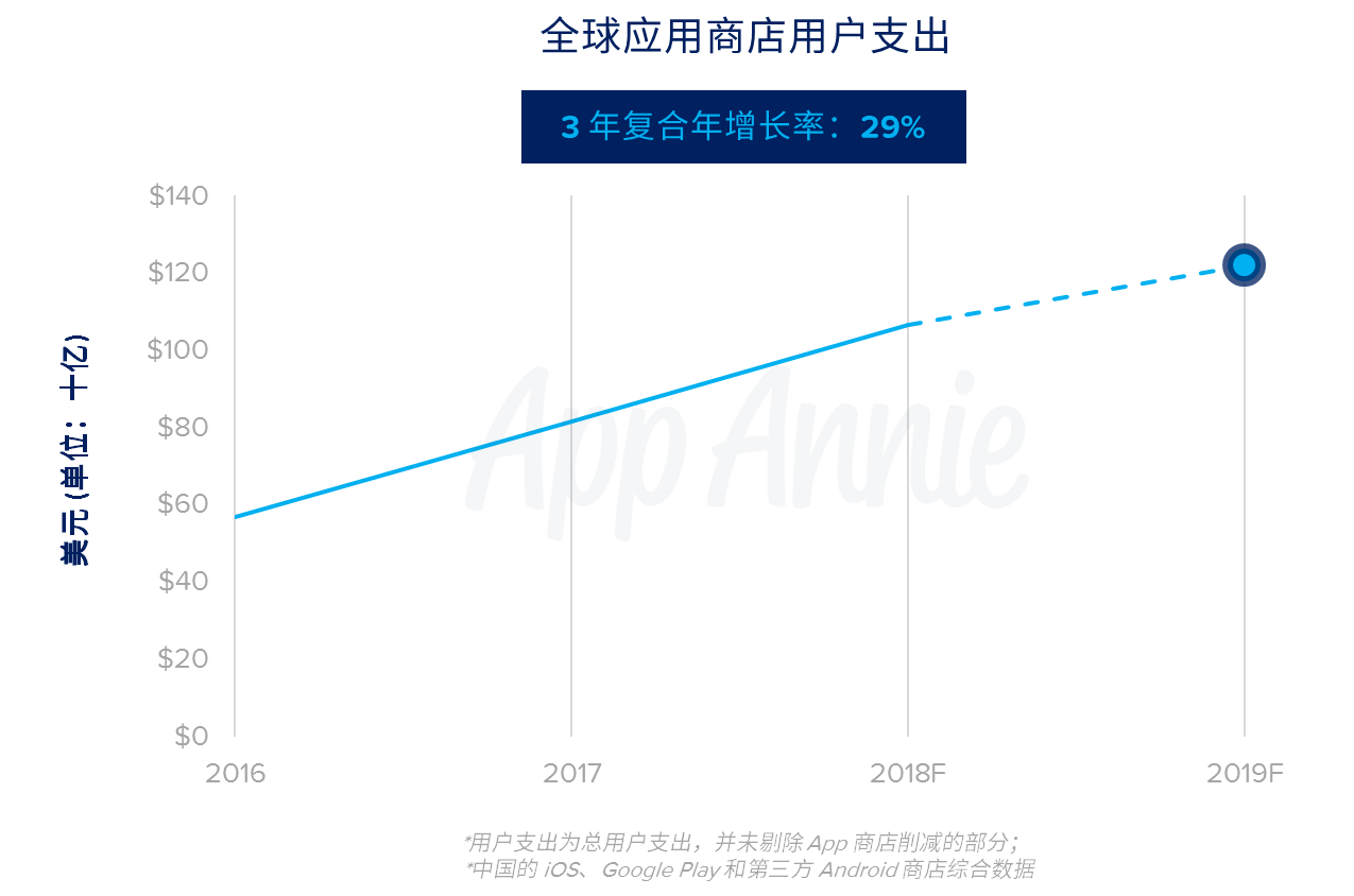 1) App 商店用户支出将在 2019 年超过 1,220 亿美元——是全球电影票房市场规模的 2 倍