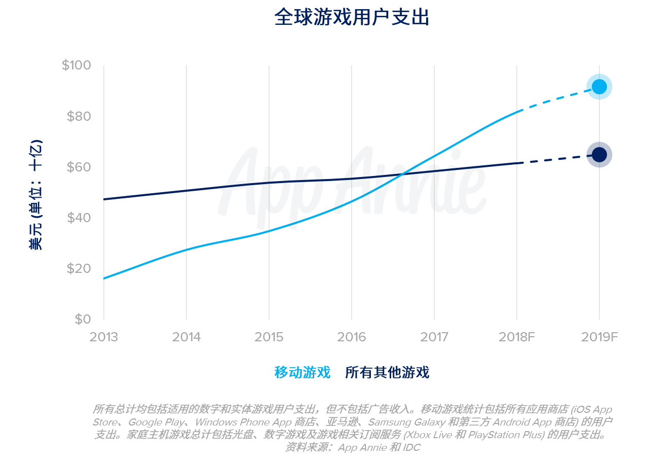 2019 年,全球 App 商店的用户支出增速将达到全球经济整体增速的 5 倍。移动端将继续占据消费者的意识主流,并成为企业发展的优先事项。不过,这仅代表移动经济总体增长的一小部分——移动支出也有望在 App 内广告和在 App 商店外开展的商务交易领域 (如优步、星巴克、亚马逊) 实现增长。随着移动游戏继续成为增长最快的游戏形式,游戏将推动 App 商店的大部分用户支出的增长。中国仍将是 App 商店用户支出增长的头号主力;然而,如果游戏牌照持续暂缓发放,我们预计 2019 年中国的用户支出增长也将放缓。
