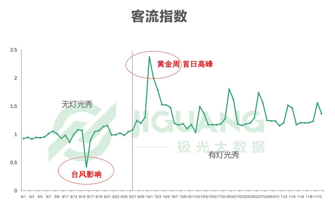 - 灯光秀举办以后,客流指教较无灯光秀时明显攀升,小长假首日达到客流高潮;