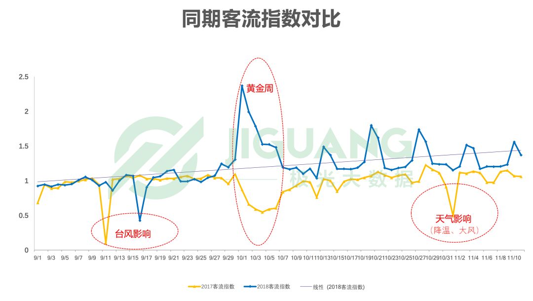 - 与17年同期相比,黄金周客流指数走势差异明显,灯光秀集客能力显著。
