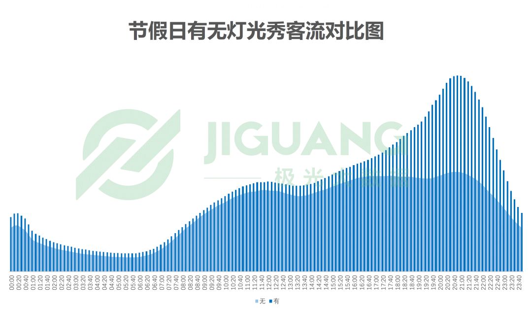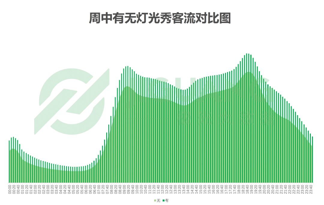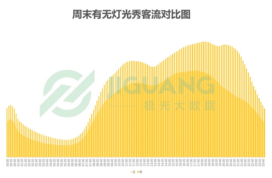 - 周末,相比无灯光秀时,全天客流量有一定幅度增加,灯光秀举办时间段附近客流量增幅较为显著;