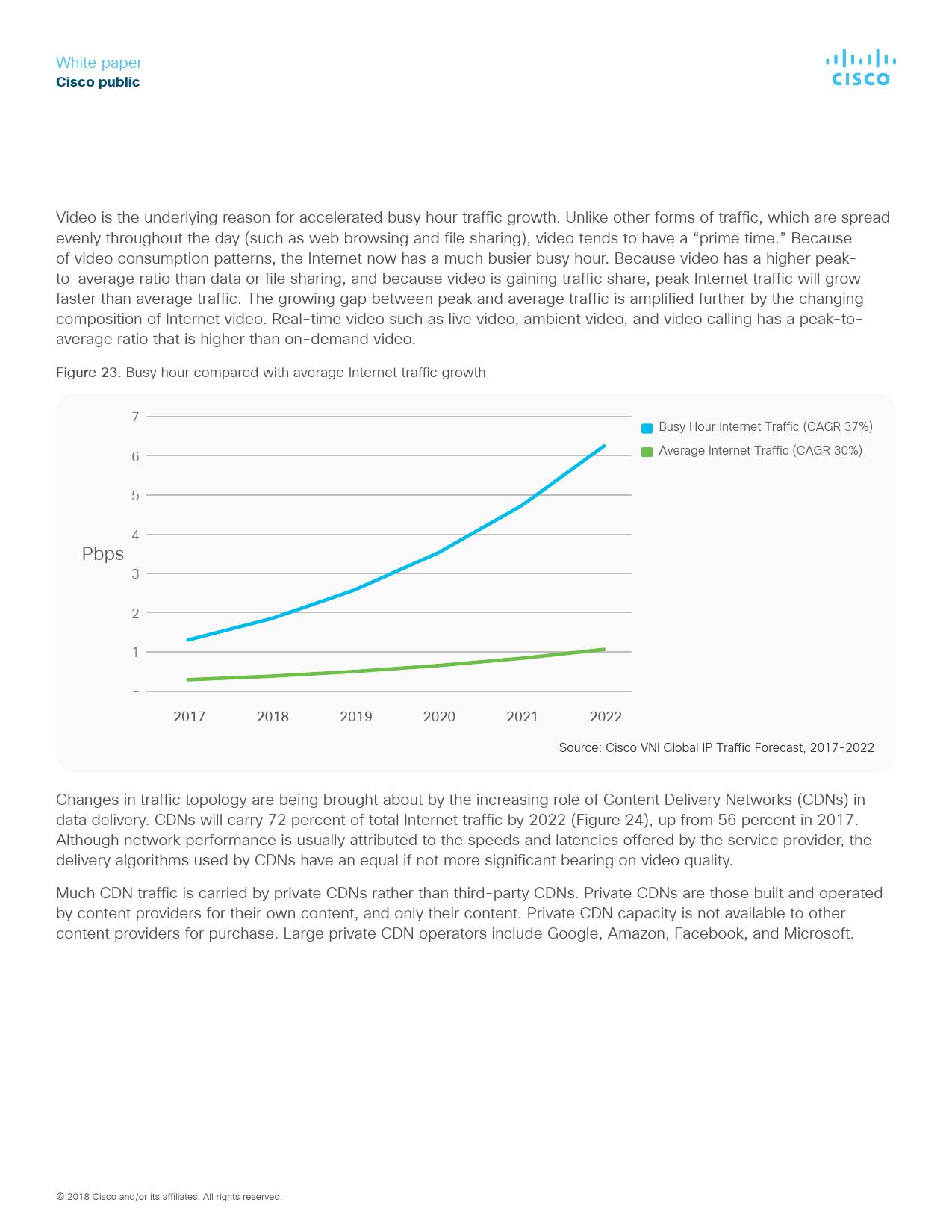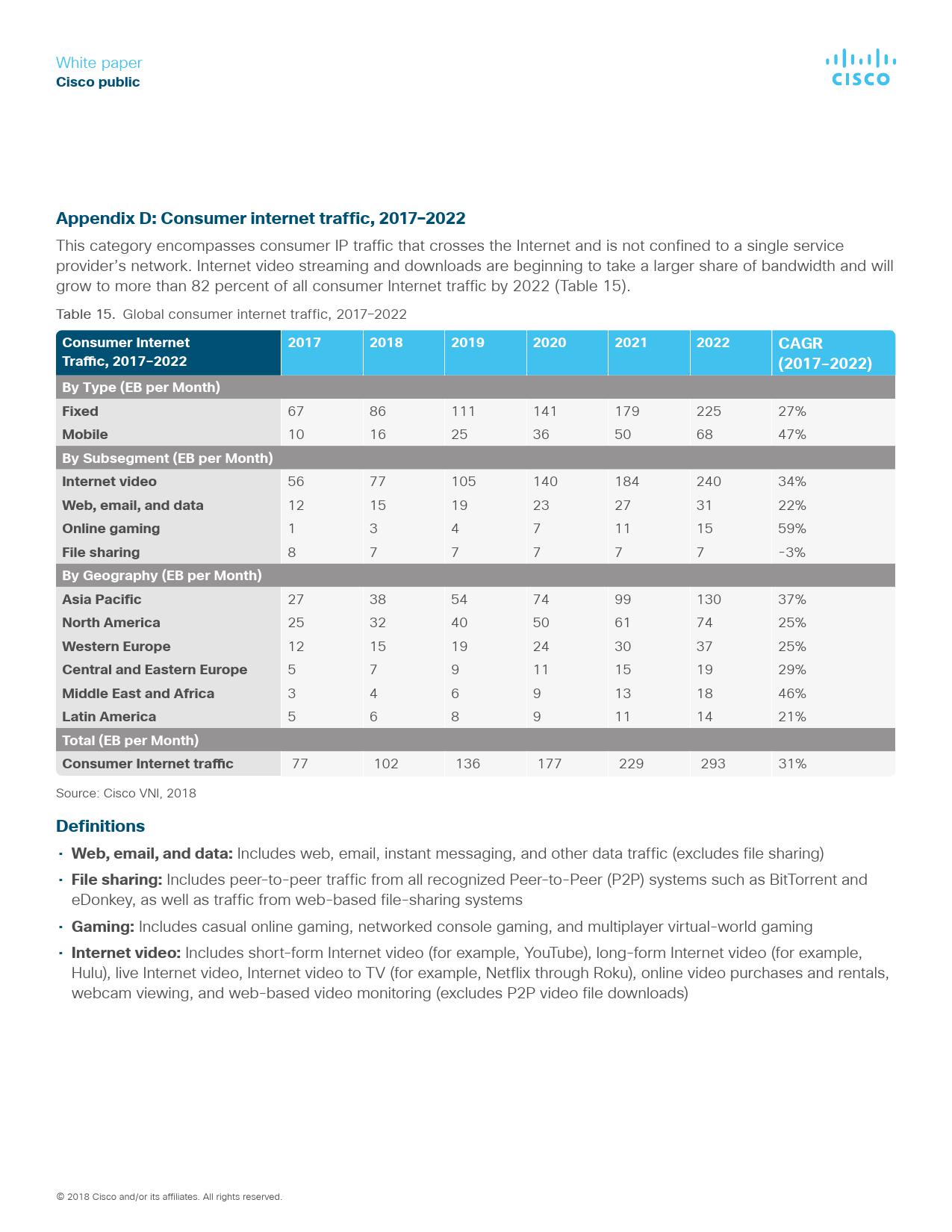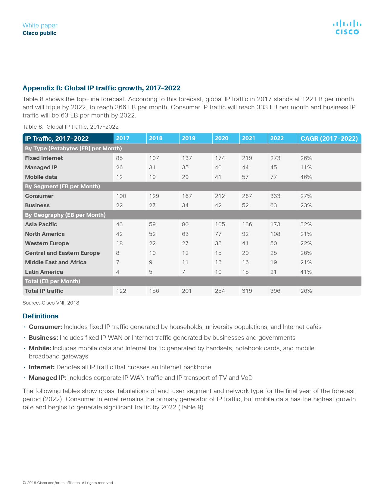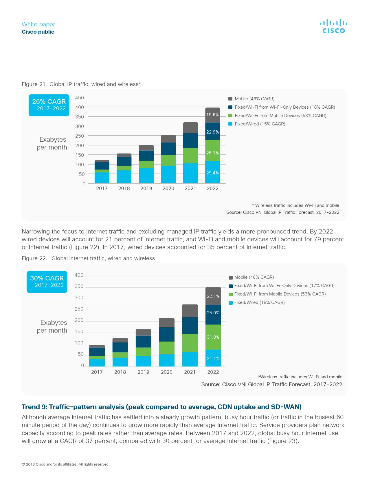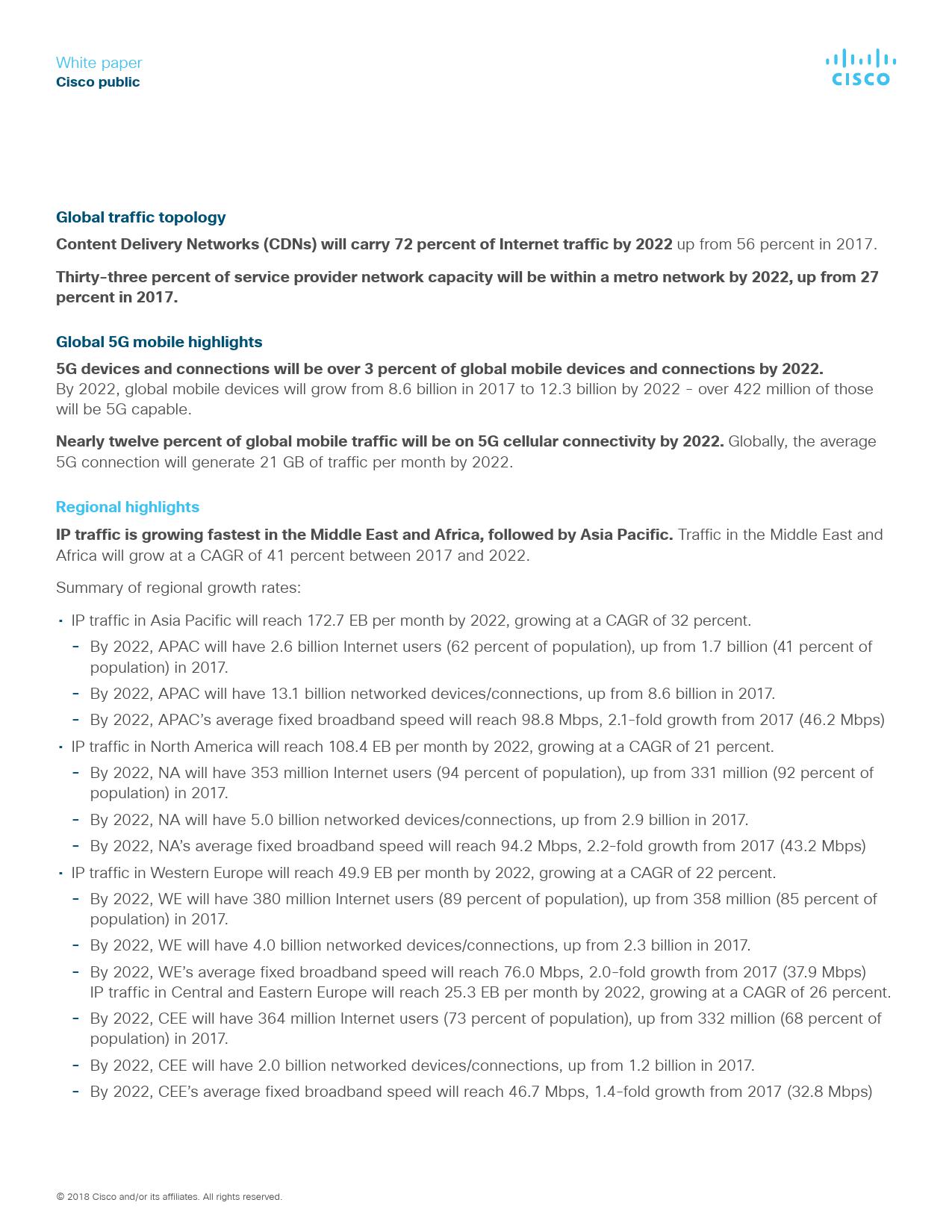 到2022年,互联网流量繁忙时段将比普通时段活跃六倍。从2017至2022年,繁忙时段流量将增加5倍(年复合增长率37%),到2022年达到每秒7.2千兆。普通时段流量将增长近4倍(年复合增长率30%),到2022年达到每秒1千兆。