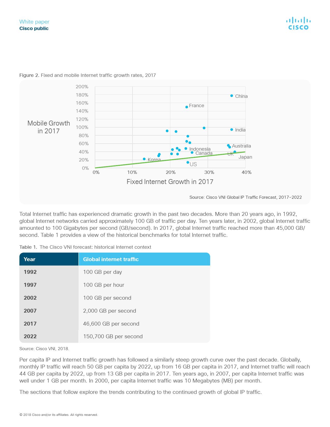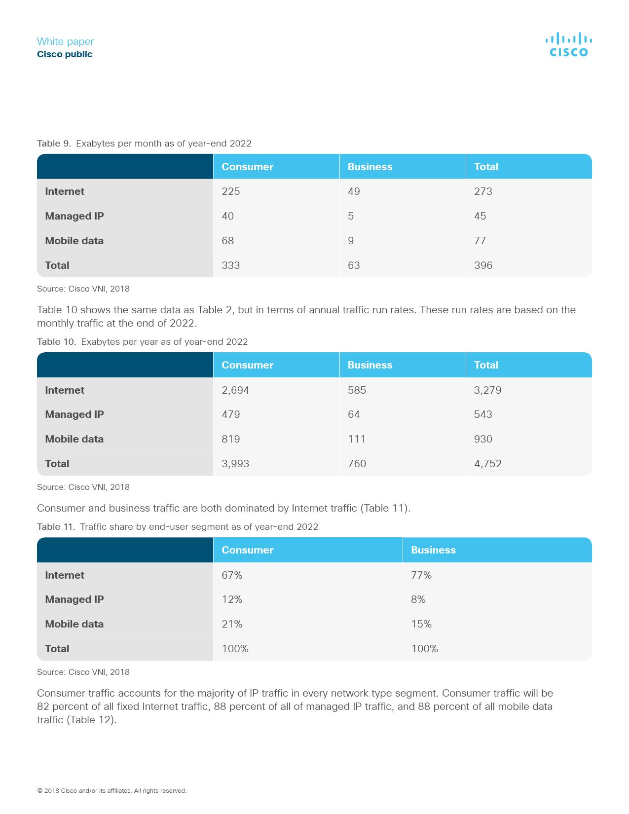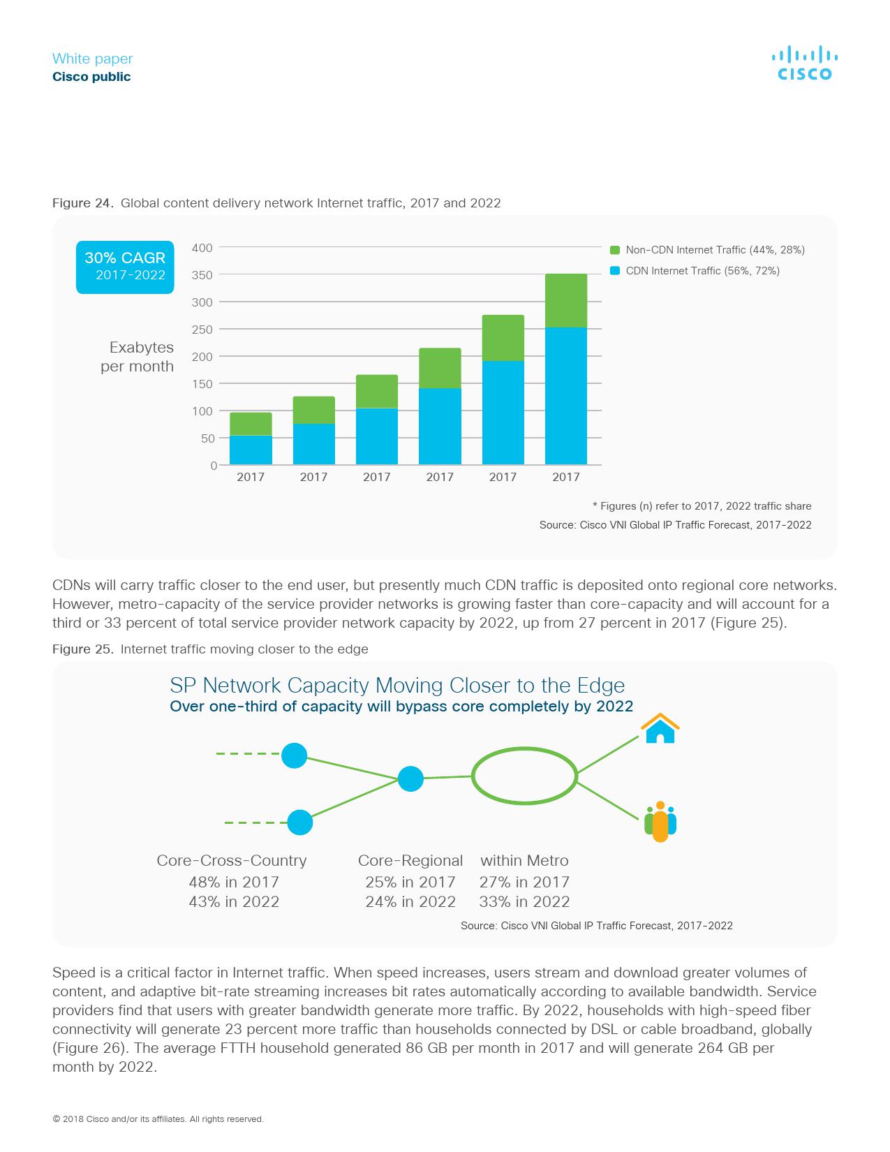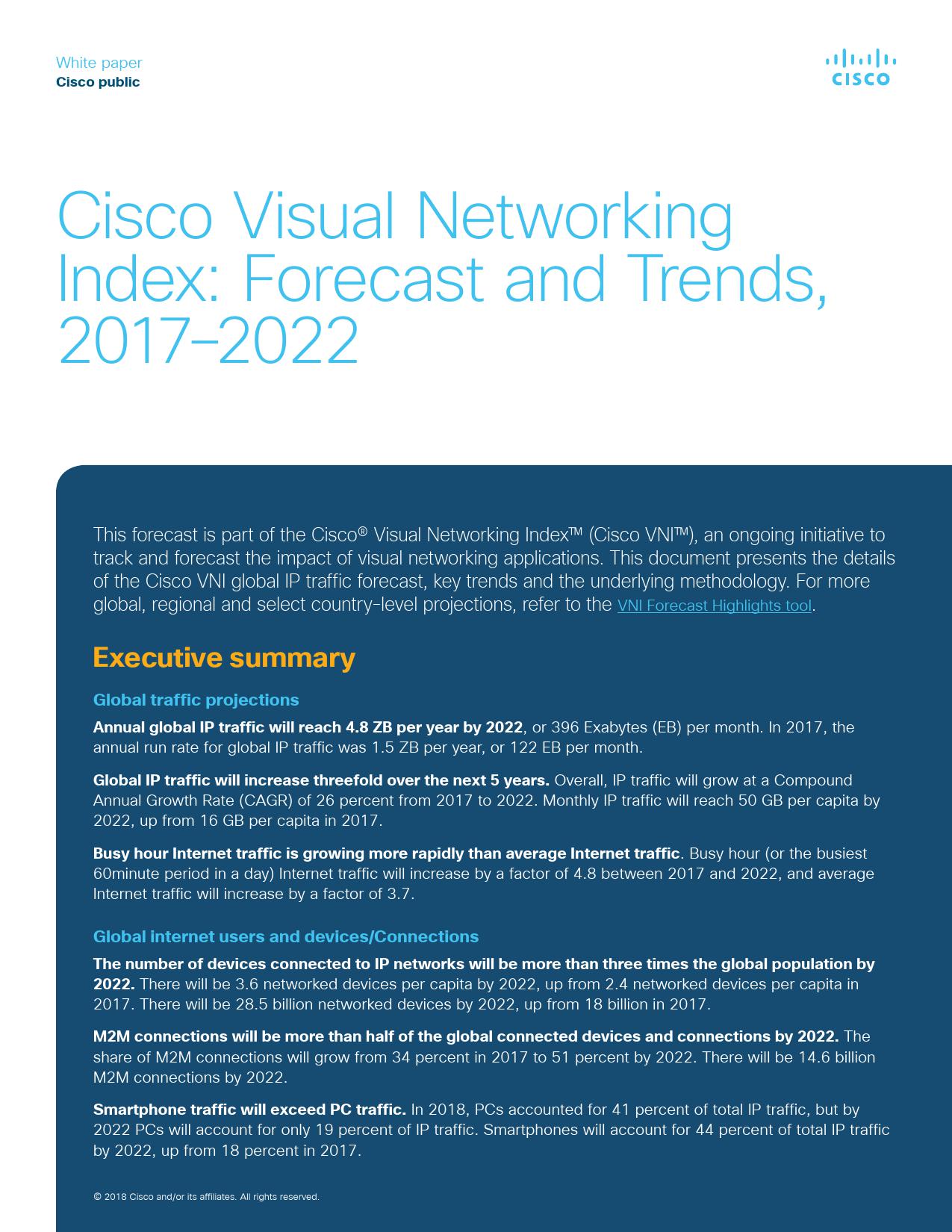 到2022年,互联网流量繁忙时段将比普通时段活跃六倍。从2017至2022年,繁忙时段流量将增加5倍(年复合增长率37%),到2022年达到每秒7.2千兆。普通时段流量将增长近4倍(年复合增长率30%),到2022年达到每秒1千兆。