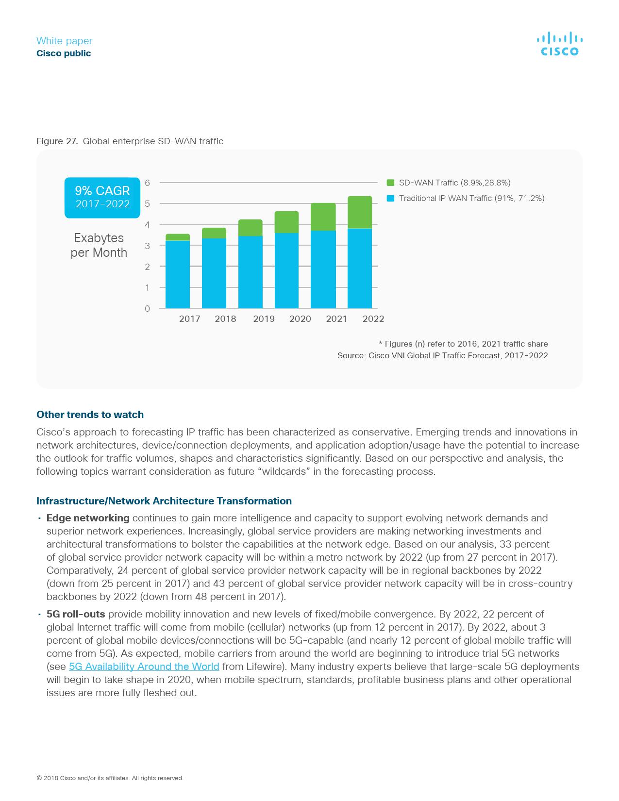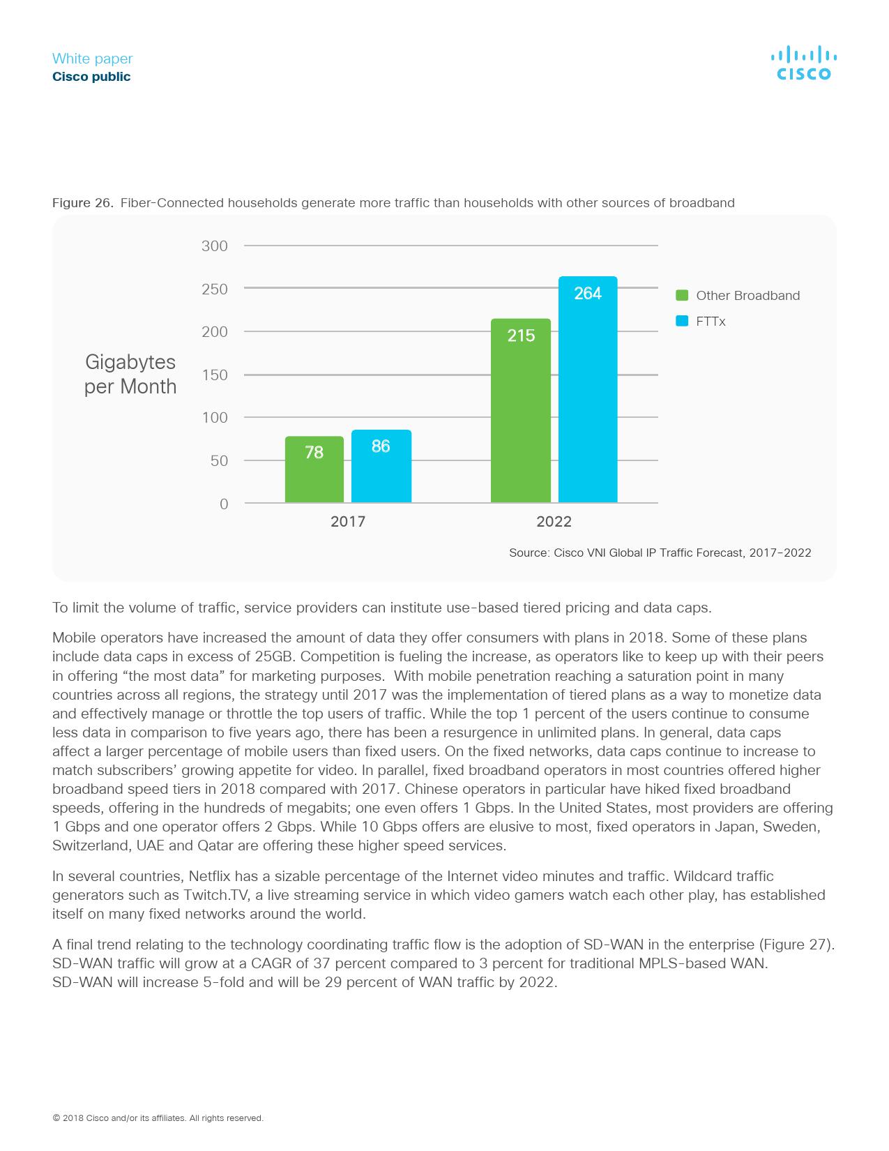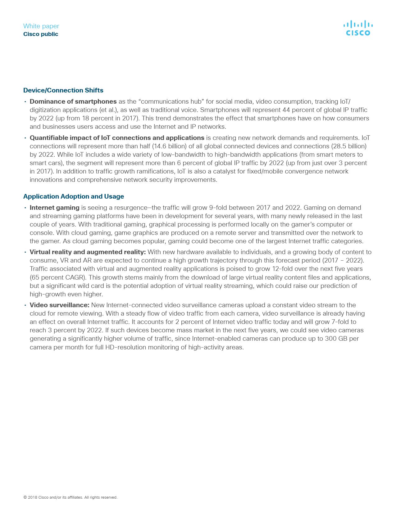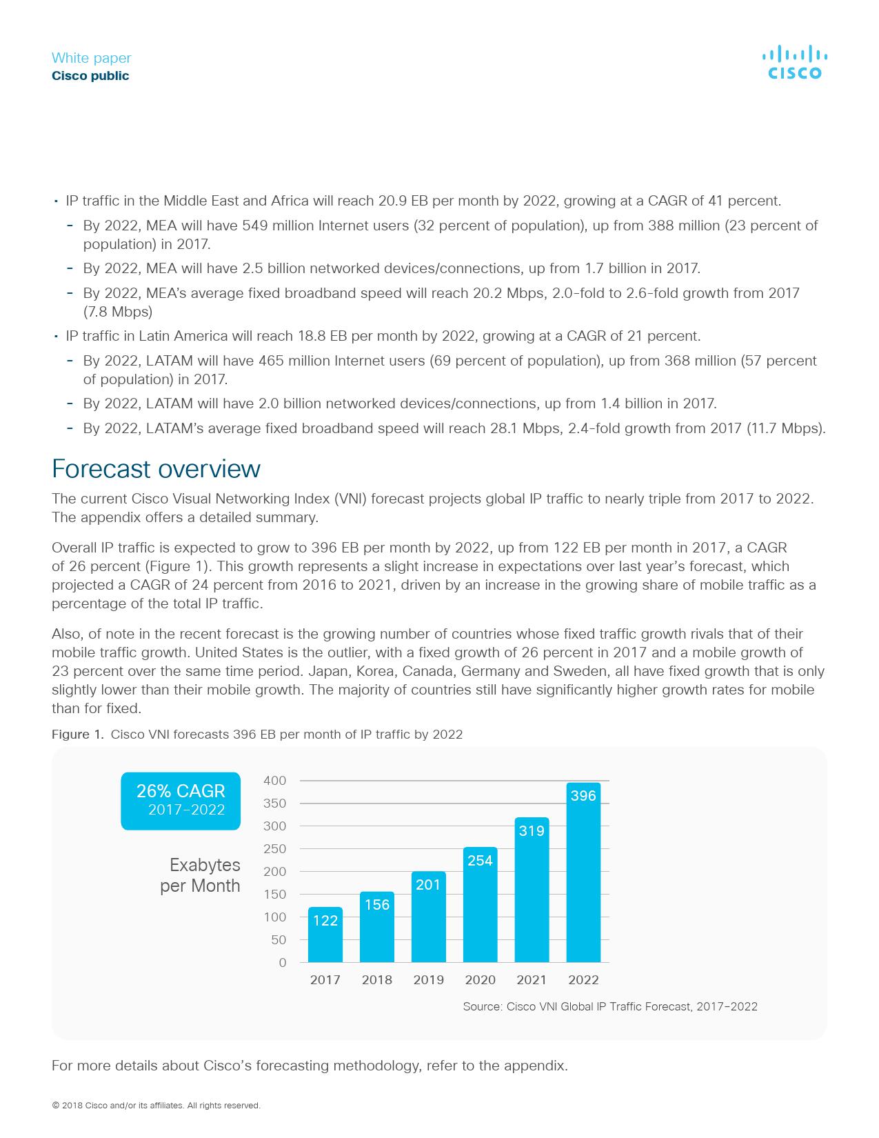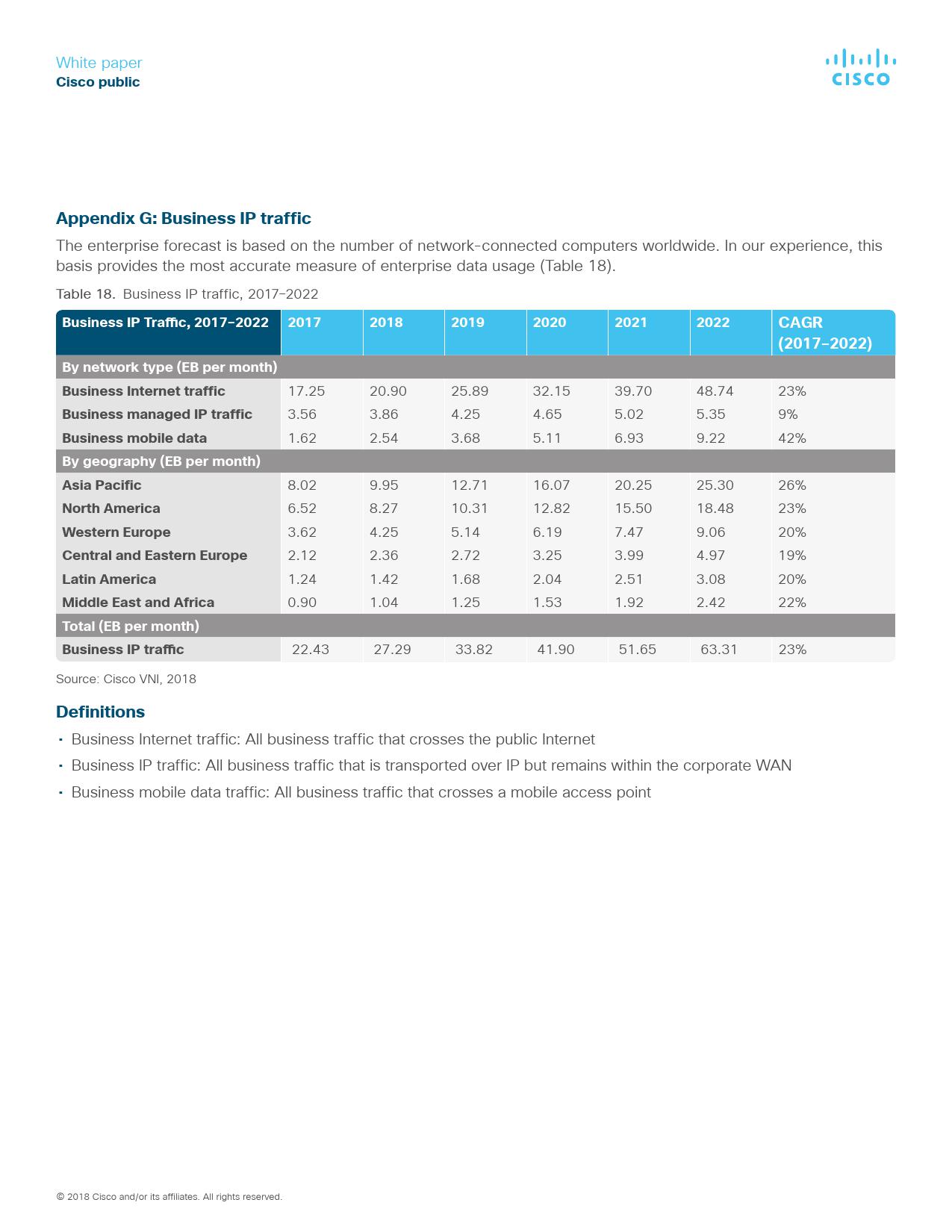 到2022年,互联网流量繁忙时段将比普通时段活跃六倍。从2017至2022年,繁忙时段流量将增加5倍(年复合增长率37%),到2022年达到每秒7.2千兆。普通时段流量将增长近4倍(年复合增长率30%),到2022年达到每秒1千兆。