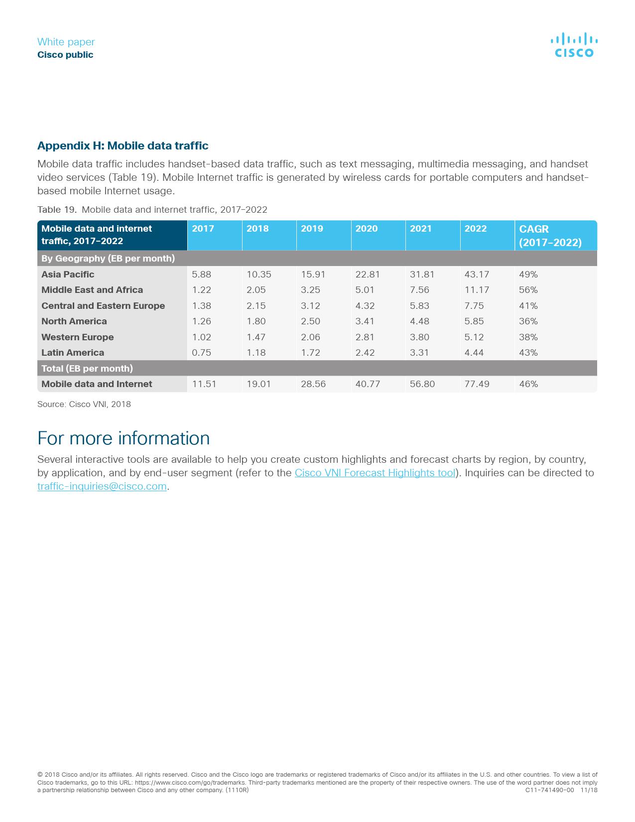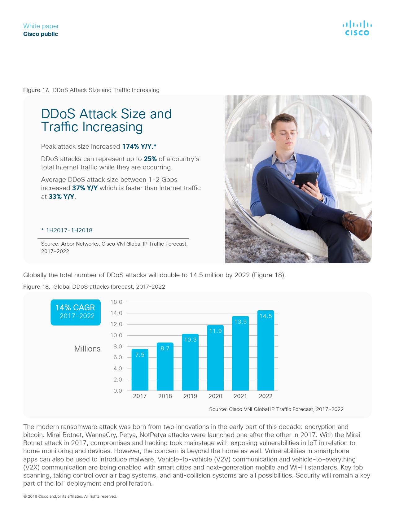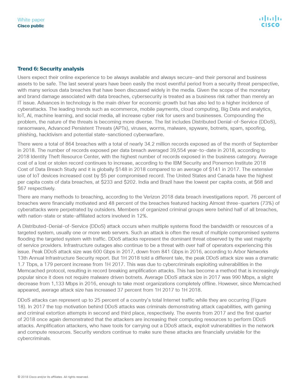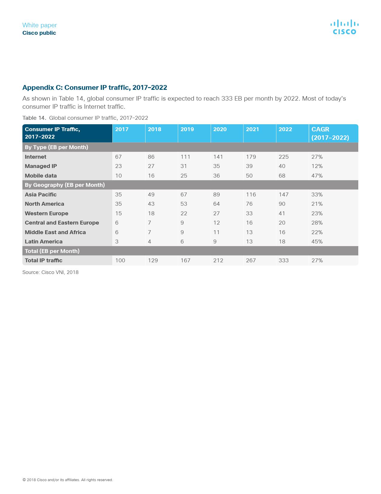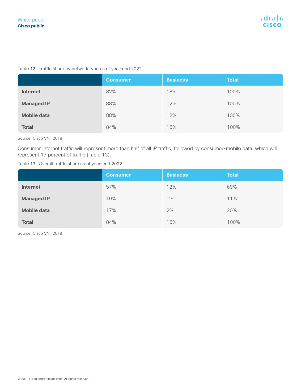 到2022年,互联网流量繁忙时段将比普通时段活跃六倍。从2017至2022年,繁忙时段流量将增加5倍(年复合增长率37%),到2022年达到每秒7.2千兆。普通时段流量将增长近4倍(年复合增长率30%),到2022年达到每秒1千兆。