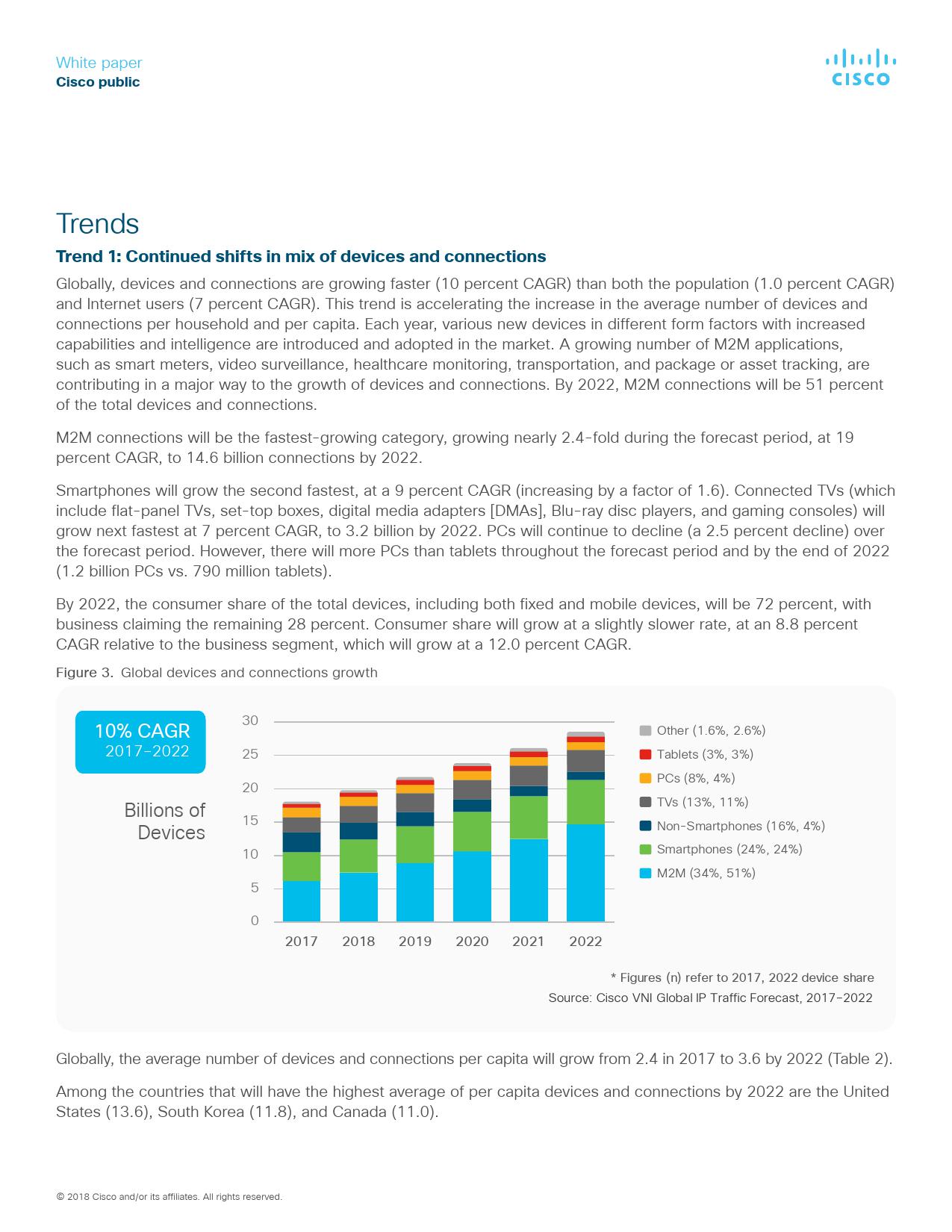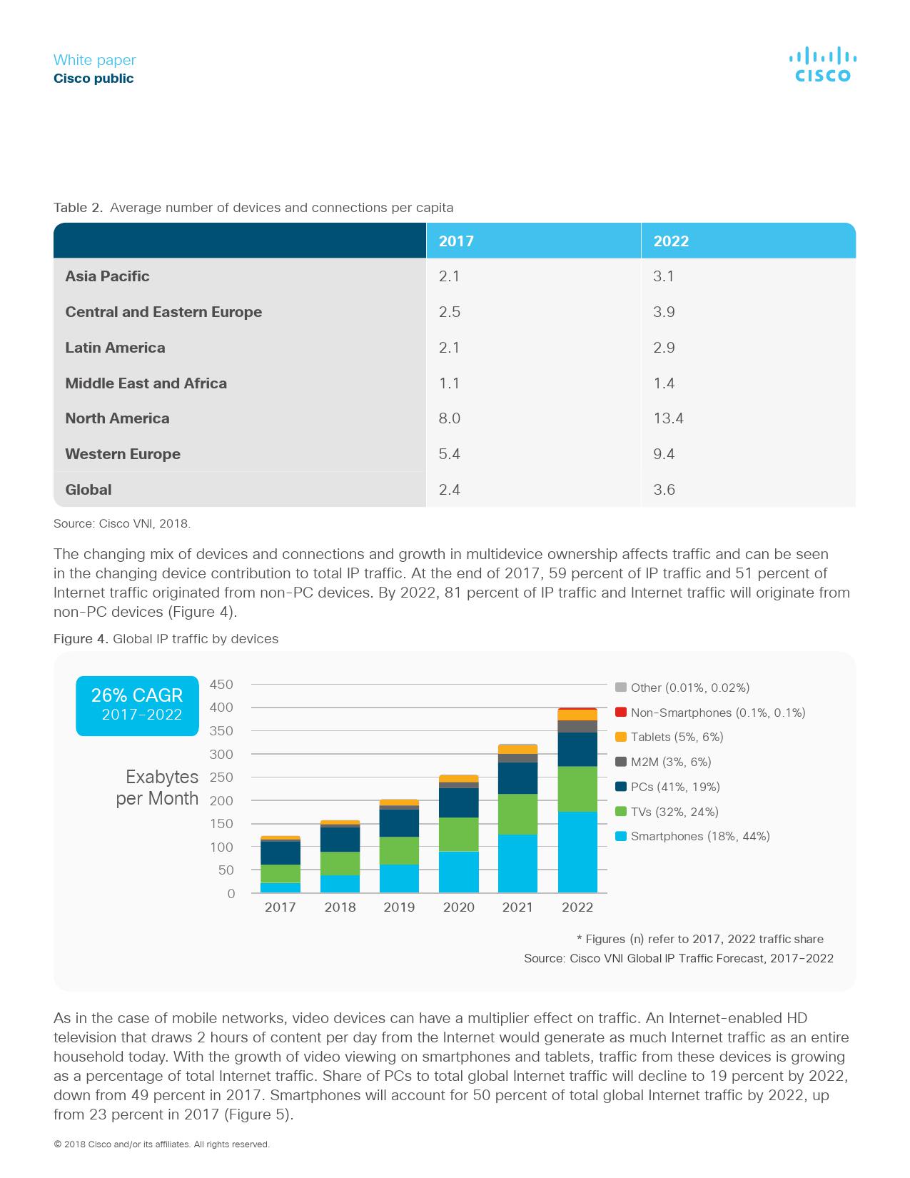 到2022年,全球固定及移动个人设备和连接数将达到285亿,2017年为180亿。人均联网设备数/连接数从2.4台增至3.6台。
