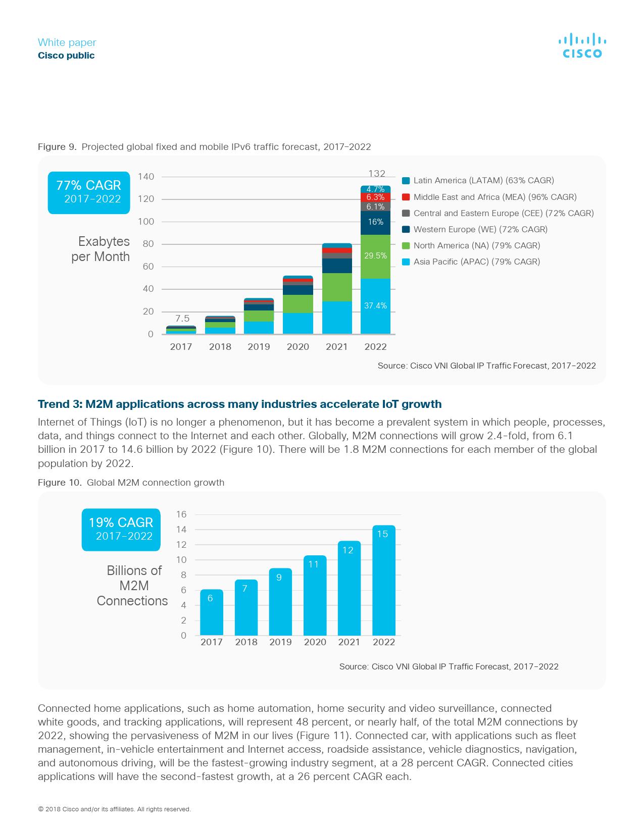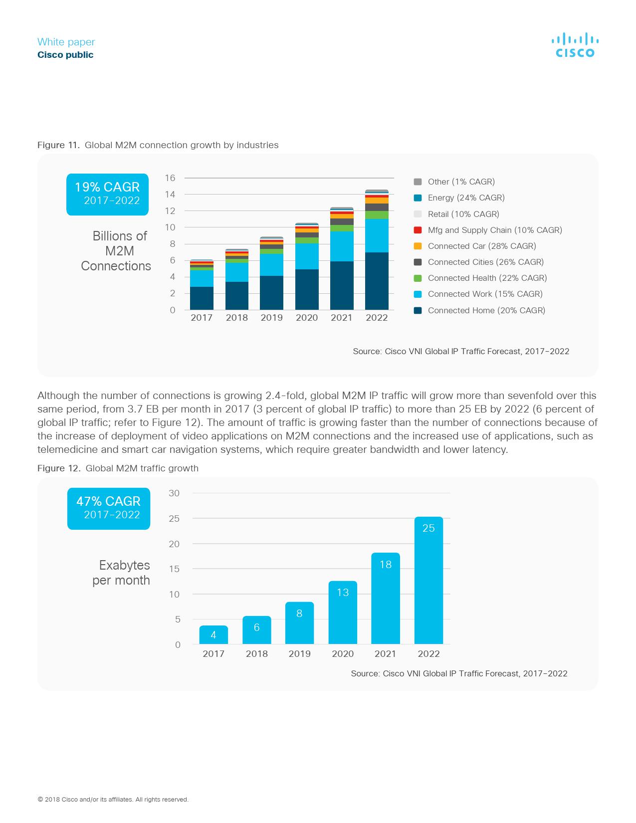 到2022年,逾半数设备和连接将是机器对机器的形式,而2017年这一比例为34%。146亿连接来自智能音箱、固定装置、设备和其他机器,2017年为61亿。