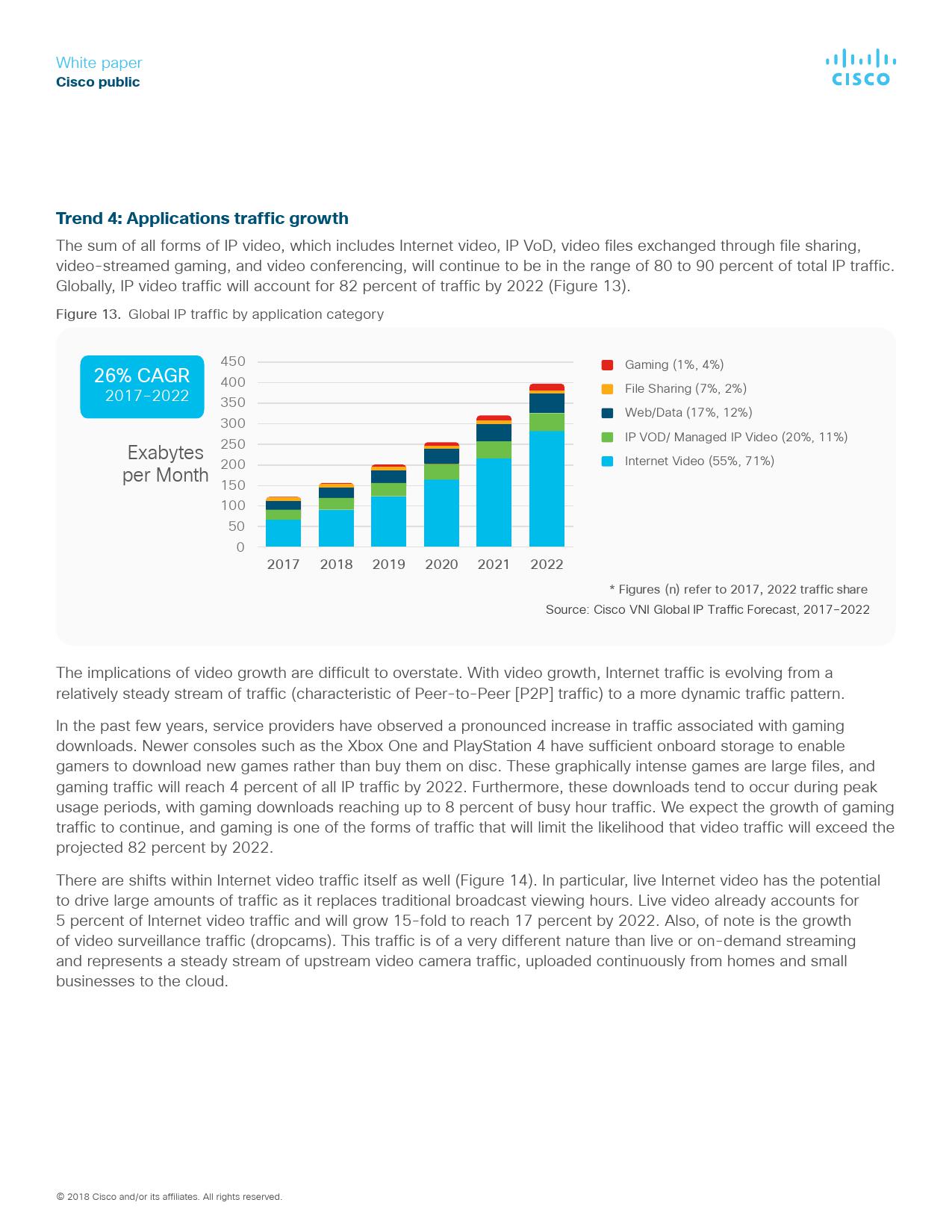 2017至2022年,游戏流量有望增长9倍。到2022年,游戏将占据全部IP流量的4%。