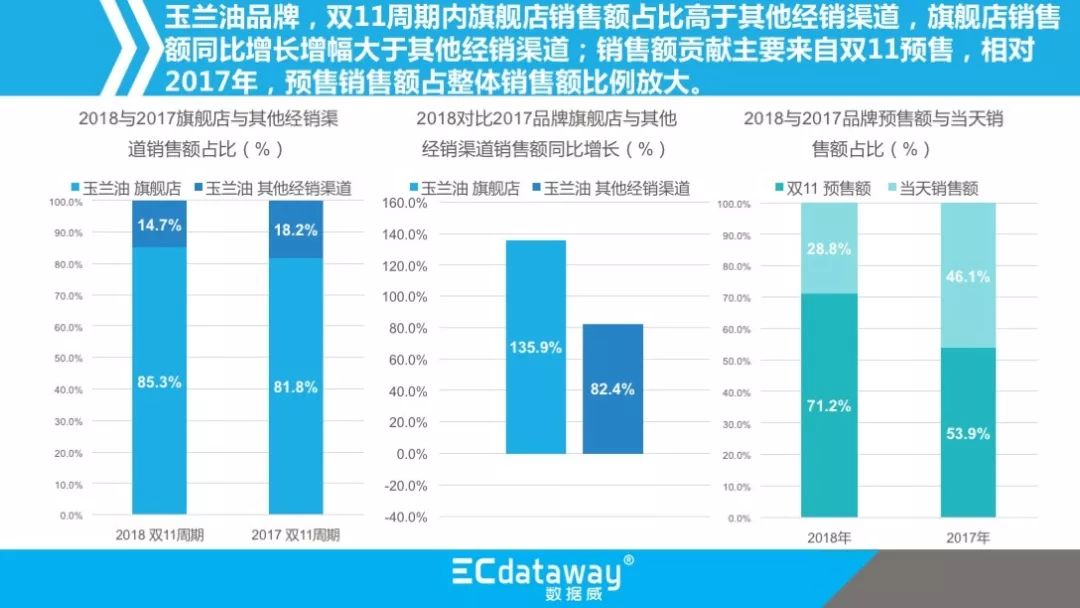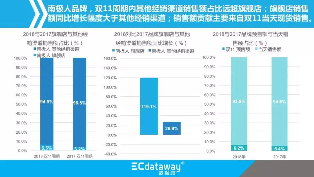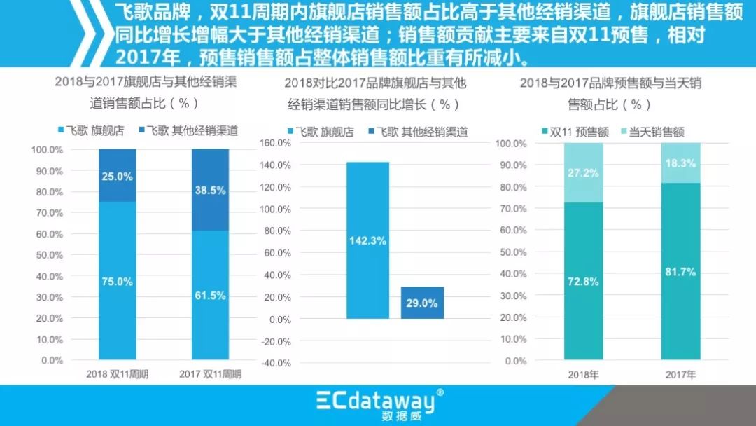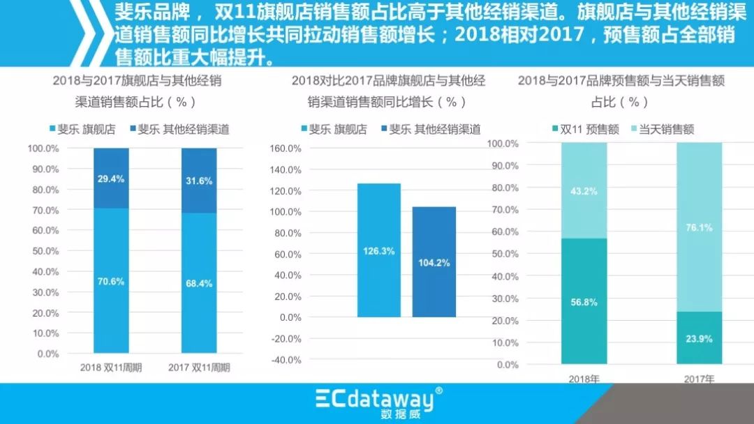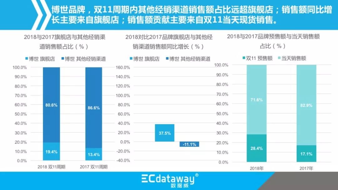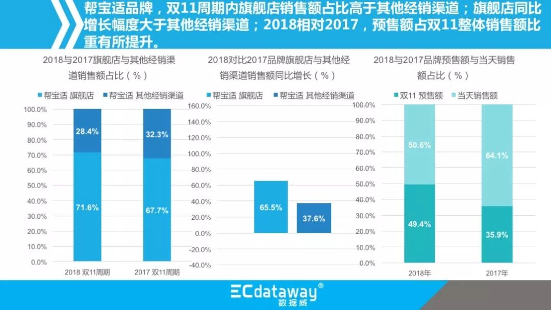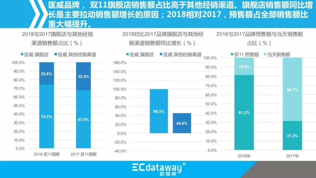 ECdataway :2018年双11天猫九大行业榜单上升品牌研究 【ECdataway 数据威】将2018年与2017年双11天猫平台九大行业TOP榜单进行对比研究,在所有行业榜单中,标出排名上升的品牌与上升名次,并选取两家排名上升幅度较大的品牌(榜单中黄色Highlight),从时间(预售还是当天)和空间(官方旗舰店与其它经销渠道)上分析其增长原因,为品牌方提供进一步研究方向。 1、服饰鞋包行业 南极人品牌,双11周期内其他经销渠道销售额占比远超旗舰店销售额;旗舰店销售额同比增长幅度大于其他经销渠道;销售额贡献主要来自双11当天现货销售。 GXG品牌,双11周期内旗舰店销售额占比高于其他经销渠道,旗舰店销售额同比增长是主要拉动销售额增长的原因;销售额贡献主要来自双11当天现货销售。 2、母婴行业 帮宝适品牌,双11周期内旗舰店销售额占比高于其他经销渠道;旗舰店同比增长幅度大于其他经销渠道;2018相对2017,预售额占双11整体销售额比重有所提升。 戴维贝拉品牌,2018双11旗舰店销售额占全部渠道主要销售份额,且相对2017比重有所放大。旗舰店销售额同比增长是主要拉动销售额增长的原因;销售额贡献大部分来自双11当天现货销售。 3、3C数码行业 飞利浦品牌,双11周期内其他经销渠道销售额高于旗舰店;旗舰店销售额同比增长好于其他经销渠道;销售额贡献主要来自双11当天现货销售,相对2017,预售额占整体销售额比重有所放大。 戴森品牌,双11周期2018相对2017,旗舰店销售额占全部渠道销售额占比有所降低;其他渠道同比增长大幅增加带动整体销售额增长;2018相对2017预售额占整体销售额占比有所增加。 4、家装家饰行业 芝华士品牌, 双11旗舰店销售额占比远高于其他经销渠道。旗舰店销售额同比增长是主要拉动销售额增长的原因;销售额贡献大部分来自双11预售额。 欧派品牌, 2018双11旗舰店销售额占比略低于其他经销渠道,相对2017旗舰店销售额占比有所下降。其他经销渠道大幅增长带动整体销售额增长;以双11当天现货销售为主。 5、美妆个护行业 玉兰油品牌,双11周期内旗舰店销售额占比高于其他经销渠道,旗舰店销售额同比增长增幅大于其他经销渠道;销售额贡献主要来自双11预售,相对2017年,预售销售额占整体销售额比例放大。 HomeFacialPro品牌,双11周期内旗舰店销售额占比高于其他经销渠道;旗舰店销售额同比增长是拉动整体增长的主要因素;2018年预售额占整体销售份额相对2017年有所提升。 6、运动户外行业 匡威品牌, 双11旗舰店销售额占比高于其他经销渠道。旗舰店销售额同比增长是主要拉动销售额增长的原因;2018相对2017,预售额占全部销售额比重大幅提升。 斐乐品牌, 双11旗舰店销售额占比高于其他经销渠道。旗舰店与其他经销渠道销售额同比增长共同拉动销售额增长;2018相对2017,预售额占全部销售额比重大幅提升。 7、食品保健OTC行业 良品铺子品牌, 2018双11旗舰店销售额占比高于其他经销渠道。旗舰店销售额同比增长高于其他经销渠道;以双11当天现货销售为主。 汤臣倍健品牌, 双11周期2018相对2017,旗舰店销售额占整体销售额比重有所增加;销售额同比增长主要来自旗舰店增长;2018预售额占比相对2017占整体销售比重增加。 8、汽配摩托行业 飞歌品牌,双11周期内旗舰店销售额占比高于其他经销渠道,旗舰店销售额同比增长增幅大于其他经销渠道;销售额贡献主要来自双11预售,相对2017年,预售销售额占整体销售额比重有所减小。 博世品牌,双11周期内其他经销渠道销售额占比远超旗舰店;销售额同比增长主要来自旗舰店;销售额贡献主要来自双11当天现货销售。 9、家居清洁行业 维达品牌, 2018双11旗舰店销售额占比高于其他经销渠道,相对2017旗舰店销售额占比有所提升。旗舰店销售额同比增长高于其他经销渠道;以双11当天现货销售为主。 蓝月亮品牌,双11旗舰店销售额占比高于其他经销渠道。旗舰店销售额同比增长略高于其他经销渠道;2018预售额占整体销售额比重相对2017有所提升。 来自: ECdataway数据威 更多阅读:数据威:2020年618大促 全域数据解读——美妆护肤专场ECdataway:2018年Q4手机电商数据解读与趋势分析Initiative:千禧一代最看重品牌的信誉 占比为31%在品牌研究中,对于人工智能而言,创造性思维意味Apptopia:2021年亚马逊在购物应用安装量中排名全球第四尼尔森IQ:2022年中国零售市场回顾与展望阿里研究院:中外电商物流服务比较千亿美金俱乐部的互联网公司在想什么?做什么?疫情下的电商品类研究-从短期销售趋势看市场变化及影响极光大数据:2018年双11数据研究报告昨天,你参与双十一2135亿的大项目了么?交科院&瓜子二手车:2017年度中国主要城市二手车发展报告第九届中国电子商务与物流企业家年会暨农产品电子商务供应链创新发展高峰论坛在北京召开统计局:2014年全社会电子商务交易额突破16万亿利用分析学提升中国的电子商务业绩