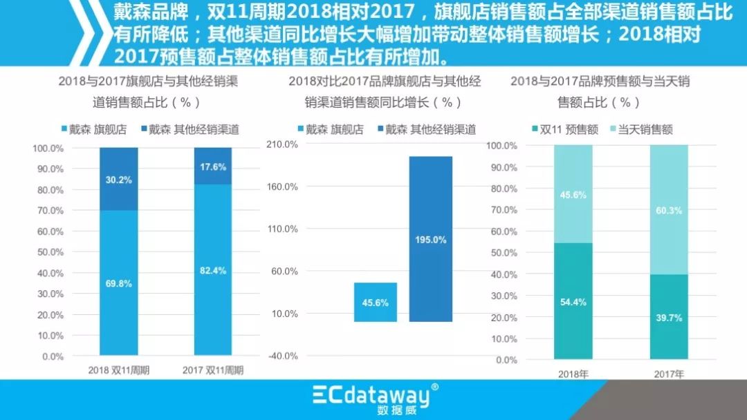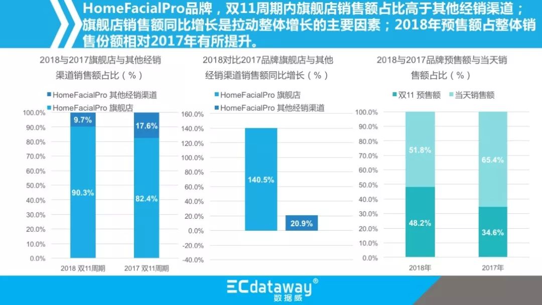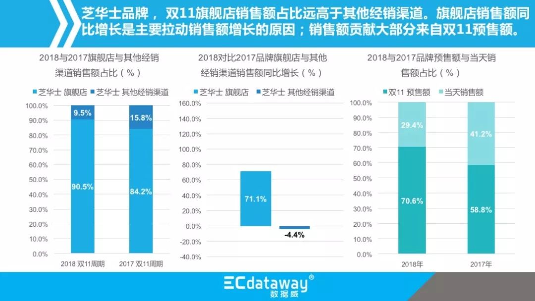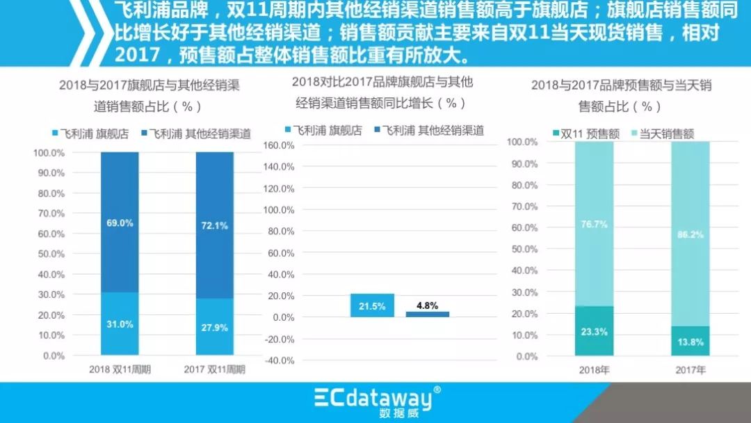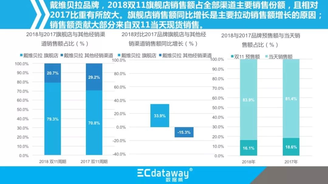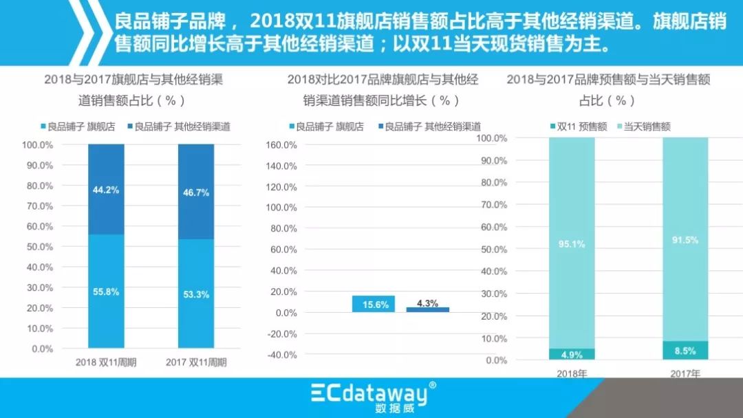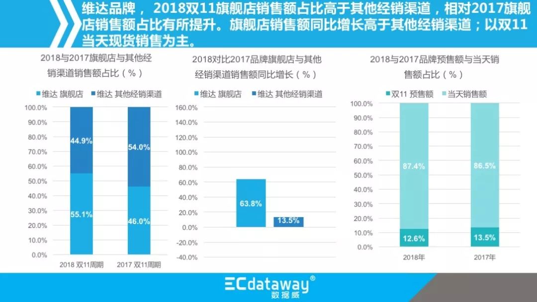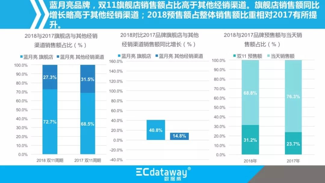 ECdataway :2018年双11天猫九大行业榜单上升品牌研究 【ECdataway 数据威】将2018年与2017年双11天猫平台九大行业TOP榜单进行对比研究,在所有行业榜单中,标出排名上升的品牌与上升名次,并选取两家排名上升幅度较大的品牌(榜单中黄色Highlight),从时间(预售还是当天)和空间(官方旗舰店与其它经销渠道)上分析其增长原因,为品牌方提供进一步研究方向。 1、服饰鞋包行业 南极人品牌,双11周期内其他经销渠道销售额占比远超旗舰店销售额;旗舰店销售额同比增长幅度大于其他经销渠道;销售额贡献主要来自双11当天现货销售。 GXG品牌,双11周期内旗舰店销售额占比高于其他经销渠道,旗舰店销售额同比增长是主要拉动销售额增长的原因;销售额贡献主要来自双11当天现货销售。 2、母婴行业 帮宝适品牌,双11周期内旗舰店销售额占比高于其他经销渠道;旗舰店同比增长幅度大于其他经销渠道;2018相对2017,预售额占双11整体销售额比重有所提升。 戴维贝拉品牌,2018双11旗舰店销售额占全部渠道主要销售份额,且相对2017比重有所放大。旗舰店销售额同比增长是主要拉动销售额增长的原因;销售额贡献大部分来自双11当天现货销售。 3、3C数码行业 飞利浦品牌,双11周期内其他经销渠道销售额高于旗舰店;旗舰店销售额同比增长好于其他经销渠道;销售额贡献主要来自双11当天现货销售,相对2017,预售额占整体销售额比重有所放大。 戴森品牌,双11周期2018相对2017,旗舰店销售额占全部渠道销售额占比有所降低;其他渠道同比增长大幅增加带动整体销售额增长;2018相对2017预售额占整体销售额占比有所增加。 4、家装家饰行业 芝华士品牌, 双11旗舰店销售额占比远高于其他经销渠道。旗舰店销售额同比增长是主要拉动销售额增长的原因;销售额贡献大部分来自双11预售额。 欧派品牌, 2018双11旗舰店销售额占比略低于其他经销渠道,相对2017旗舰店销售额占比有所下降。其他经销渠道大幅增长带动整体销售额增长;以双11当天现货销售为主。 5、美妆个护行业 玉兰油品牌,双11周期内旗舰店销售额占比高于其他经销渠道,旗舰店销售额同比增长增幅大于其他经销渠道;销售额贡献主要来自双11预售,相对2017年,预售销售额占整体销售额比例放大。 HomeFacialPro品牌,双11周期内旗舰店销售额占比高于其他经销渠道;旗舰店销售额同比增长是拉动整体增长的主要因素;2018年预售额占整体销售份额相对2017年有所提升。 6、运动户外行业 匡威品牌, 双11旗舰店销售额占比高于其他经销渠道。旗舰店销售额同比增长是主要拉动销售额增长的原因;2018相对2017,预售额占全部销售额比重大幅提升。 斐乐品牌, 双11旗舰店销售额占比高于其他经销渠道。旗舰店与其他经销渠道销售额同比增长共同拉动销售额增长;2018相对2017,预售额占全部销售额比重大幅提升。 7、食品保健OTC行业 良品铺子品牌, 2018双11旗舰店销售额占比高于其他经销渠道。旗舰店销售额同比增长高于其他经销渠道;以双11当天现货销售为主。 汤臣倍健品牌, 双11周期2018相对2017,旗舰店销售额占整体销售额比重有所增加;销售额同比增长主要来自旗舰店增长;2018预售额占比相对2017占整体销售比重增加。 8、汽配摩托行业 飞歌品牌,双11周期内旗舰店销售额占比高于其他经销渠道,旗舰店销售额同比增长增幅大于其他经销渠道;销售额贡献主要来自双11预售,相对2017年,预售销售额占整体销售额比重有所减小。 博世品牌,双11周期内其他经销渠道销售额占比远超旗舰店;销售额同比增长主要来自旗舰店;销售额贡献主要来自双11当天现货销售。 9、家居清洁行业 维达品牌, 2018双11旗舰店销售额占比高于其他经销渠道,相对2017旗舰店销售额占比有所提升。旗舰店销售额同比增长高于其他经销渠道;以双11当天现货销售为主。 蓝月亮品牌,双11旗舰店销售额占比高于其他经销渠道。旗舰店销售额同比增长略高于其他经销渠道;2018预售额占整体销售额比重相对2017有所提升。 来自: ECdataway数据威 更多阅读:数据威:2020年618大促 全域数据解读——美妆护肤专场ECdataway:2018年Q4手机电商数据解读与趋势分析Initiative:千禧一代最看重品牌的信誉 占比为31%在品牌研究中,对于人工智能而言,创造性思维意味Apptopia:2021年亚马逊在购物应用安装量中排名全球第四尼尔森IQ:2022年中国零售市场回顾与展望阿里研究院:中外电商物流服务比较千亿美金俱乐部的互联网公司在想什么?做什么?疫情下的电商品类研究-从短期销售趋势看市场变化及影响极光大数据:2018年双11数据研究报告昨天,你参与双十一2135亿的大项目了么?交科院&瓜子二手车:2017年度中国主要城市二手车发展报告第九届中国电子商务与物流企业家年会暨农产品电子商务供应链创新发展高峰论坛在北京召开统计局:2014年全社会电子商务交易额突破16万亿利用分析学提升中国的电子商务业绩