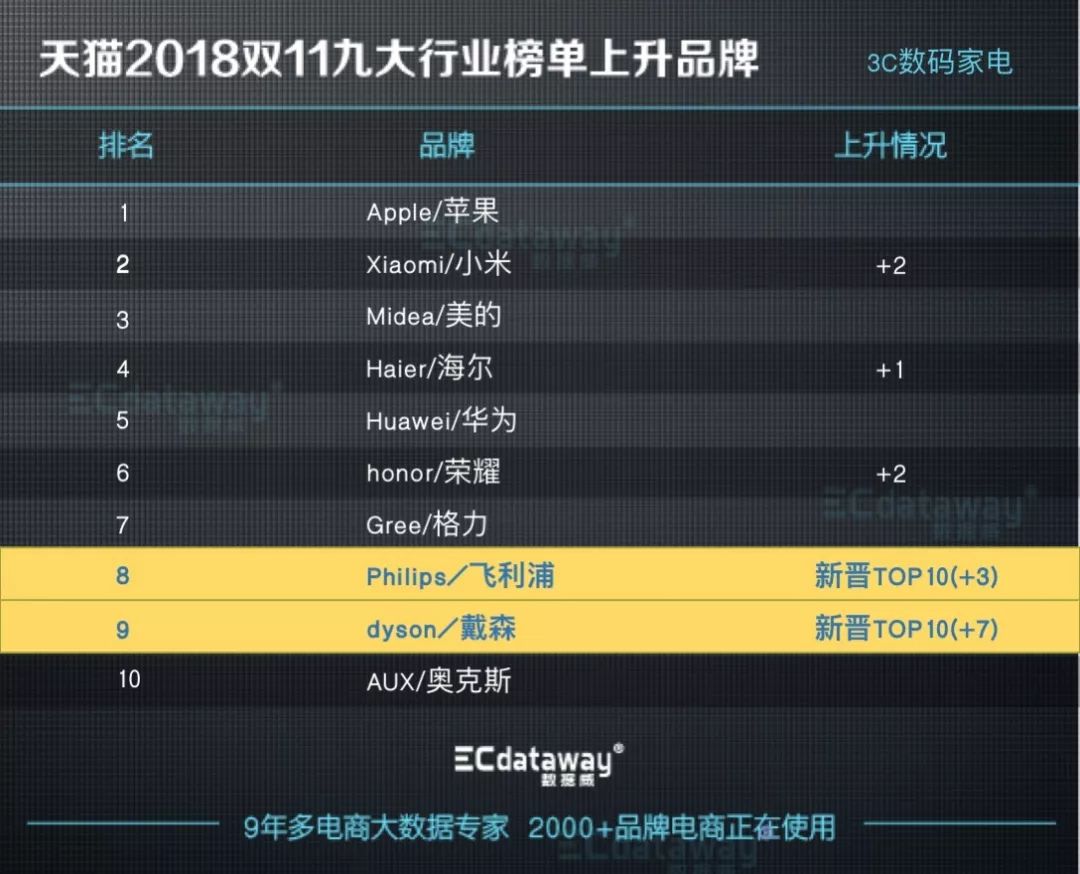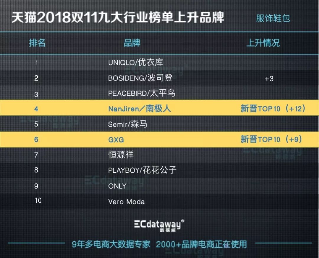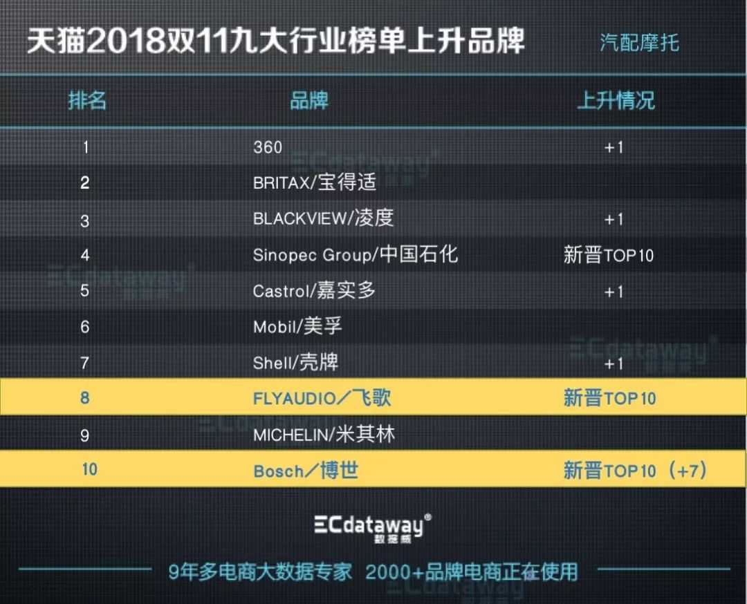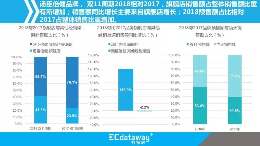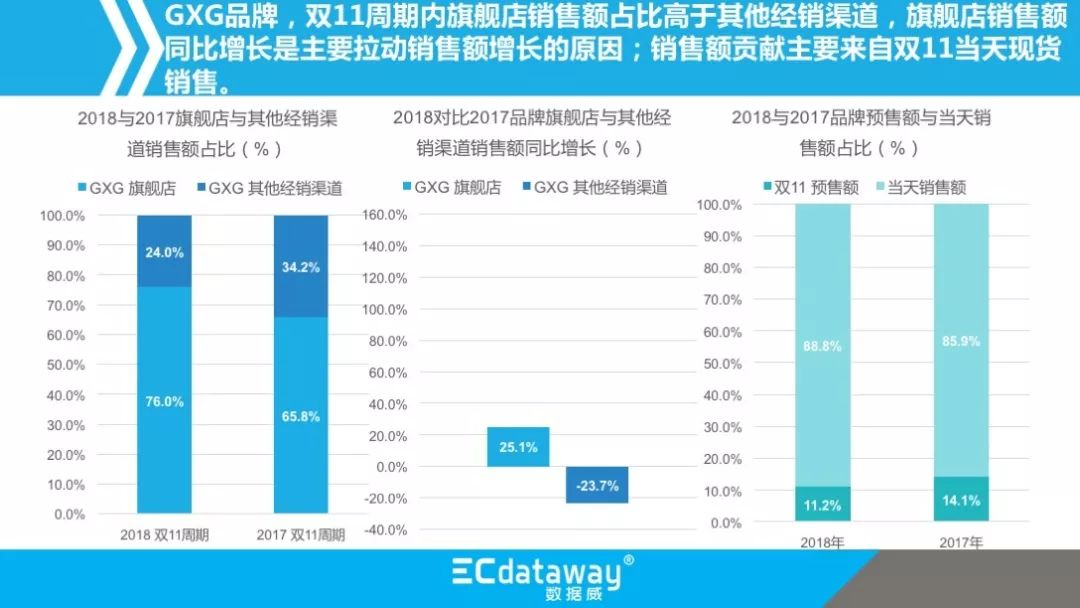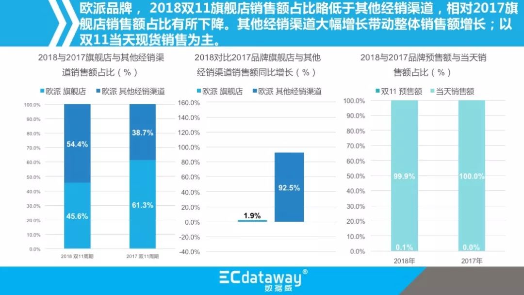 ECdataway :2018年双11天猫九大行业榜单上升品牌研究 【ECdataway 数据威】将2018年与2017年双11天猫平台九大行业TOP榜单进行对比研究,在所有行业榜单中,标出排名上升的品牌与上升名次,并选取两家排名上升幅度较大的品牌(榜单中黄色Highlight),从时间(预售还是当天)和空间(官方旗舰店与其它经销渠道)上分析其增长原因,为品牌方提供进一步研究方向。 1、服饰鞋包行业 南极人品牌,双11周期内其他经销渠道销售额占比远超旗舰店销售额;旗舰店销售额同比增长幅度大于其他经销渠道;销售额贡献主要来自双11当天现货销售。 GXG品牌,双11周期内旗舰店销售额占比高于其他经销渠道,旗舰店销售额同比增长是主要拉动销售额增长的原因;销售额贡献主要来自双11当天现货销售。 2、母婴行业 帮宝适品牌,双11周期内旗舰店销售额占比高于其他经销渠道;旗舰店同比增长幅度大于其他经销渠道;2018相对2017,预售额占双11整体销售额比重有所提升。 戴维贝拉品牌,2018双11旗舰店销售额占全部渠道主要销售份额,且相对2017比重有所放大。旗舰店销售额同比增长是主要拉动销售额增长的原因;销售额贡献大部分来自双11当天现货销售。 3、3C数码行业 飞利浦品牌,双11周期内其他经销渠道销售额高于旗舰店;旗舰店销售额同比增长好于其他经销渠道;销售额贡献主要来自双11当天现货销售,相对2017,预售额占整体销售额比重有所放大。 戴森品牌,双11周期2018相对2017,旗舰店销售额占全部渠道销售额占比有所降低;其他渠道同比增长大幅增加带动整体销售额增长;2018相对2017预售额占整体销售额占比有所增加。 4、家装家饰行业 芝华士品牌, 双11旗舰店销售额占比远高于其他经销渠道。旗舰店销售额同比增长是主要拉动销售额增长的原因;销售额贡献大部分来自双11预售额。 欧派品牌, 2018双11旗舰店销售额占比略低于其他经销渠道,相对2017旗舰店销售额占比有所下降。其他经销渠道大幅增长带动整体销售额增长;以双11当天现货销售为主。 5、美妆个护行业 玉兰油品牌,双11周期内旗舰店销售额占比高于其他经销渠道,旗舰店销售额同比增长增幅大于其他经销渠道;销售额贡献主要来自双11预售,相对2017年,预售销售额占整体销售额比例放大。 HomeFacialPro品牌,双11周期内旗舰店销售额占比高于其他经销渠道;旗舰店销售额同比增长是拉动整体增长的主要因素;2018年预售额占整体销售份额相对2017年有所提升。 6、运动户外行业 匡威品牌, 双11旗舰店销售额占比高于其他经销渠道。旗舰店销售额同比增长是主要拉动销售额增长的原因;2018相对2017,预售额占全部销售额比重大幅提升。 斐乐品牌, 双11旗舰店销售额占比高于其他经销渠道。旗舰店与其他经销渠道销售额同比增长共同拉动销售额增长;2018相对2017,预售额占全部销售额比重大幅提升。 7、食品保健OTC行业 良品铺子品牌, 2018双11旗舰店销售额占比高于其他经销渠道。旗舰店销售额同比增长高于其他经销渠道;以双11当天现货销售为主。 汤臣倍健品牌, 双11周期2018相对2017,旗舰店销售额占整体销售额比重有所增加;销售额同比增长主要来自旗舰店增长;2018预售额占比相对2017占整体销售比重增加。 8、汽配摩托行业 飞歌品牌,双11周期内旗舰店销售额占比高于其他经销渠道,旗舰店销售额同比增长增幅大于其他经销渠道;销售额贡献主要来自双11预售,相对2017年,预售销售额占整体销售额比重有所减小。 博世品牌,双11周期内其他经销渠道销售额占比远超旗舰店;销售额同比增长主要来自旗舰店;销售额贡献主要来自双11当天现货销售。 9、家居清洁行业 维达品牌, 2018双11旗舰店销售额占比高于其他经销渠道,相对2017旗舰店销售额占比有所提升。旗舰店销售额同比增长高于其他经销渠道;以双11当天现货销售为主。 蓝月亮品牌,双11旗舰店销售额占比高于其他经销渠道。旗舰店销售额同比增长略高于其他经销渠道;2018预售额占整体销售额比重相对2017有所提升。 来自: ECdataway数据威 更多阅读:数据威:2020年618大促 全域数据解读——美妆护肤专场ECdataway:2018年Q4手机电商数据解读与趋势分析Initiative:千禧一代最看重品牌的信誉 占比为31%在品牌研究中,对于人工智能而言,创造性思维意味Apptopia:2021年亚马逊在购物应用安装量中排名全球第四尼尔森IQ:2022年中国零售市场回顾与展望阿里研究院:中外电商物流服务比较千亿美金俱乐部的互联网公司在想什么?做什么?疫情下的电商品类研究-从短期销售趋势看市场变化及影响极光大数据:2018年双11数据研究报告昨天,你参与双十一2135亿的大项目了么?交科院&瓜子二手车:2017年度中国主要城市二手车发展报告第九届中国电子商务与物流企业家年会暨农产品电子商务供应链创新发展高峰论坛在北京召开统计局:2014年全社会电子商务交易额突破16万亿利用分析学提升中国的电子商务业绩