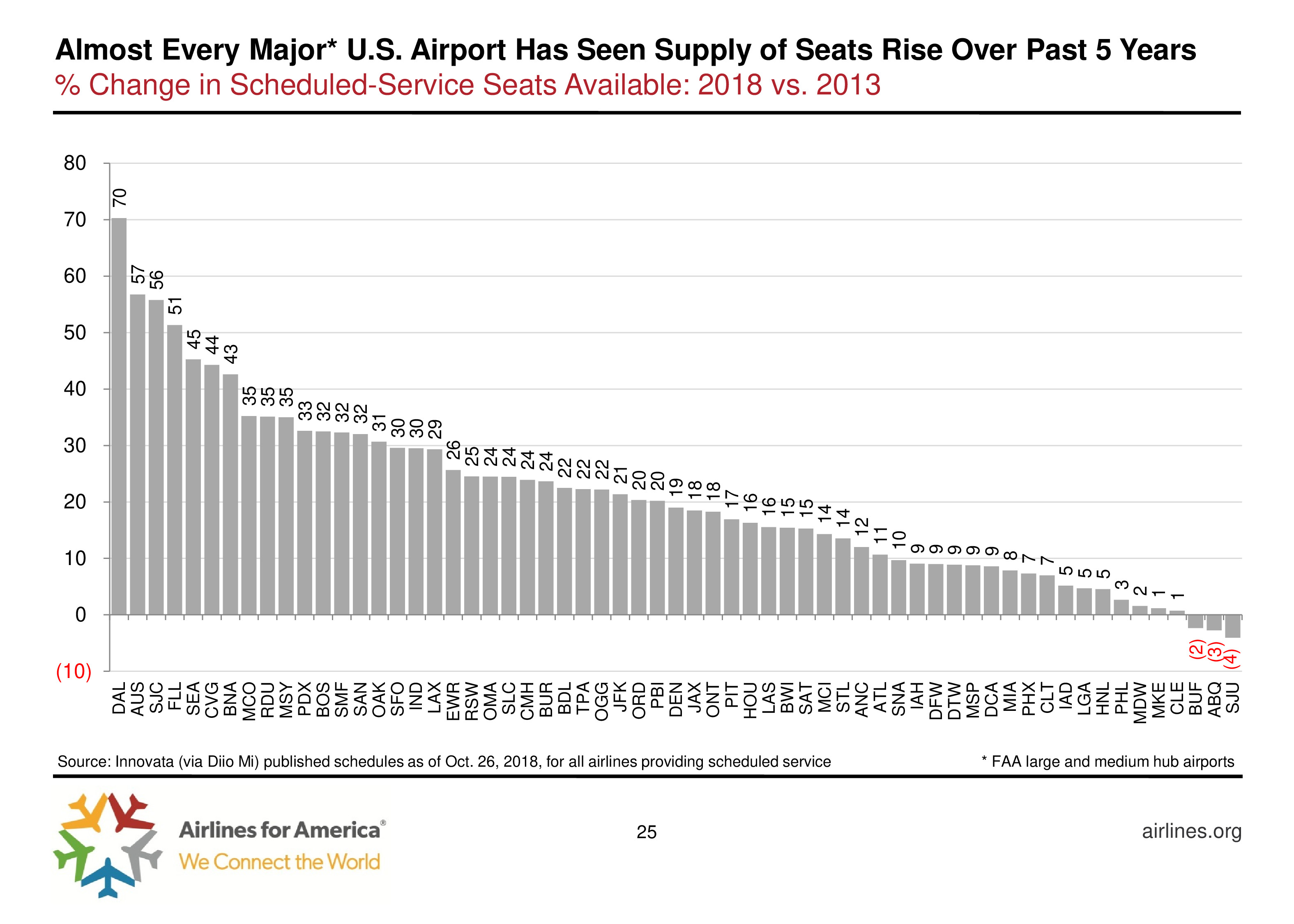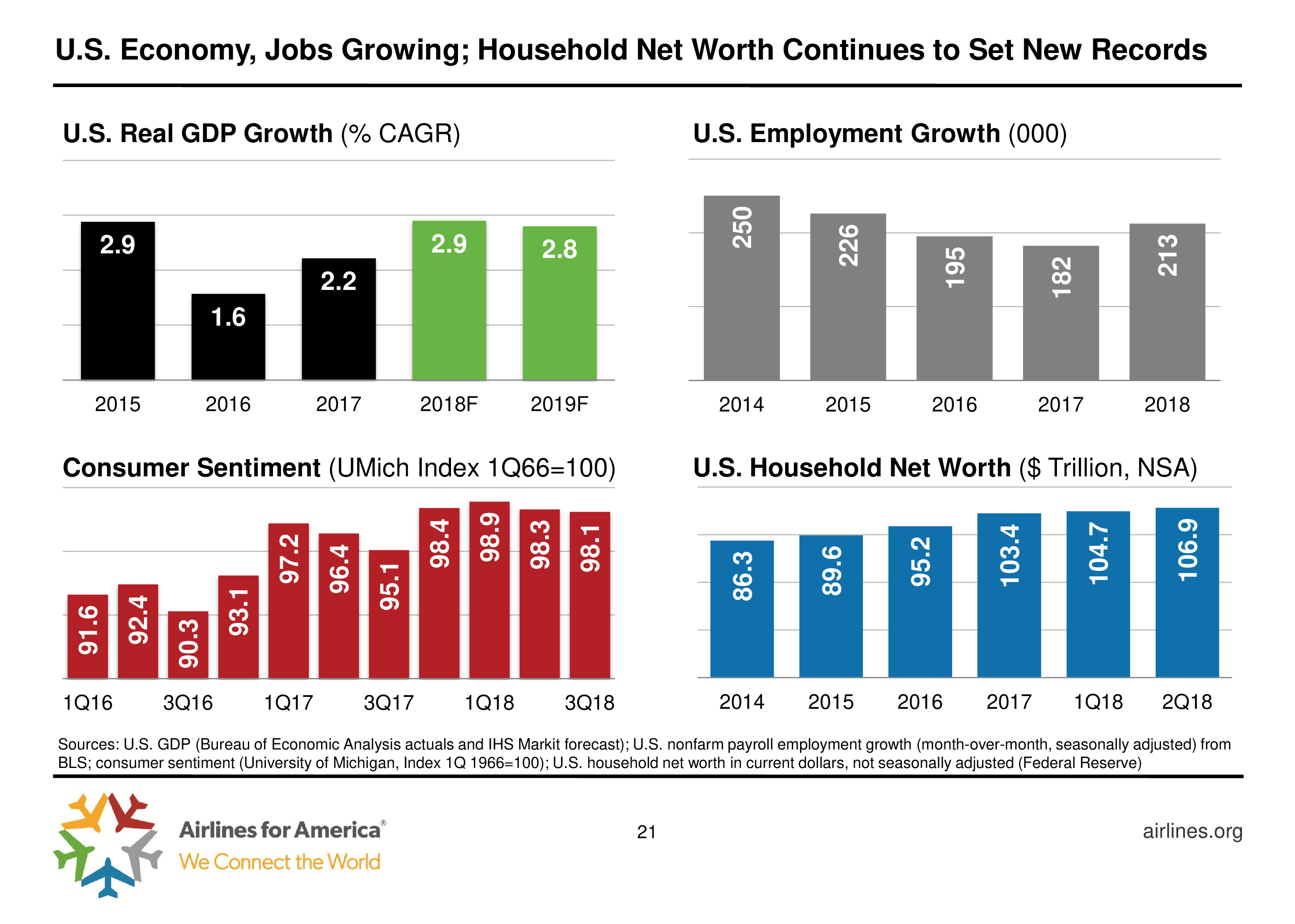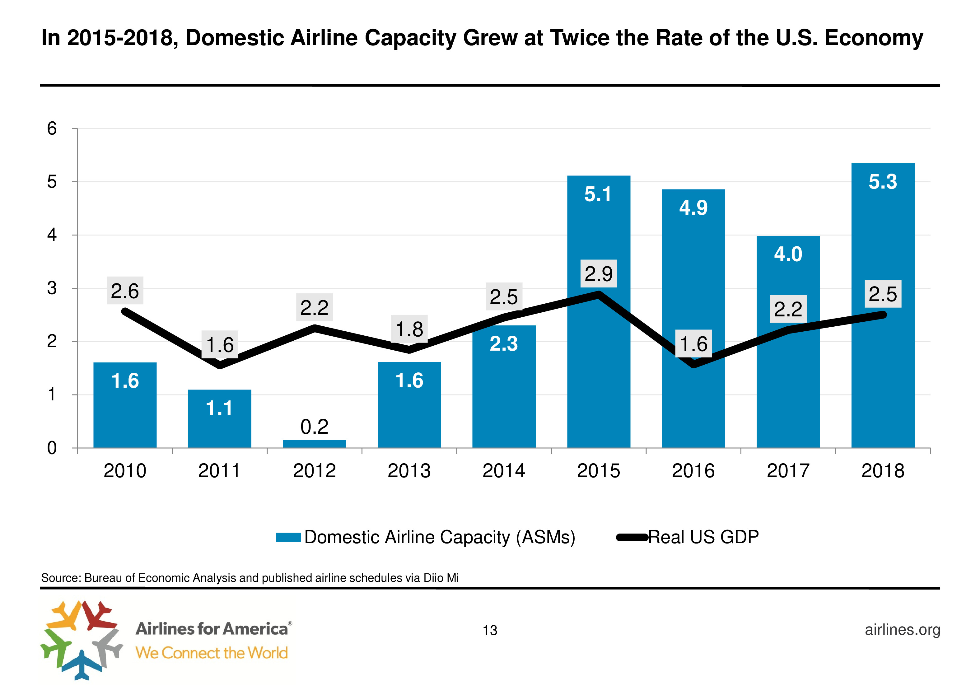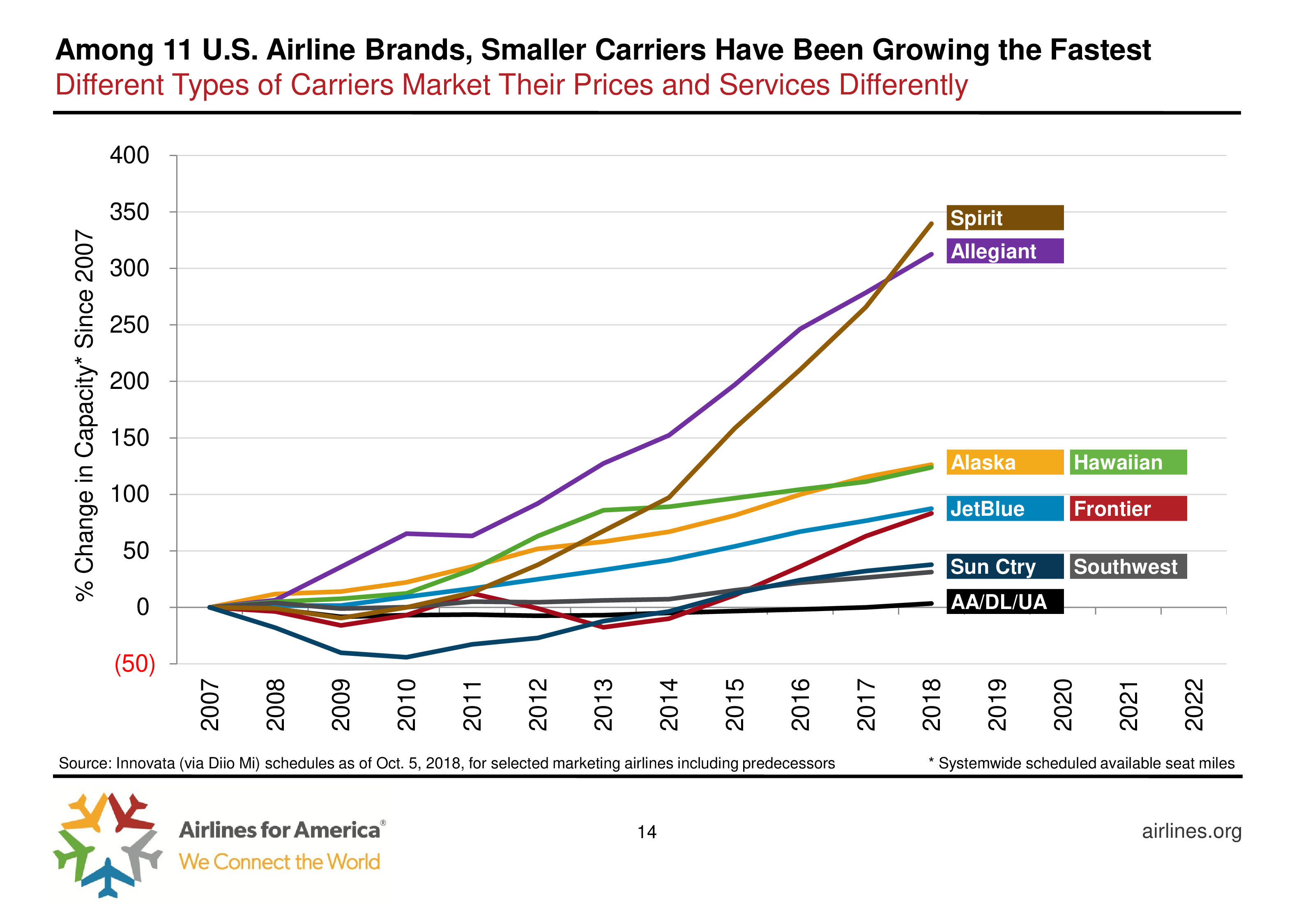 2015 – 2018年,美国国内航线运力增长率是其经济增长率的两倍。但是,小型航空公司增长比大型更快,例如Spirit和Allegiant。
