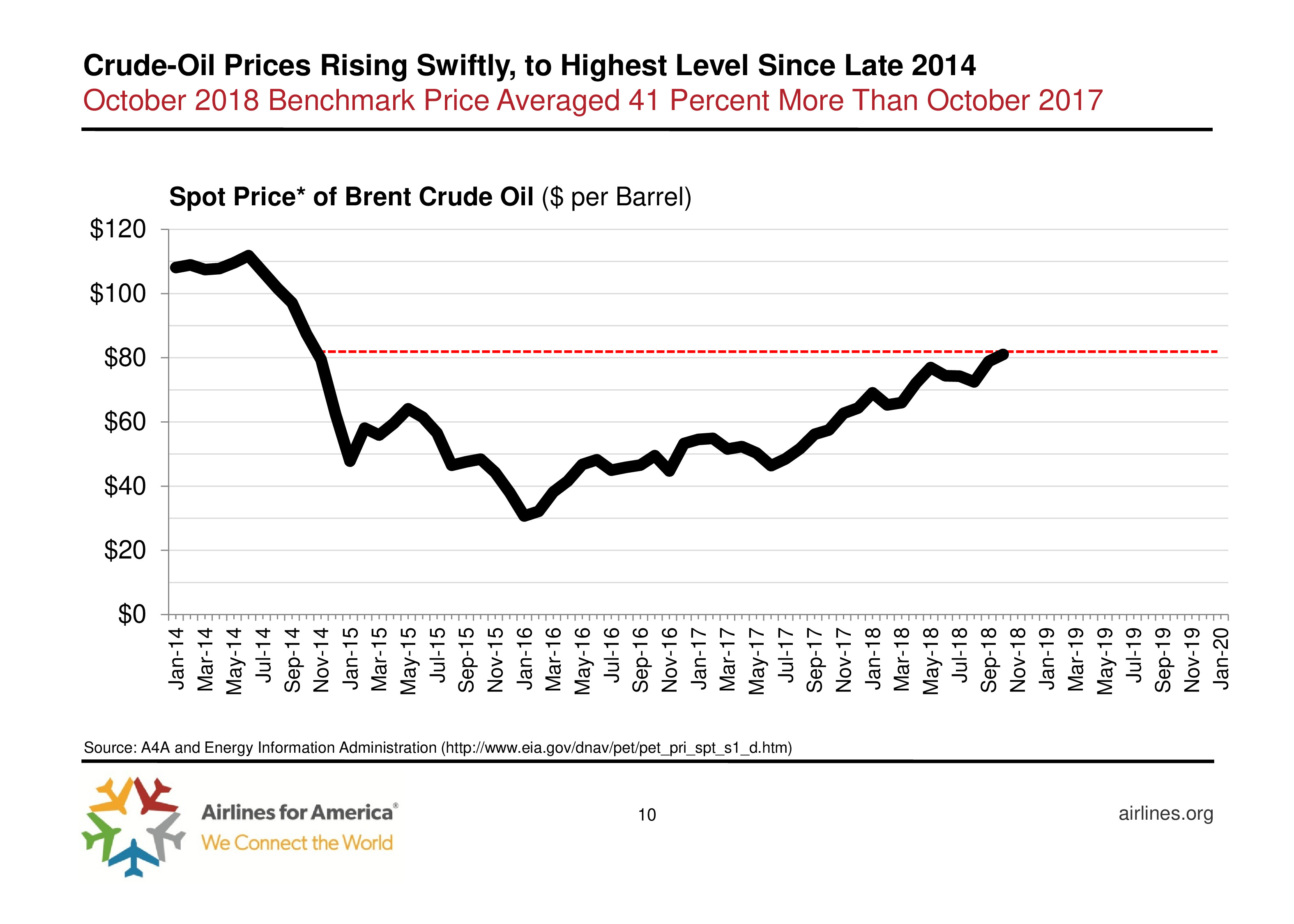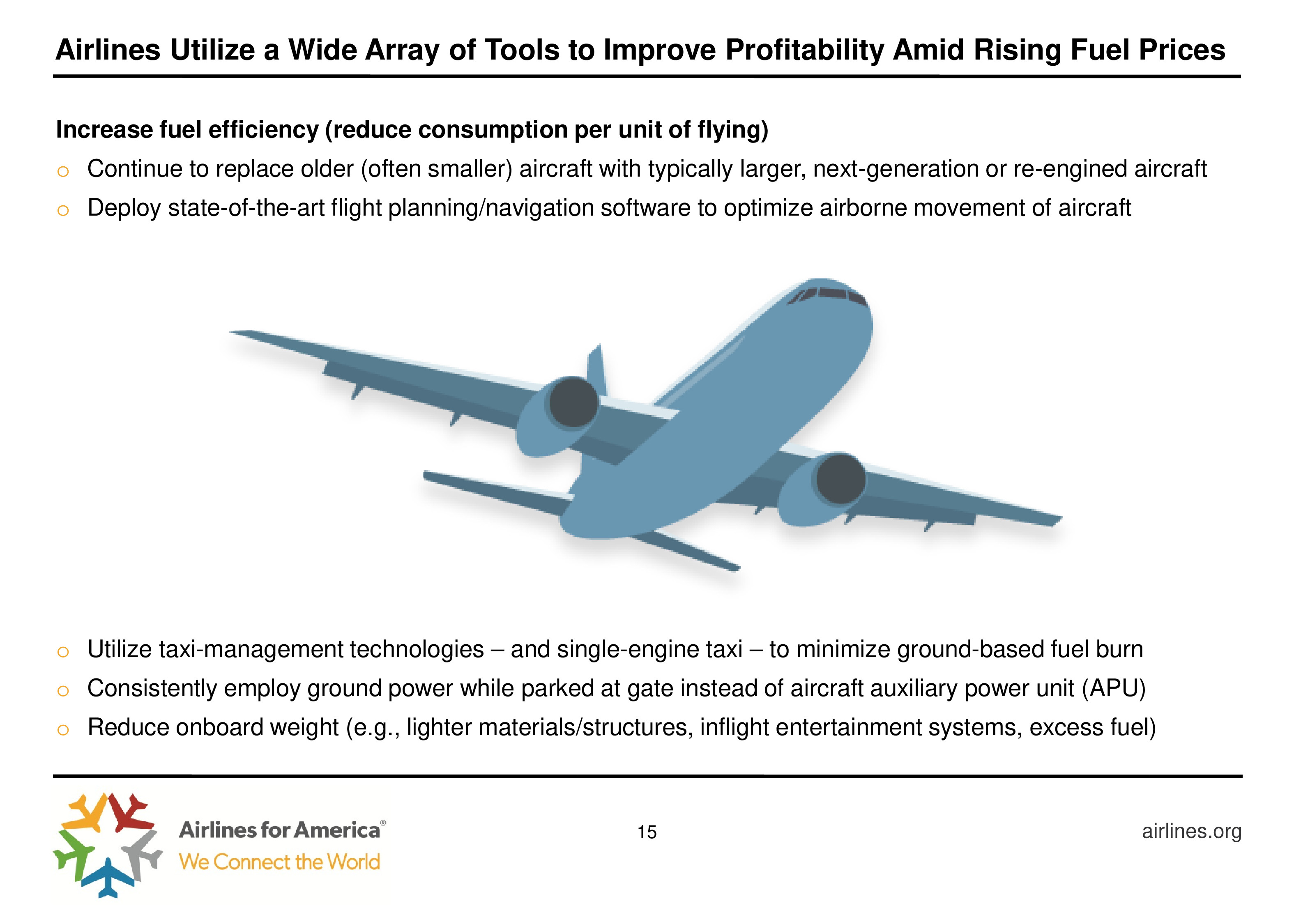 2018年前9个月美国航空公司运营支出增长比收入更快,这说明其盈利能力正在下降。事实上,航空业的盈利能力在各行业中排在倒数第三位,不足星巴克盈利能力的1/3。从数据来看,运营成本每增长1.00美元,航空业能获得0.68美元的收入,仅燃油九站57%的成本增长。2018年10月原油价格比去年同期高41%。为了提高盈利能力,航空公司想尽了一切办法,如更换陈旧的大型飞机,部署导航软件优化线路等。
