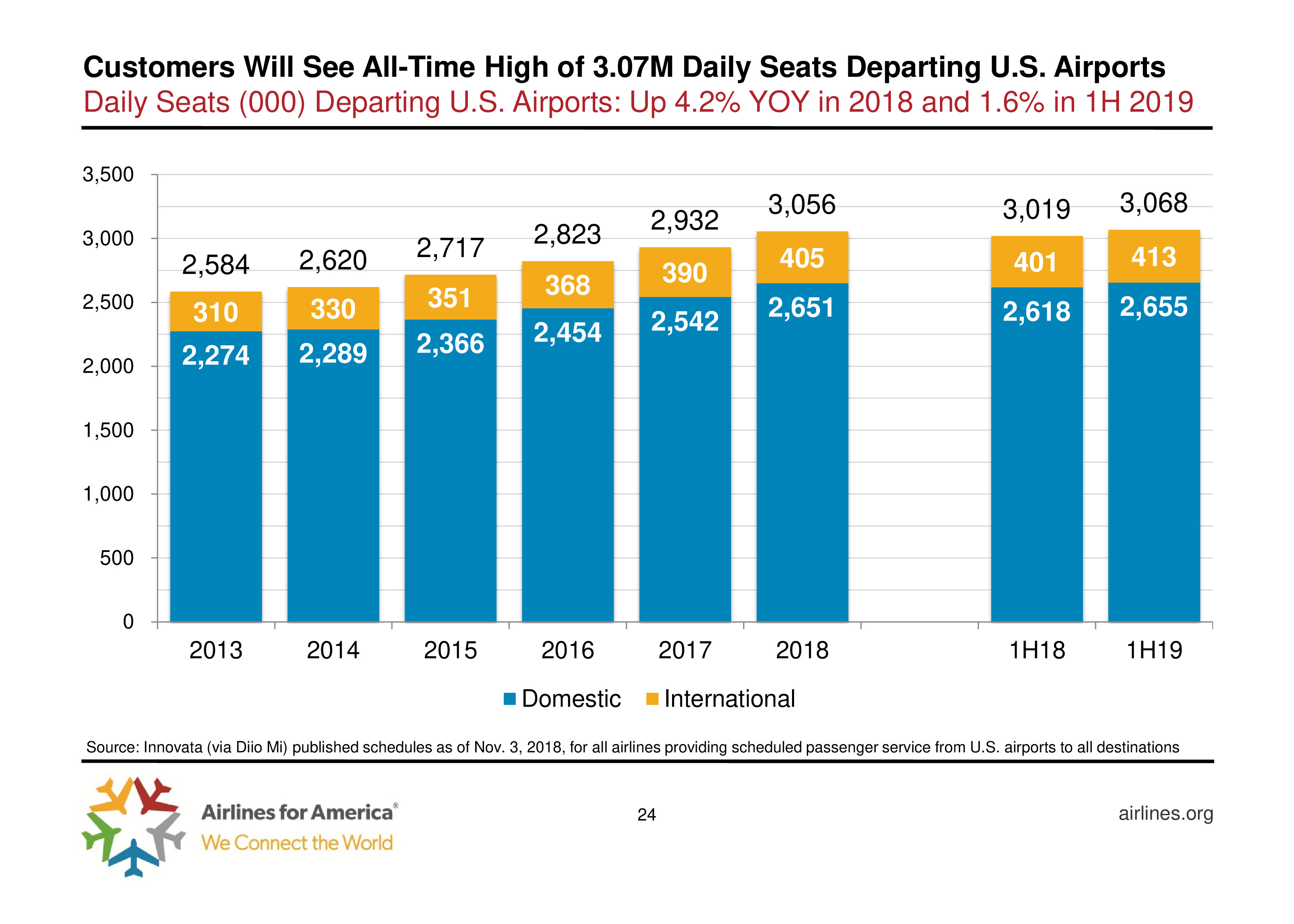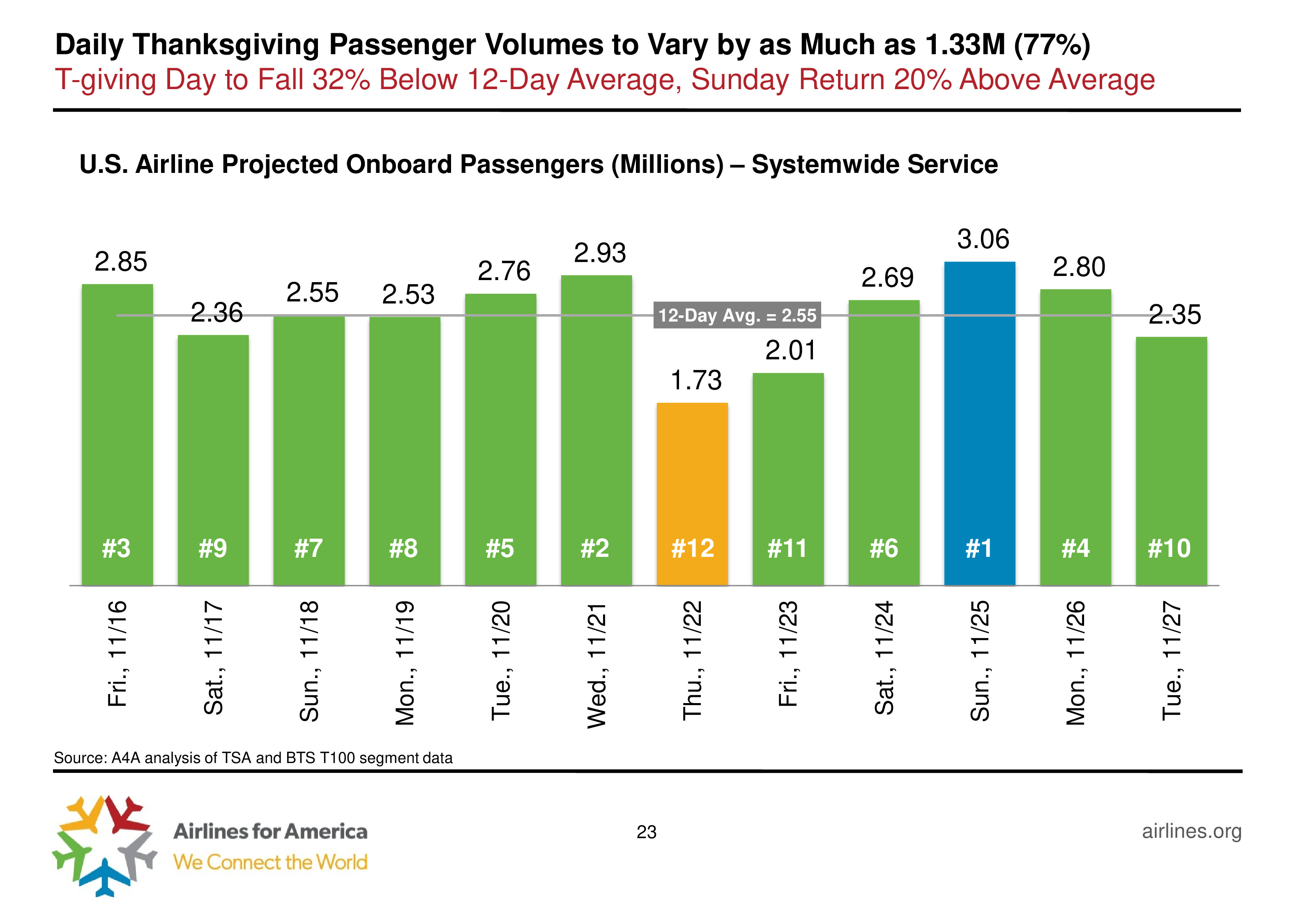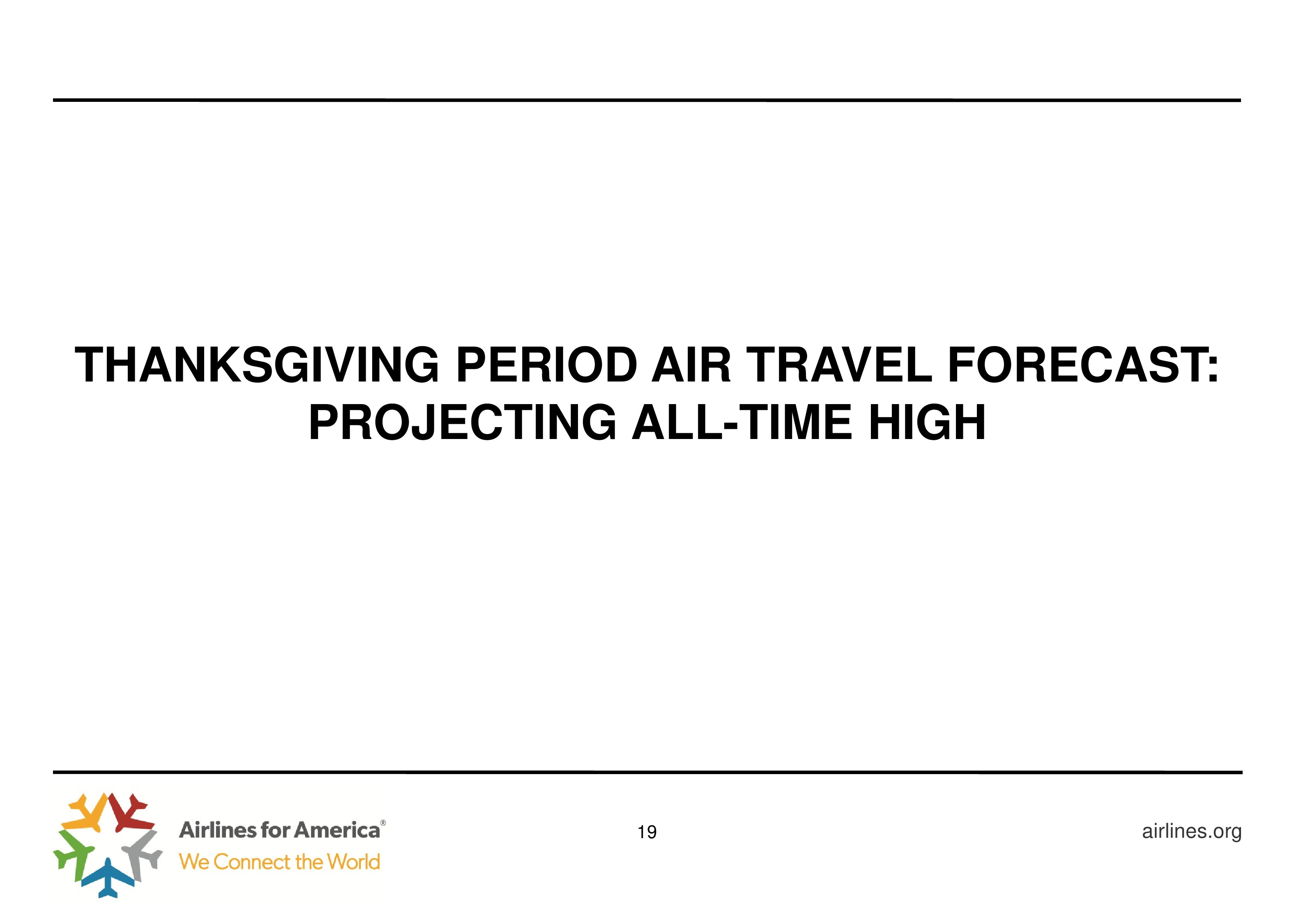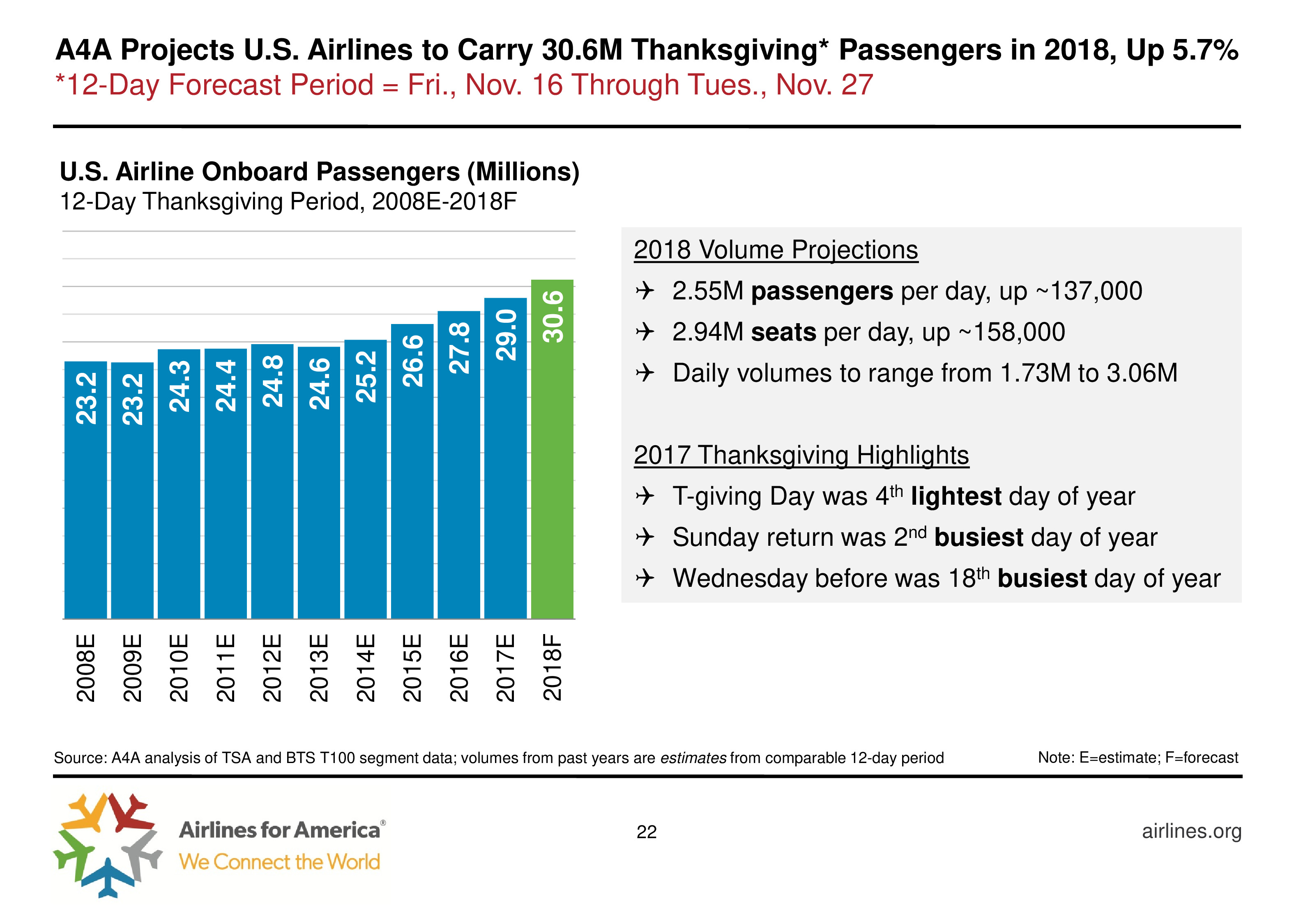 A4A发布了 “2018年美国航空业报告”。从11月16日到11月26日是一年中美国交通最繁忙的,尤其是周末,约有306万人搭乘飞机回家过节,同比增长5.7%。