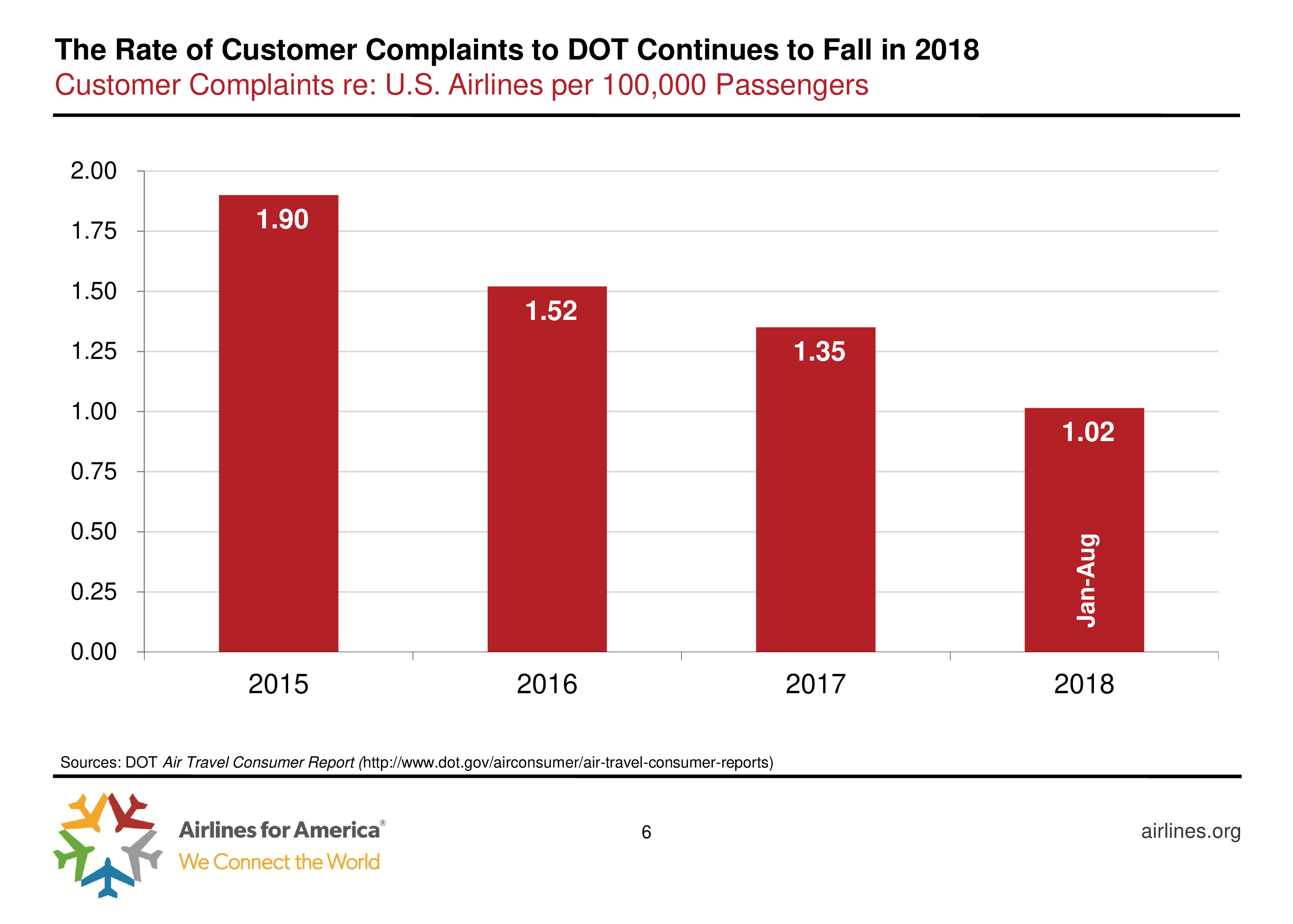 好消息是,2018年美国航空业乘客投诉率继续下降,每十万名乘客只有1.02个投诉,比2015年(1.90)下降近一半。