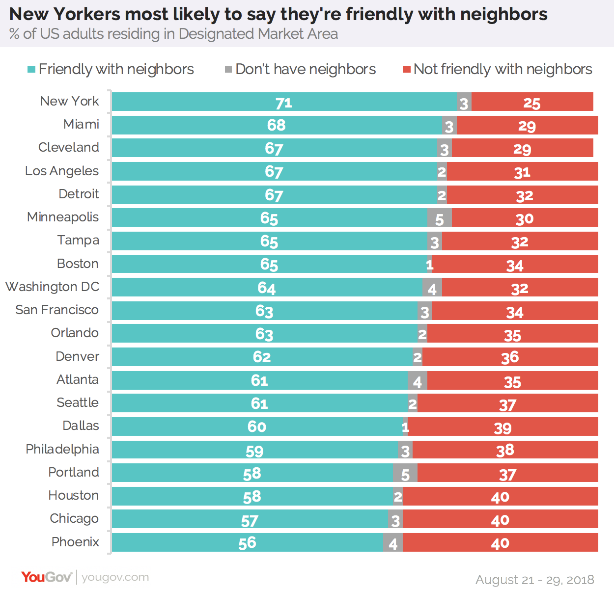 在受访的20个城市里大多数人都更有可能表示与邻居友好相处。迈阿密(68%)、克利夫兰(67%)、洛杉矶(67%)和底特律(67%)的受访者更有可能表示他们与邻居相处融洽。凤凰城的居民最可能与邻居相处的不好,因为40%的受访者这么表示。