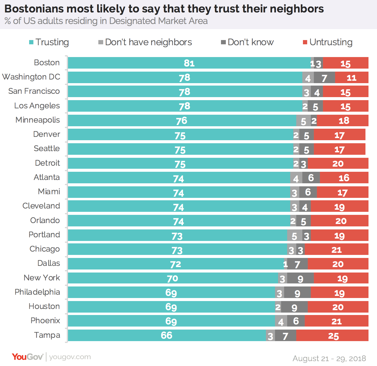 最有可能信任邻居的城市是波士顿,81%的居民表示信任他们的邻居。只有15%的波士顿居民不信任邻居。