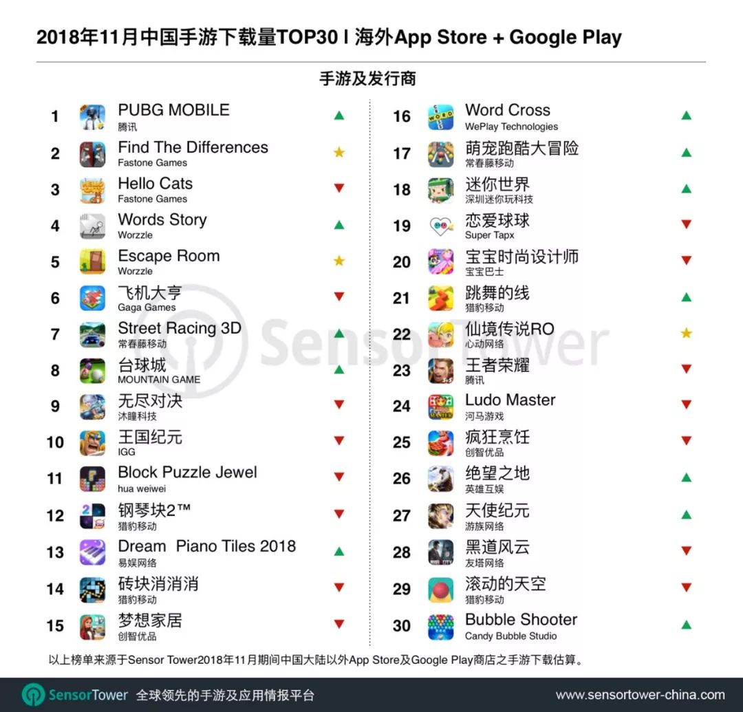 Sensor Tower 商店情报平台最新数据显示,2018 年 11 月期间中国手游产品在海外市场下载量排名 TOP30。本月腾讯《PUBG Mobile》重回下载榜榜首,榜单新面孔有心动网络《仙境传说 RO》,以及Fastone《Find Differences: Detective》,Worzzle《Escape Room》。详细榜单变化如下。