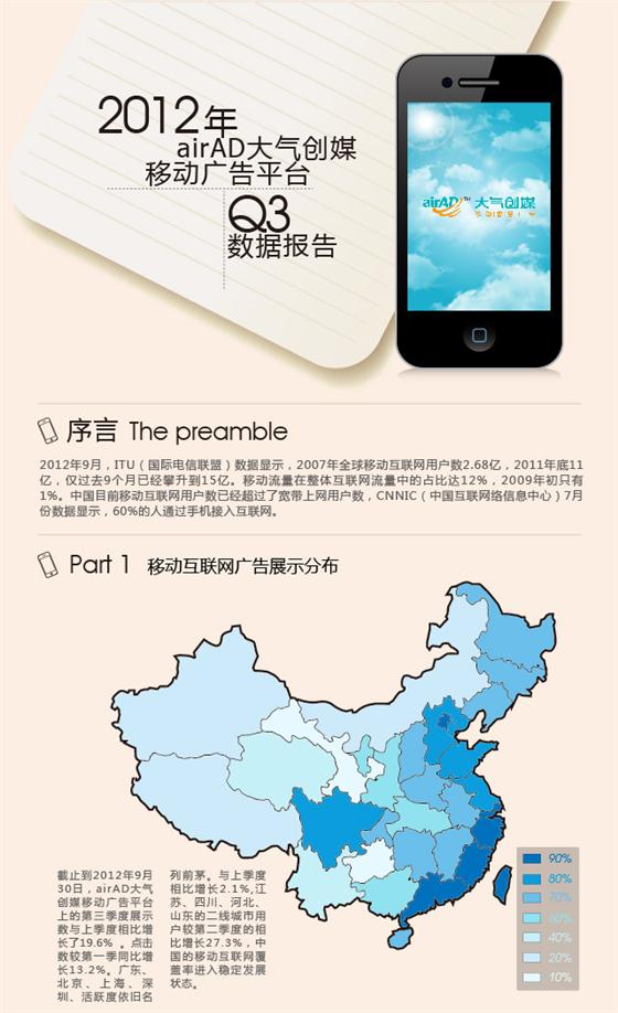 截止到2012年9月30日,airAD大气创媒移动广告平台上的第三季度展示数与上季度相比增长了19.6% 。点击数较第一季同比增长13.2%。广东、北京、上海、深圳、活跃度依旧名列前茅。与上季度相比增长2.1%,江苏、四川、河北、山东等二线城市用户较第二季度的相比增长27.3%,中国的移动互联网覆盖率进入稳定发展状态。