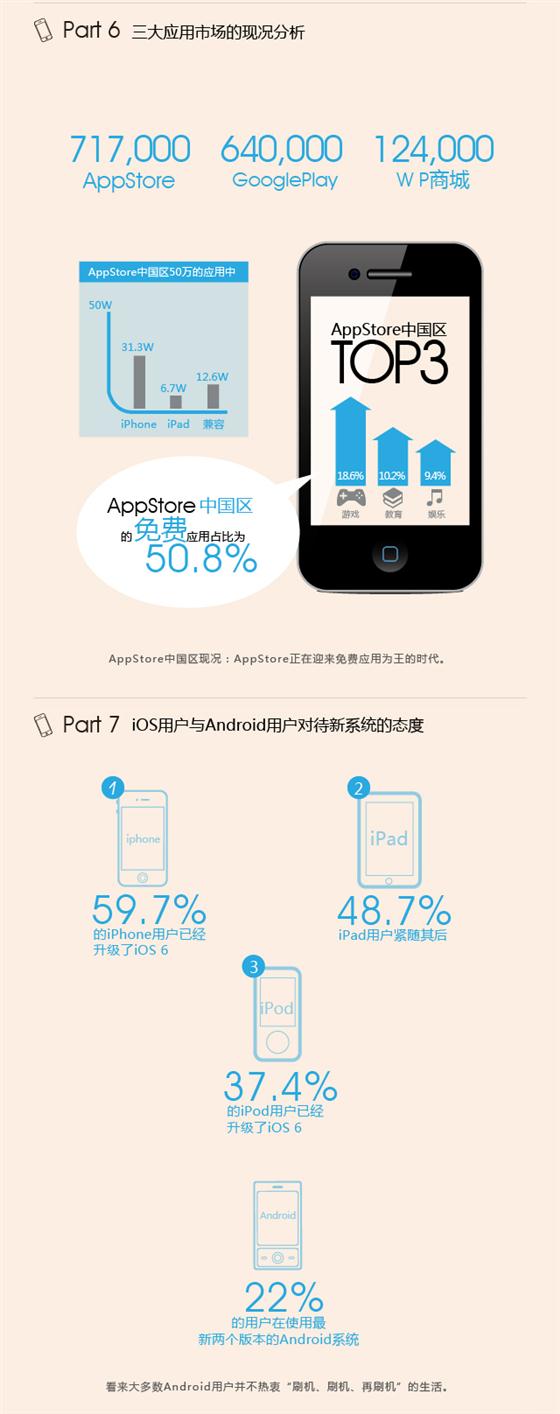 苹果的AppStore目前已经拥有超过70万个应用,其中25万个专门为iPad而开发。谷歌的GooglePlay用数量为64万。微软的WP商城应用数量已达到12.4万。