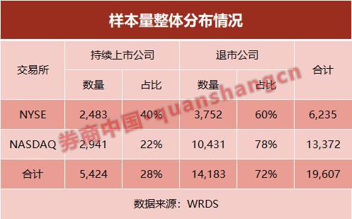 WRDS数据显示,1980年至2017年期间,美股市场仍上市和已退市的公司数合计达到26505家,扣除6898家存续状态不明的公司,仍处于上市状态的公司5424家,占比28%;已退市公司14183家,占比72%。