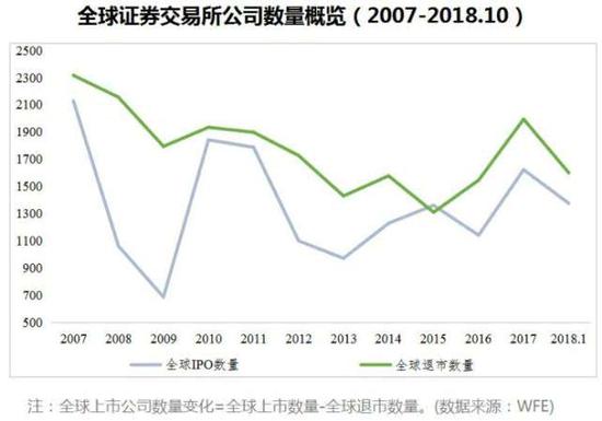 WFE数据显示,2007年至2018年10月期间,全球的上市公司退市数量累计值达到21280家,超过IPO数量累计值16299家。