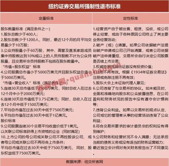 纽交所的退市标准在自愿退市标准方面的规定较少,主要集中在强制退市方面。强制退市标准分为交易类指标、持续经营能力指标和合规性指标三类。具体是指: