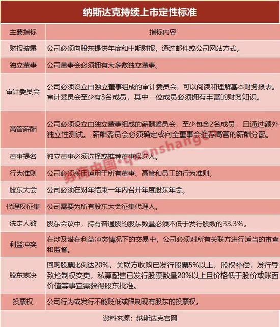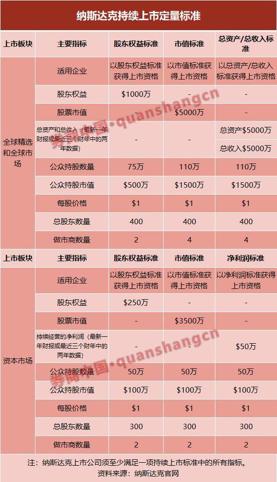 根据不同市场特点,纳斯达克分别制定了不同的持续上市标准: