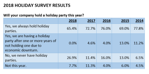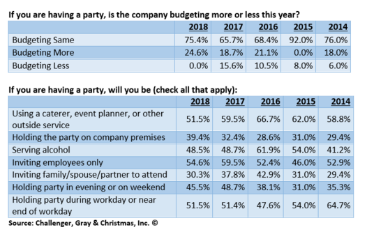 根据Challenger和Gray&Christmas的调查结果,今年有65%的公司计划举办节日派对,这是自2009年以来的最低数字,当时62%的公司举办了节日庆祝活动。