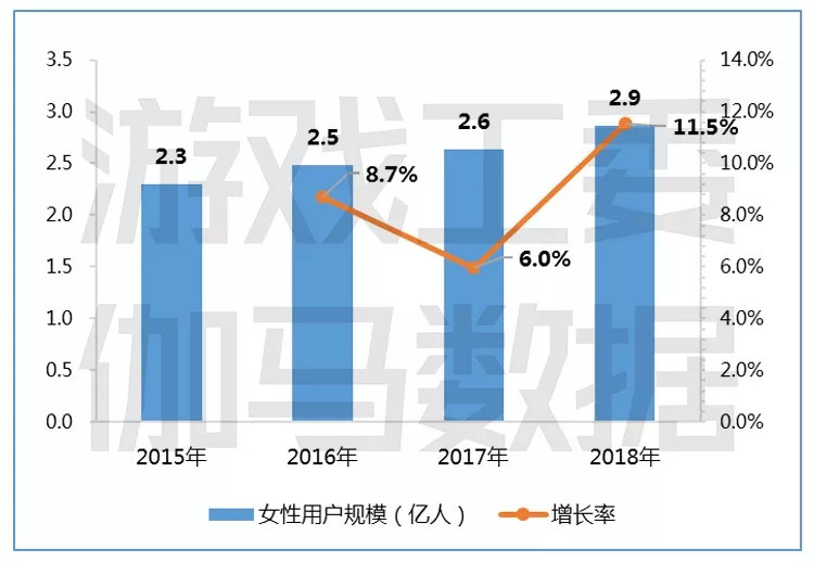 报告显示,2018年中国游戏市场女性用户消费规模为490.4亿元,同比增长13.8%。2018年中国游戏市场女性用户规模为2.9亿人,同比增长11.5%。