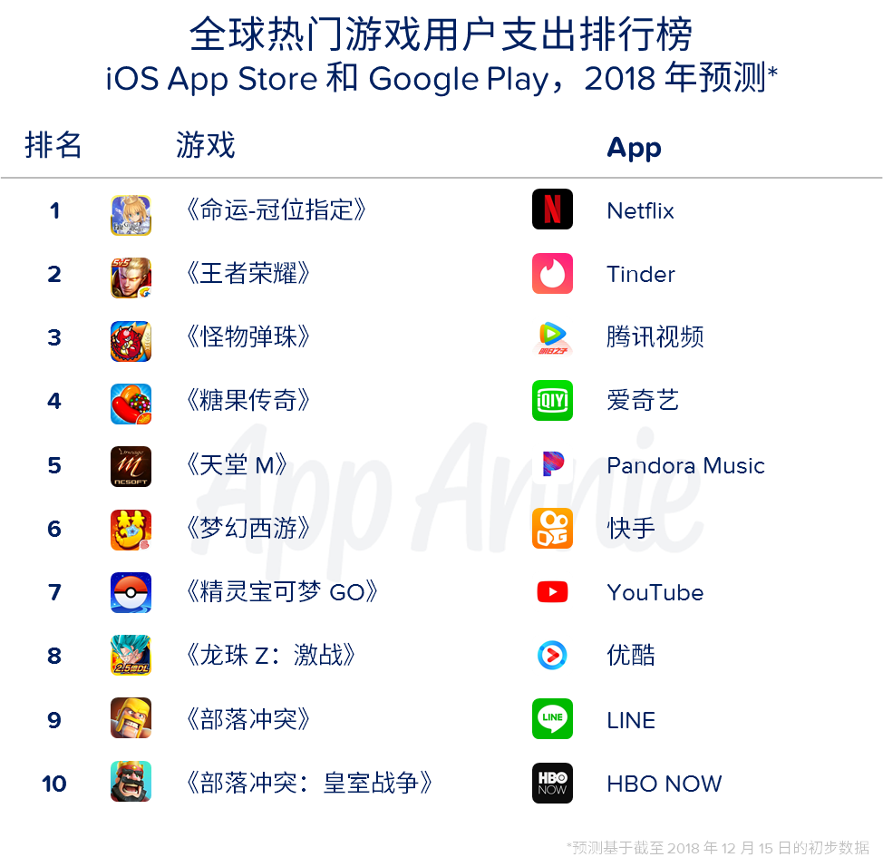 截至 2018 年 12 月 15 日的初步数据,我们预测 2018 年 iOS 和 Google Play 全球下载量将超过 1130 亿次,与 2017 年相比增长 10%。预计用户支出的增长速度更快,同比增长将达到 20%,全球总支出将超过 760 亿美元。这样的成果主要得益于移动游戏 (最热门和最赚钱的游戏形式) 的用户支出增长,以及非游戏类 App 应用内订阅收入的不断增加。