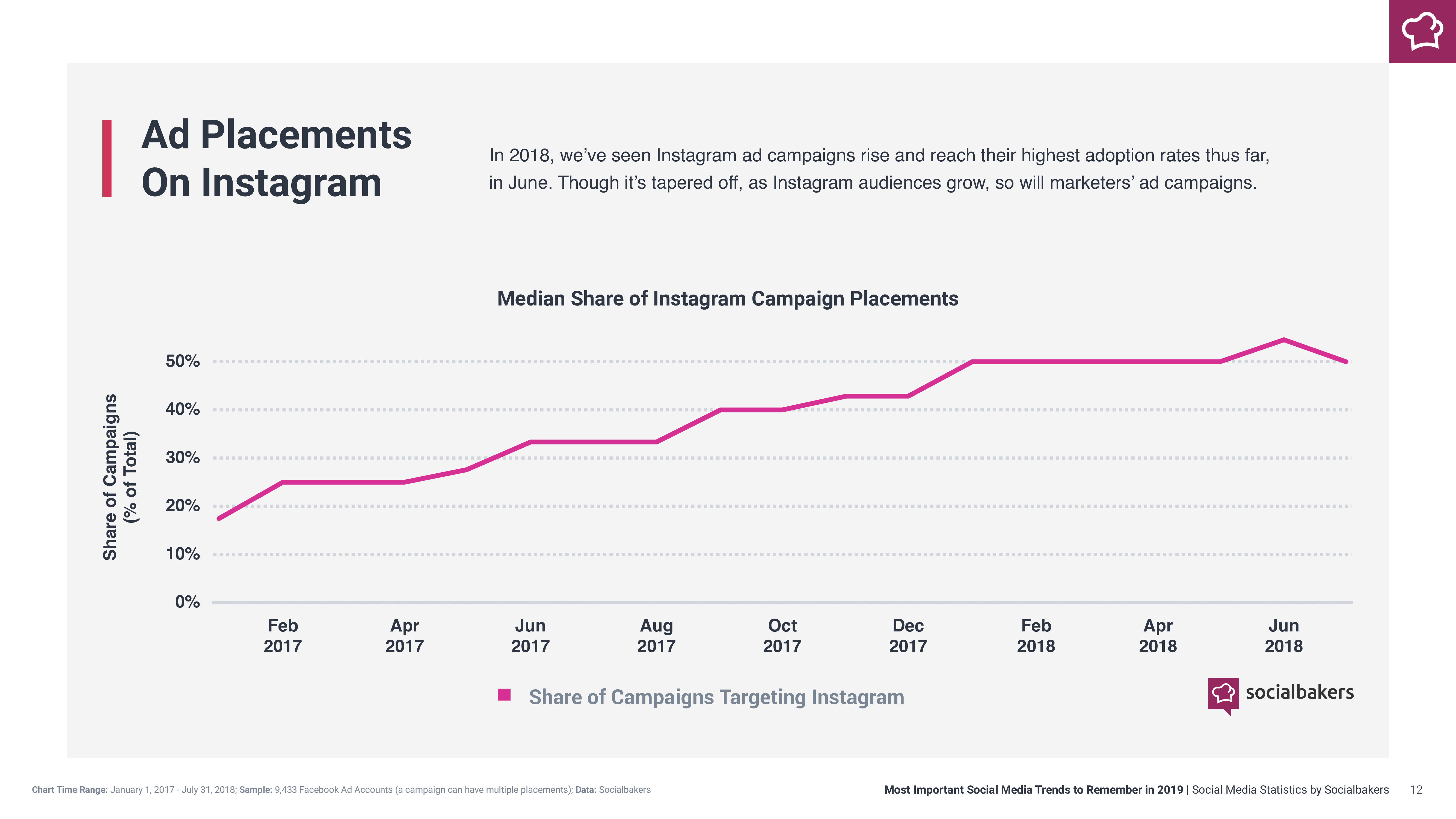 2018年,Instagram广告活动在6月份上升并达到了迄今为止最高的采用率。虽然Instagram用户数量增长放缓,但营销人员的广告活动还在增长。