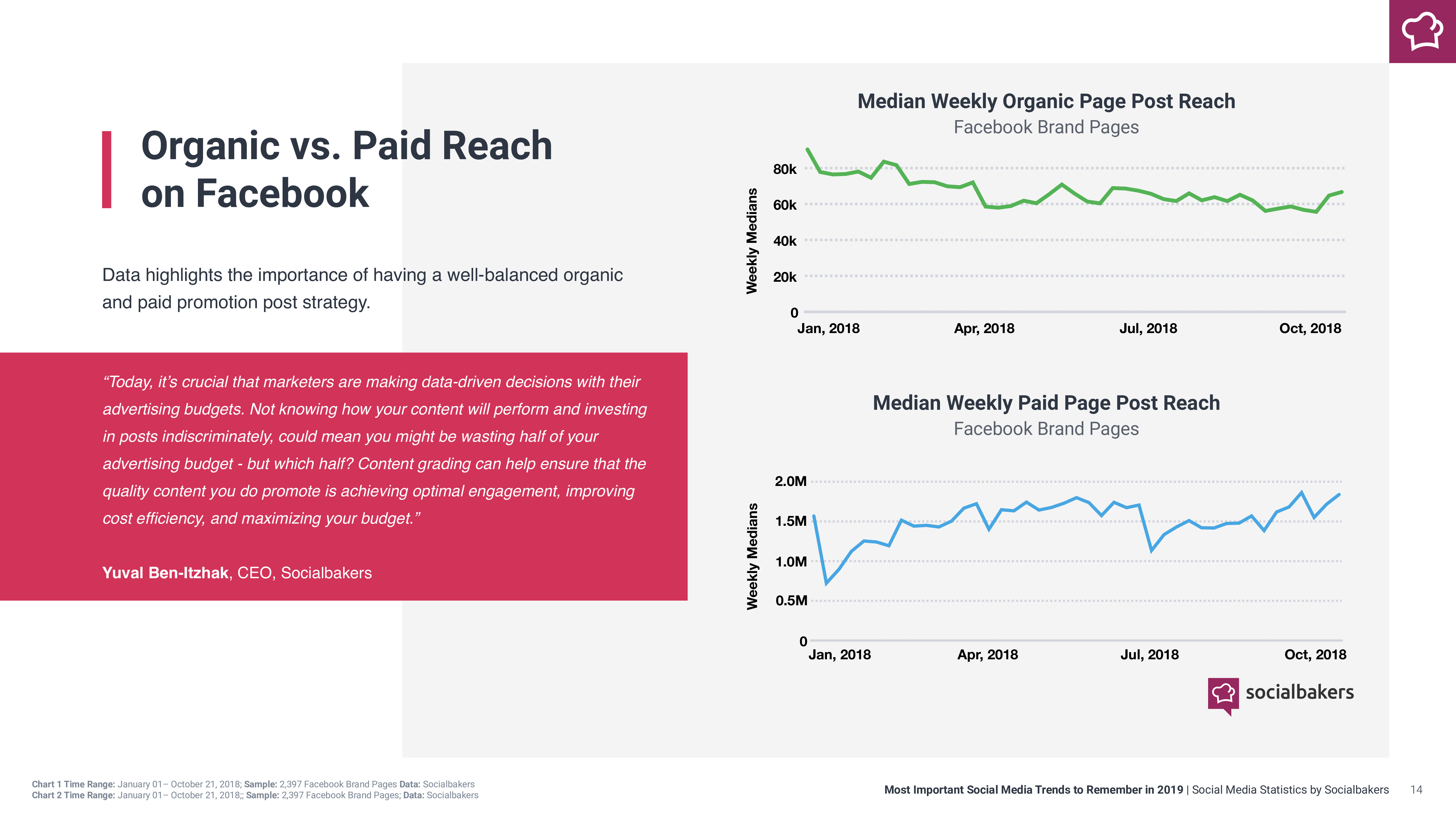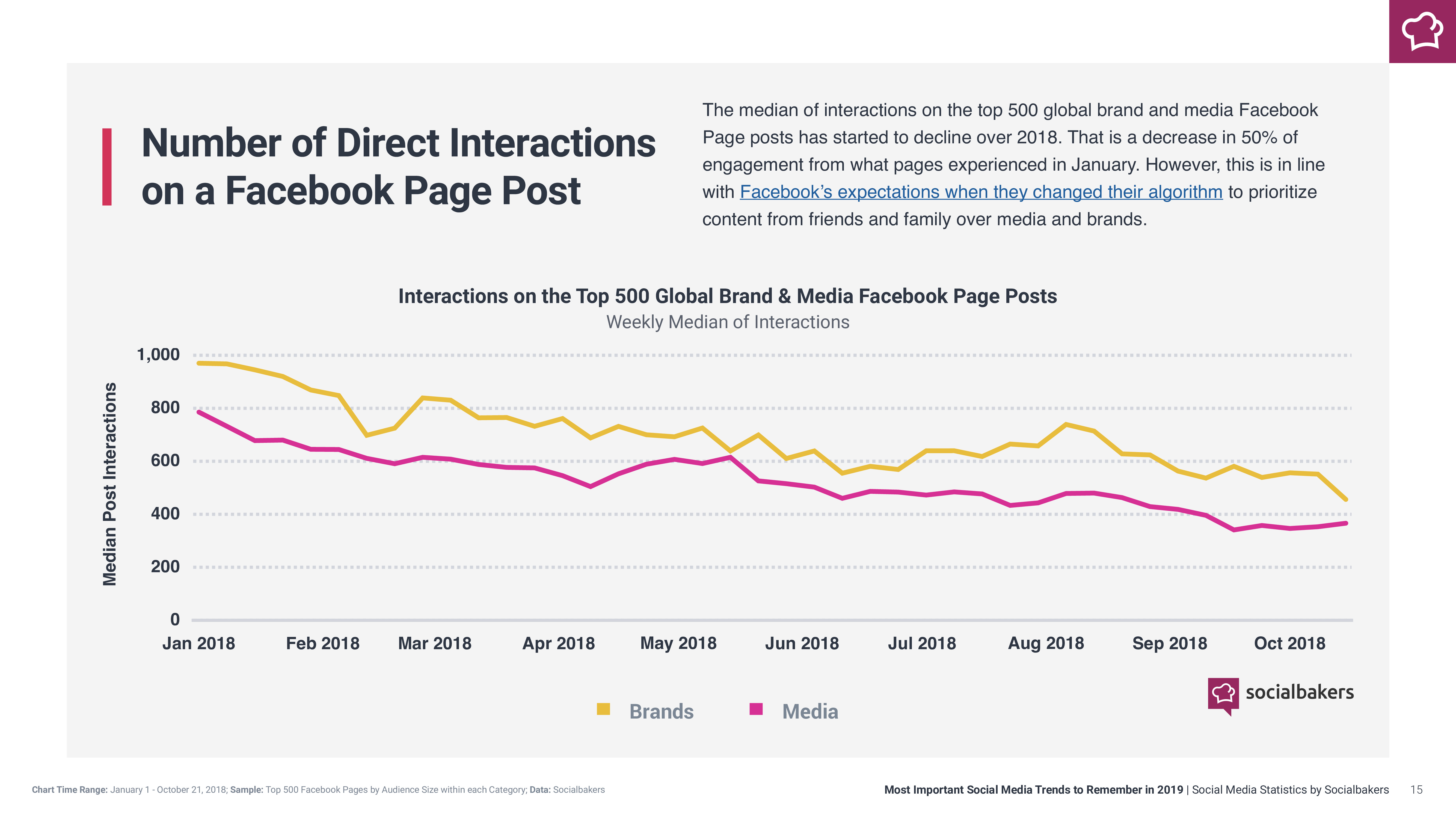 数据强调了平衡有机内容和付费促销策略的重要性。2018年,全球500强品牌的Facebook页互动呈下降趋势,年底和1月比下降了50%。