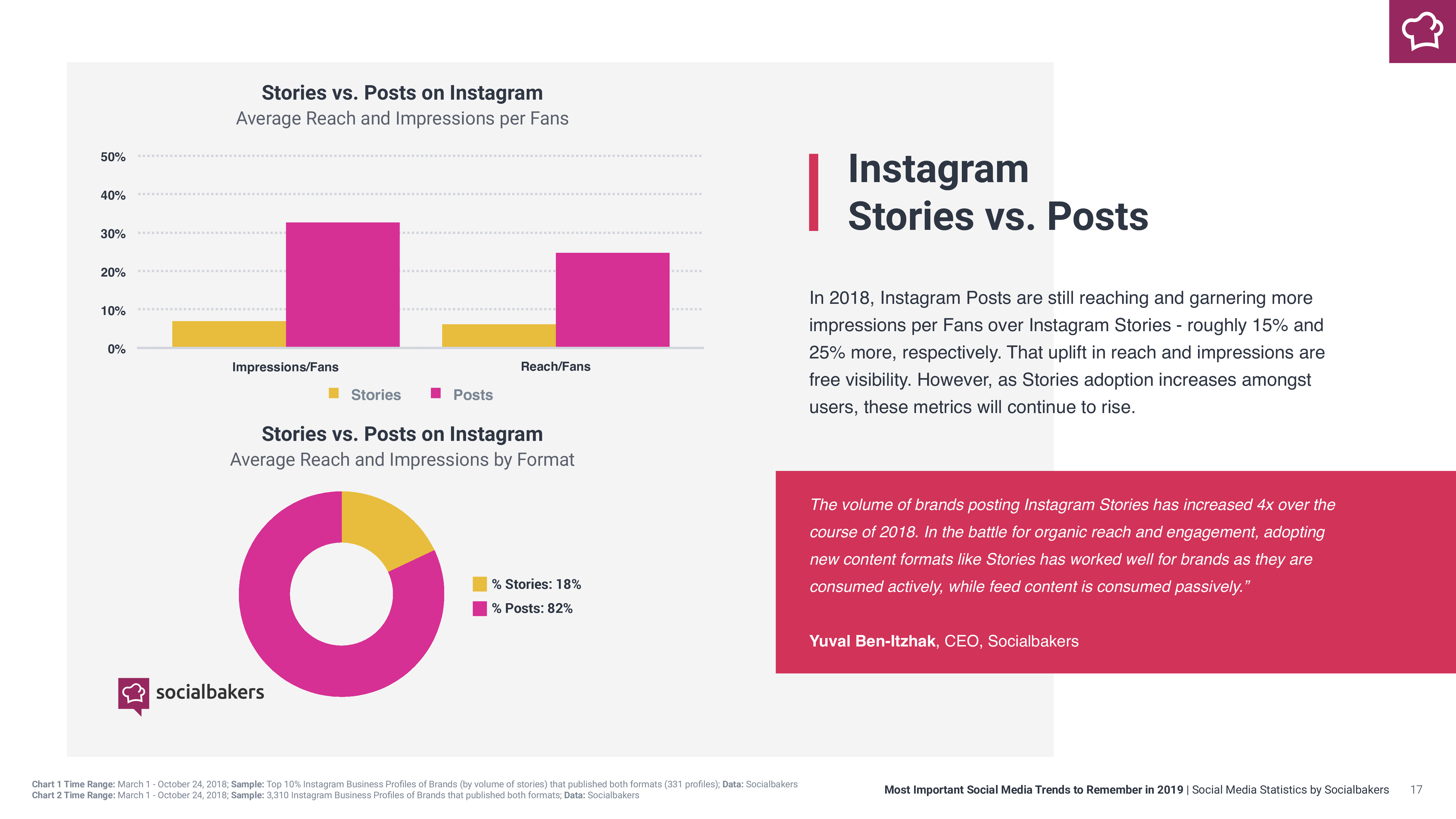 2018年,Instagram帖子产生的可视性仍然高于Stories,分别为25%和15%。但是随着用户越来越喜欢使用Stories,其指标将继续上升。