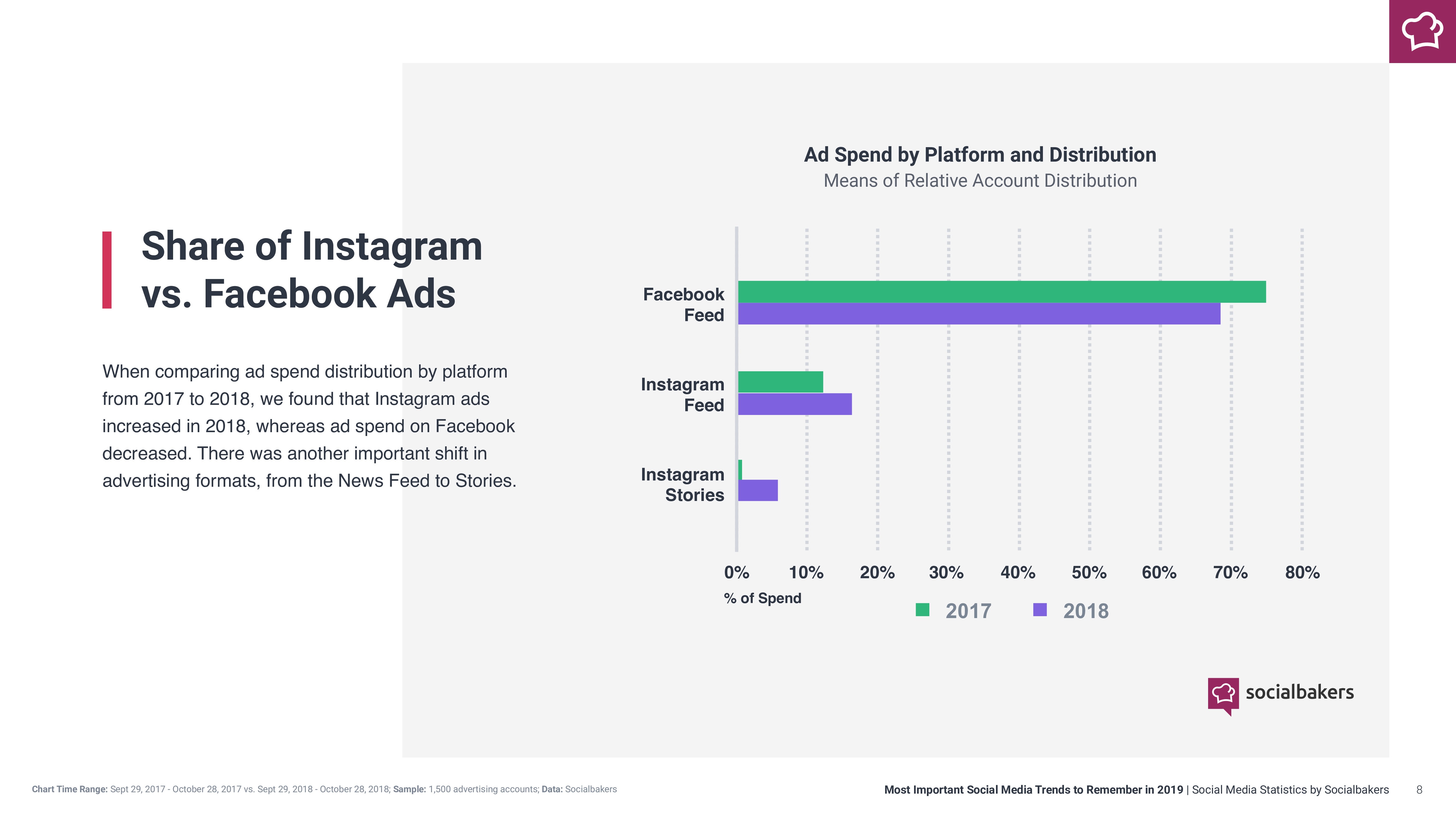 通过比较2017-2018年的广告支出情况,我们发现Instagram广告在2018年增加显著,而Facebook的广告支出则在减少。从新闻推送到故事,广告形式也在发生重大转变。