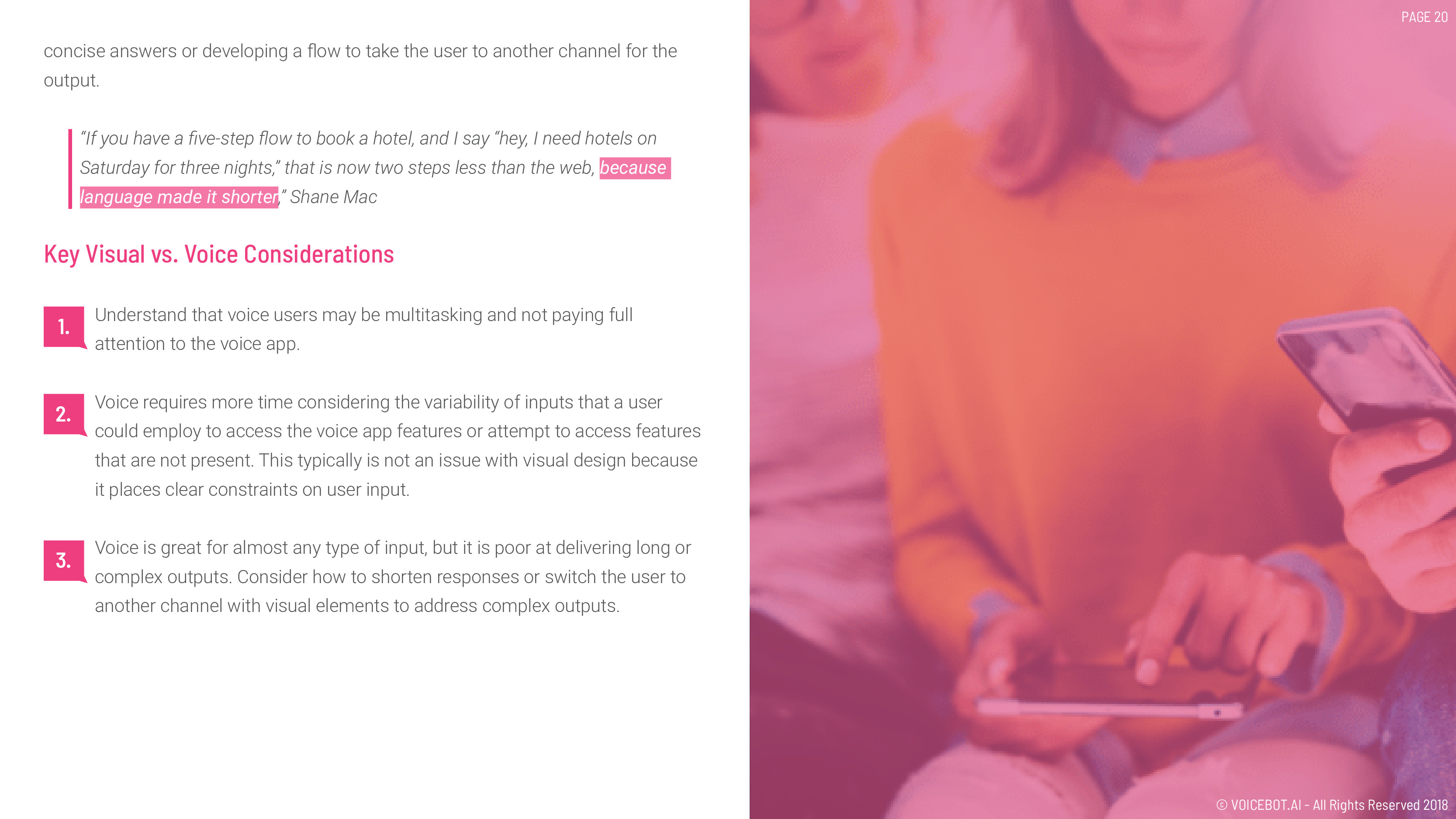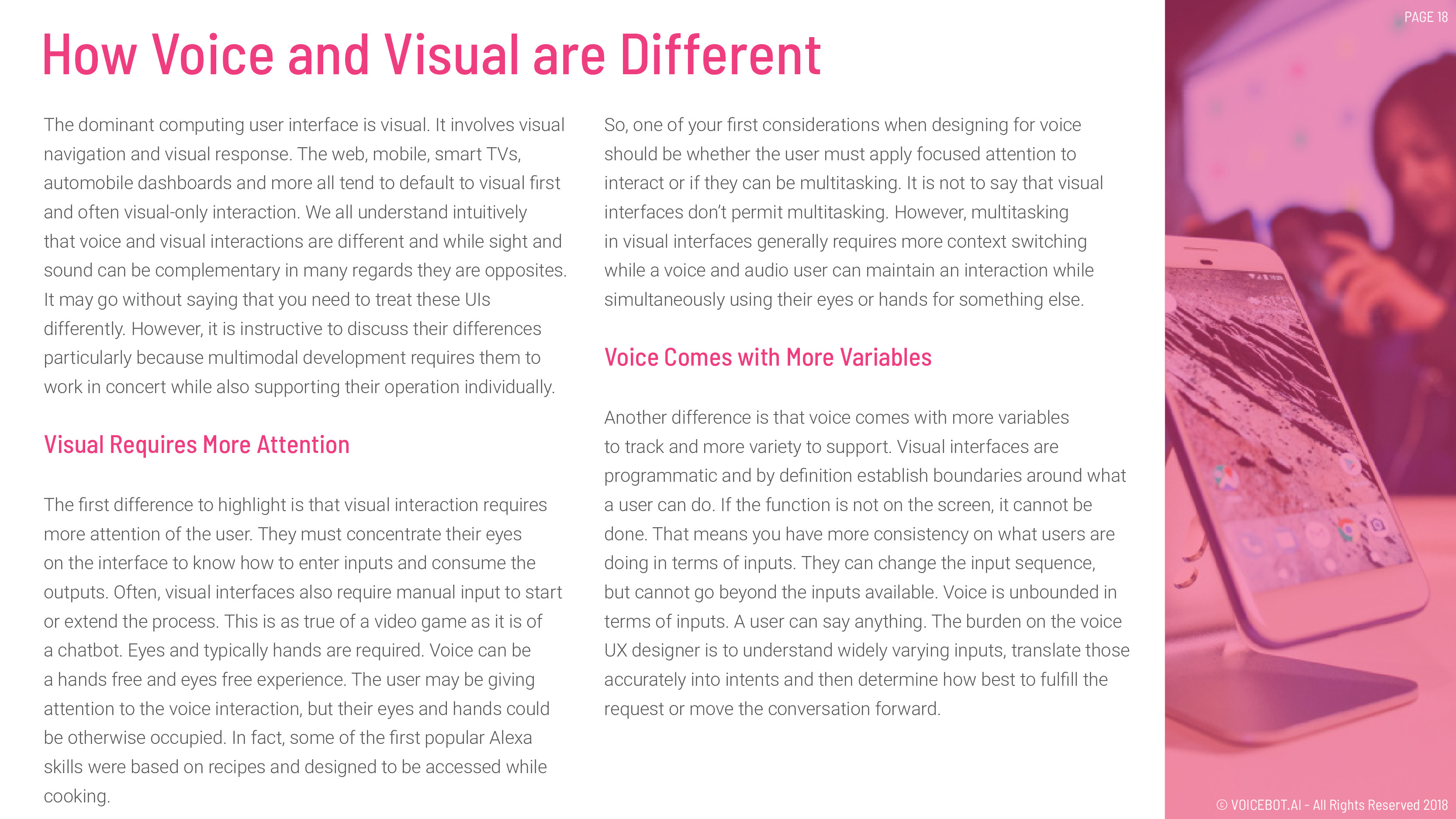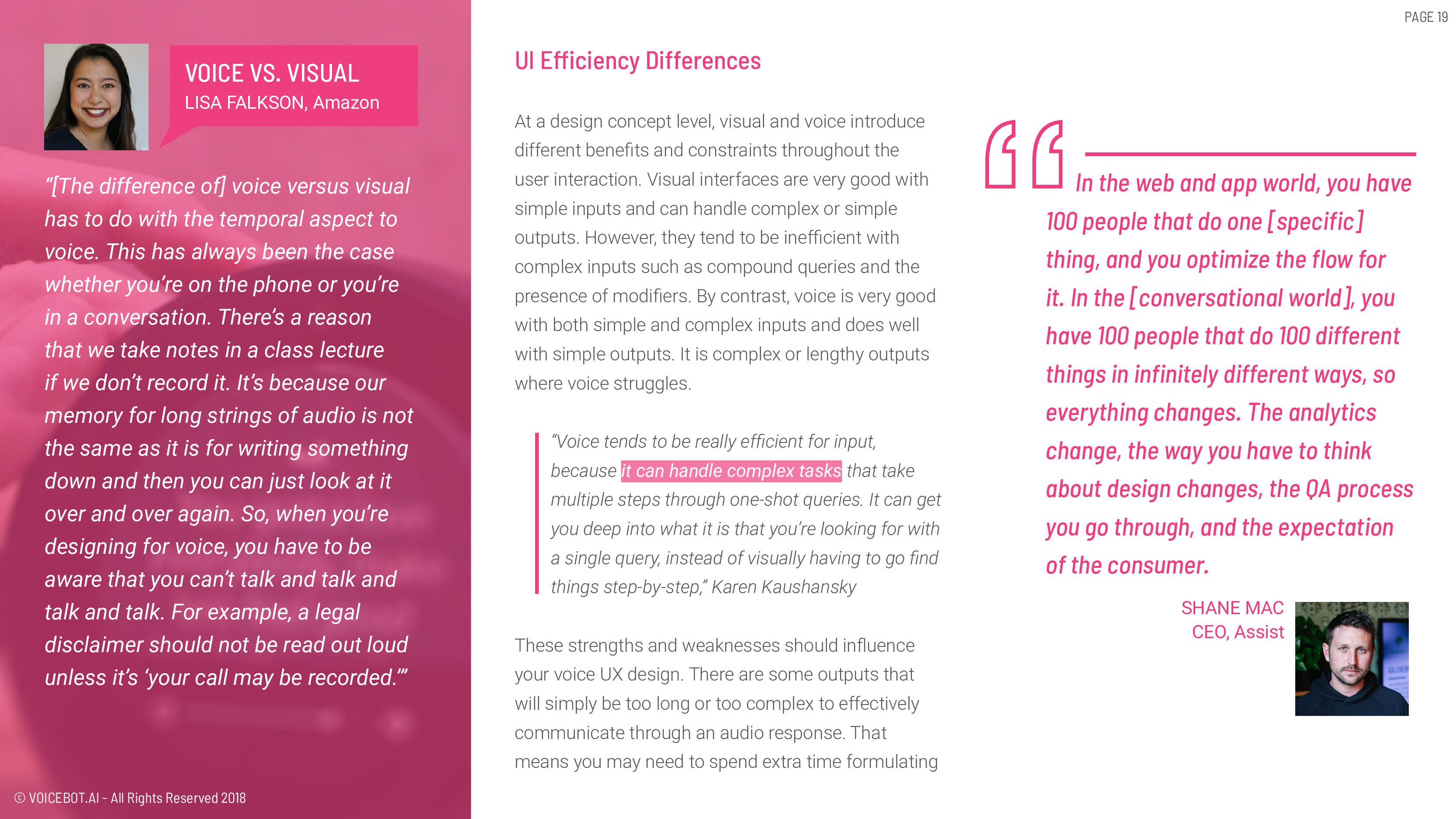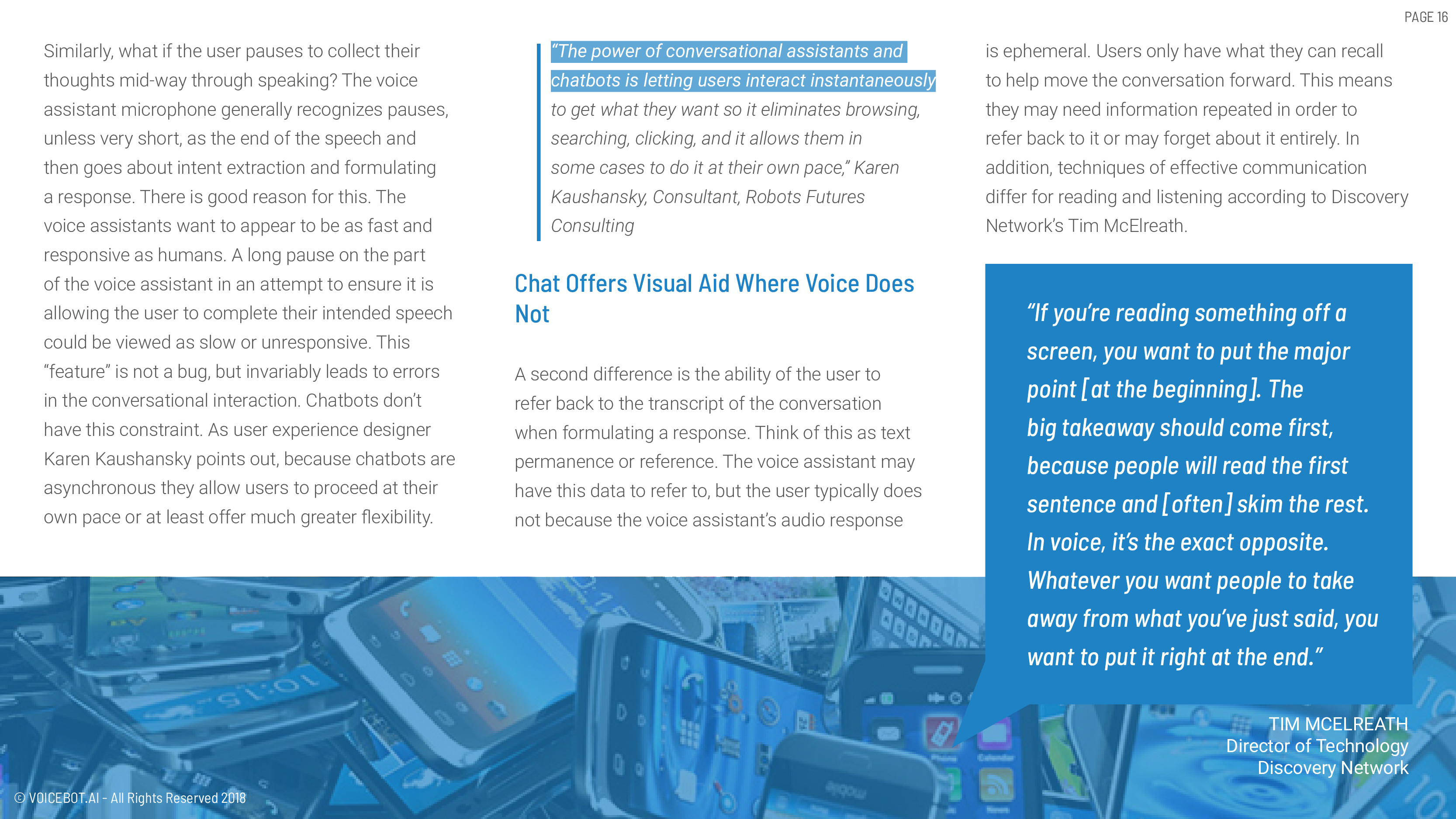 报告还分析了聊天机器人和语音技术的差异,即前者可以提供后者无法提供的视觉辅助。