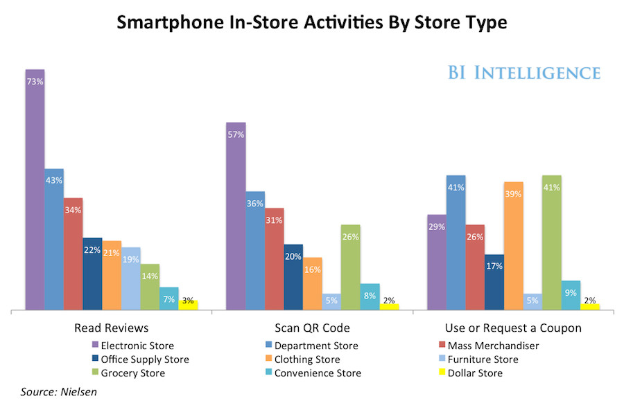 不同类型商店里,智能手机在店里的活动不同(从左至右的活动依次为:阅读评论、扫描二维码、使用或申请优惠券)
