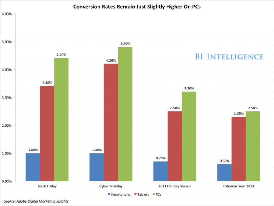 虽然使用PC的购物者转化率依旧较高,但是差距并没有那么明显(2011年假日购物季的这段时间,平板购物者为2.5%,PC购物者为3.2%。)