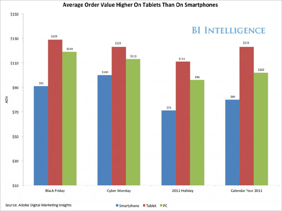 Adobe数字营销观察(Adobe Digital Marketing Insights)最近的一份报告显示,2011年使用平板设备的消费者比使用智能手机的购物者在零售网站上的每一次购物中会多花50%——更令人意想不到的是,(使用平板设备的消费者)和使用PC的购物者相比要多出20%。