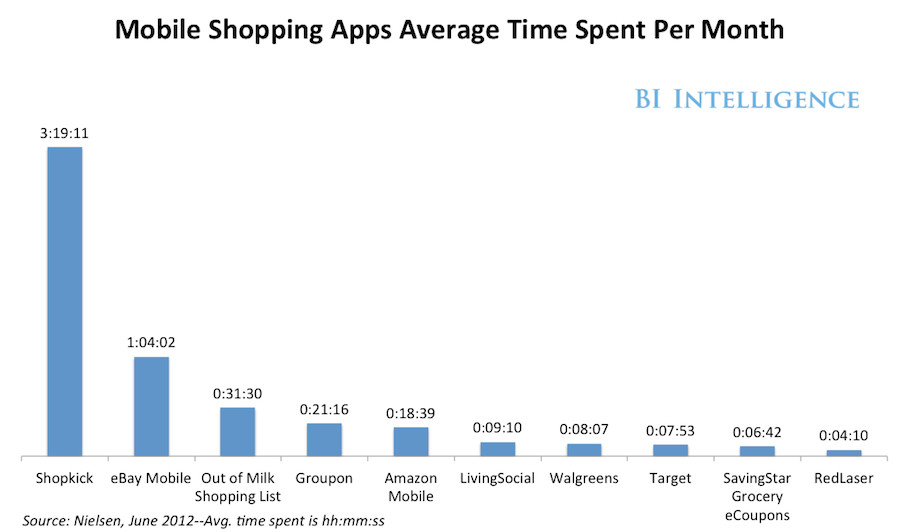 移动应用Shopkick采用类似的送奖励的运作方式,外加地理位置匹配。购物者能可以通过试穿衣服或者扫描条码获得“kick币(kickbucks)”。还可以兑换奖励和优惠券,发现新产品——全都是在线下商店内完成。尼尔森的数据显示,平均每位Shopkick用户一个月使用该款应用的时间超过三个小时,远超过eBay和Groupon自己开发的应用。