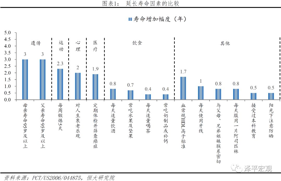 除遗传外,运动、心理、医疗及饮食因素对延长寿命的作用较为明显。父亲或母亲寿命 95岁及以上均将增加寿命3年,说明了遗传对于超长寿命的重要性。运动方面,每周锻炼5天将增寿2.3年;心理方面,对人生衰老乐观增寿2年;医疗方面,定期体检并筛查癌症增寿1.9年;饮食方面,健康饮食辅以适量的酒、茶可延年益寿。此外,高HDL(高密度脂蛋白)、良好的卫生习惯、紧密的人际关系及高等教育也对增寿有益。