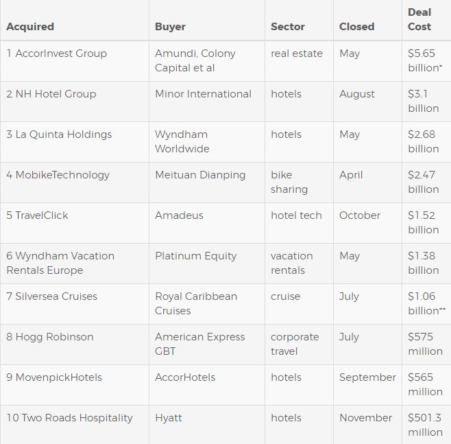 按交易价格排名,下图为2018年旅游业公开披露的十大并购活动: