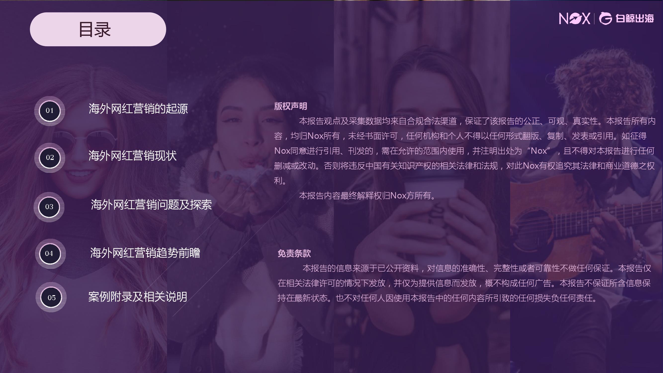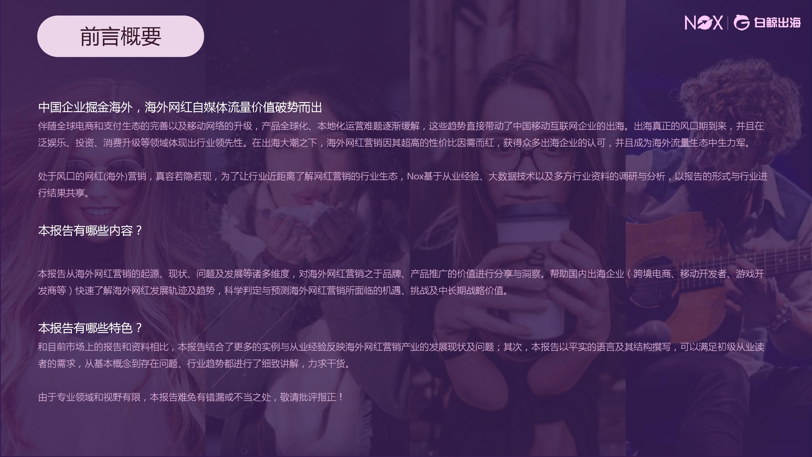 和目前市场上的报告和资料相比,本报告结合了更多的实例与从业经验反映海外网红营销产业的发展现状及问题;其次,本报告以平实的语言及其结构撰写,可以满足初级从业读者的需求,从基本概念到存在问题、行业趋势都进行了细致讲解,力求干货!
