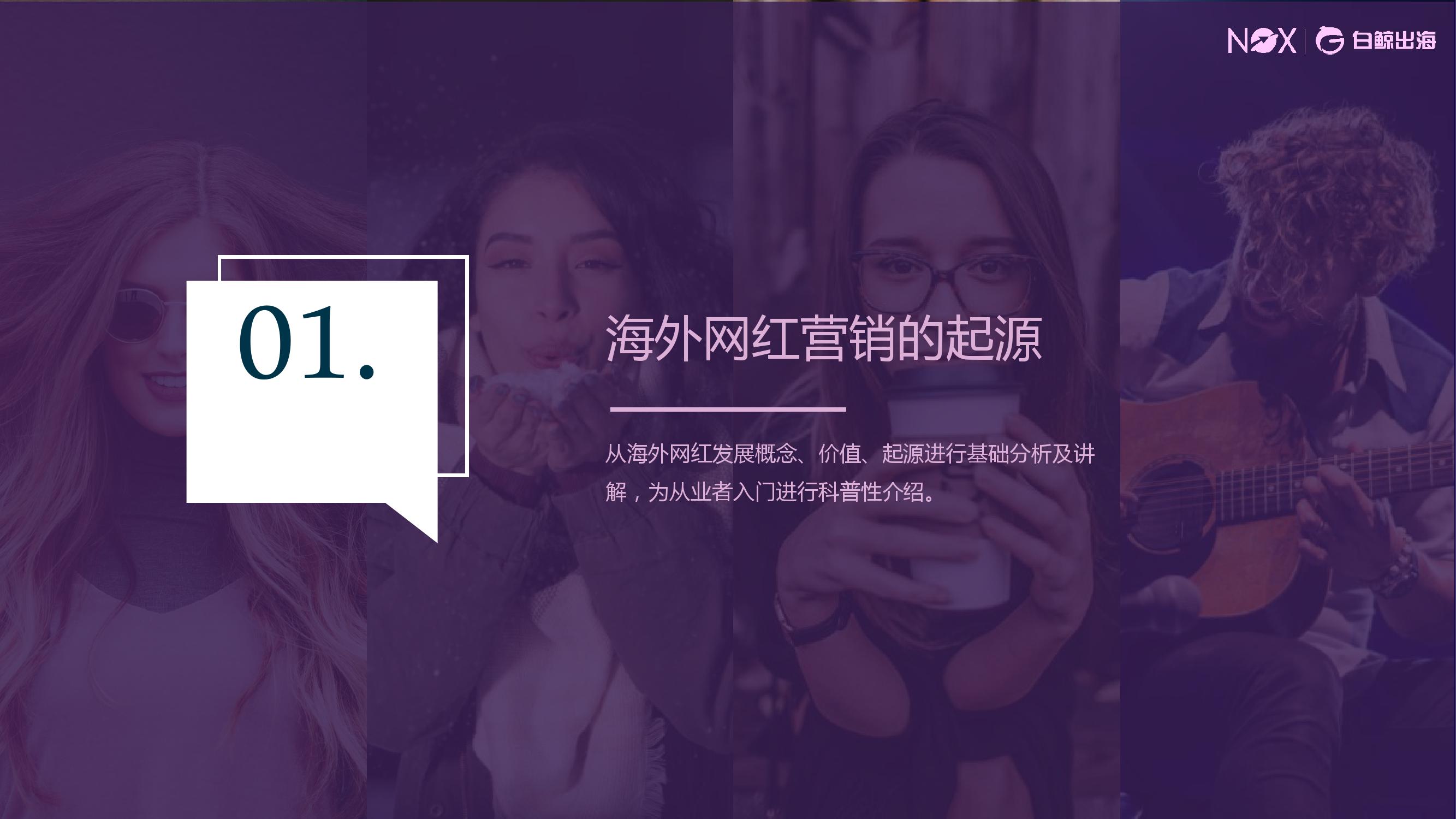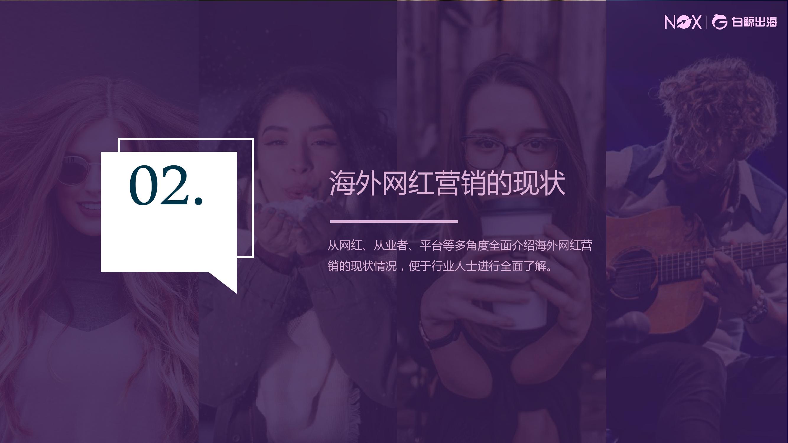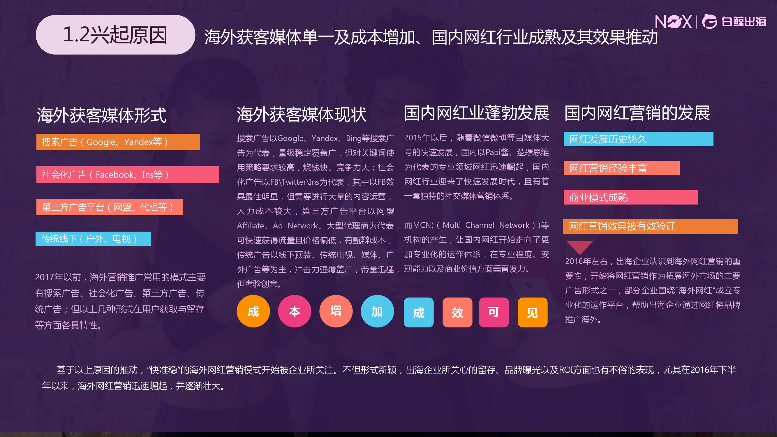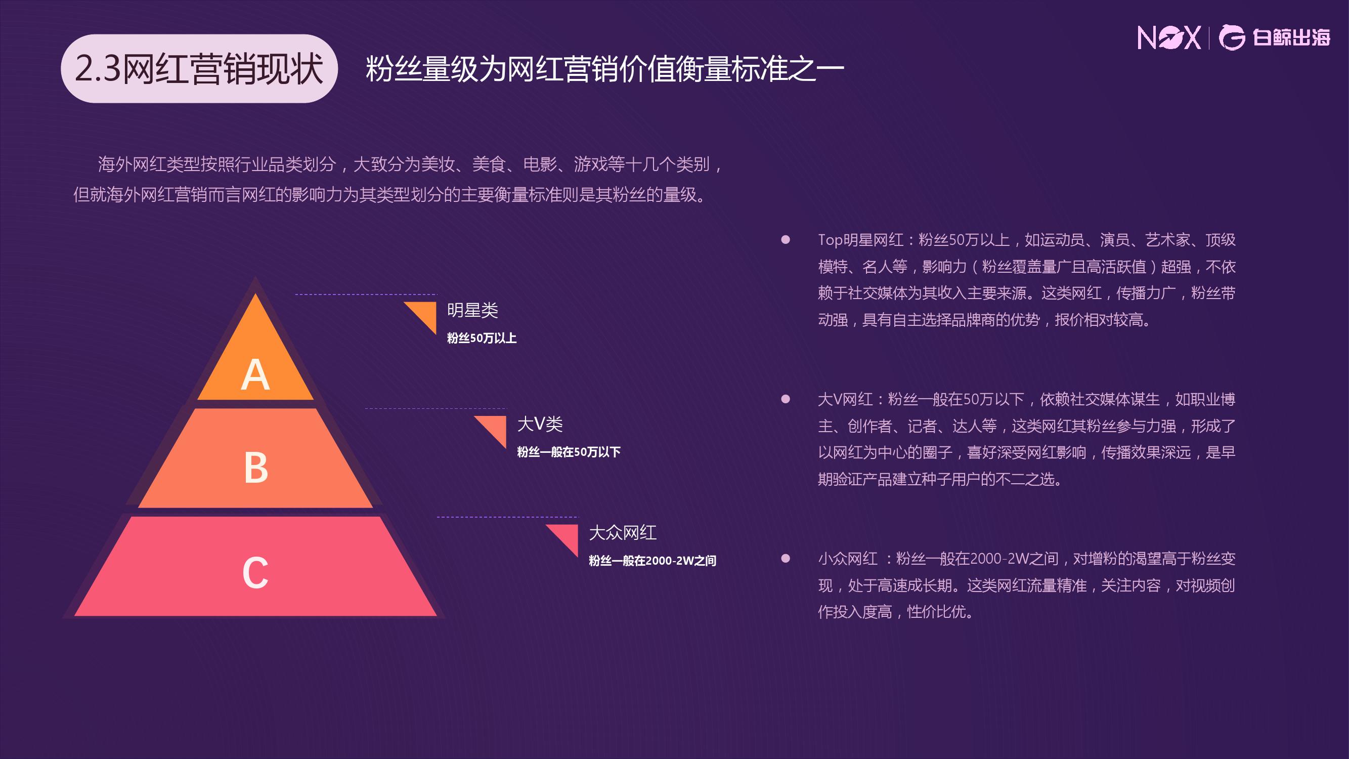 本报告从海外网红营销的起源、现状、问题及发展等诸多维度,对海外网红营销之于品牌、产品推广的价值进行分享与洞察。帮助国内出海企业(跨境电商、移动开发者、游戏开发商等)快速了解海外网红发展轨迹及趋势,科学判定与预测海外网红营销所面临的机遇、挑战及中长期战略价值。