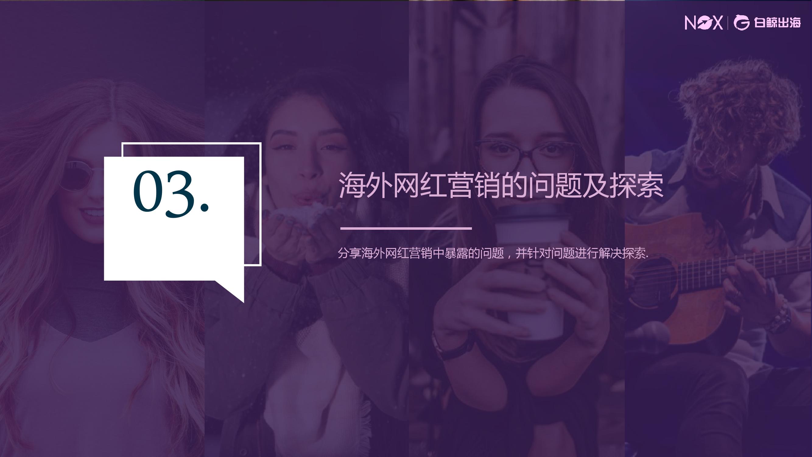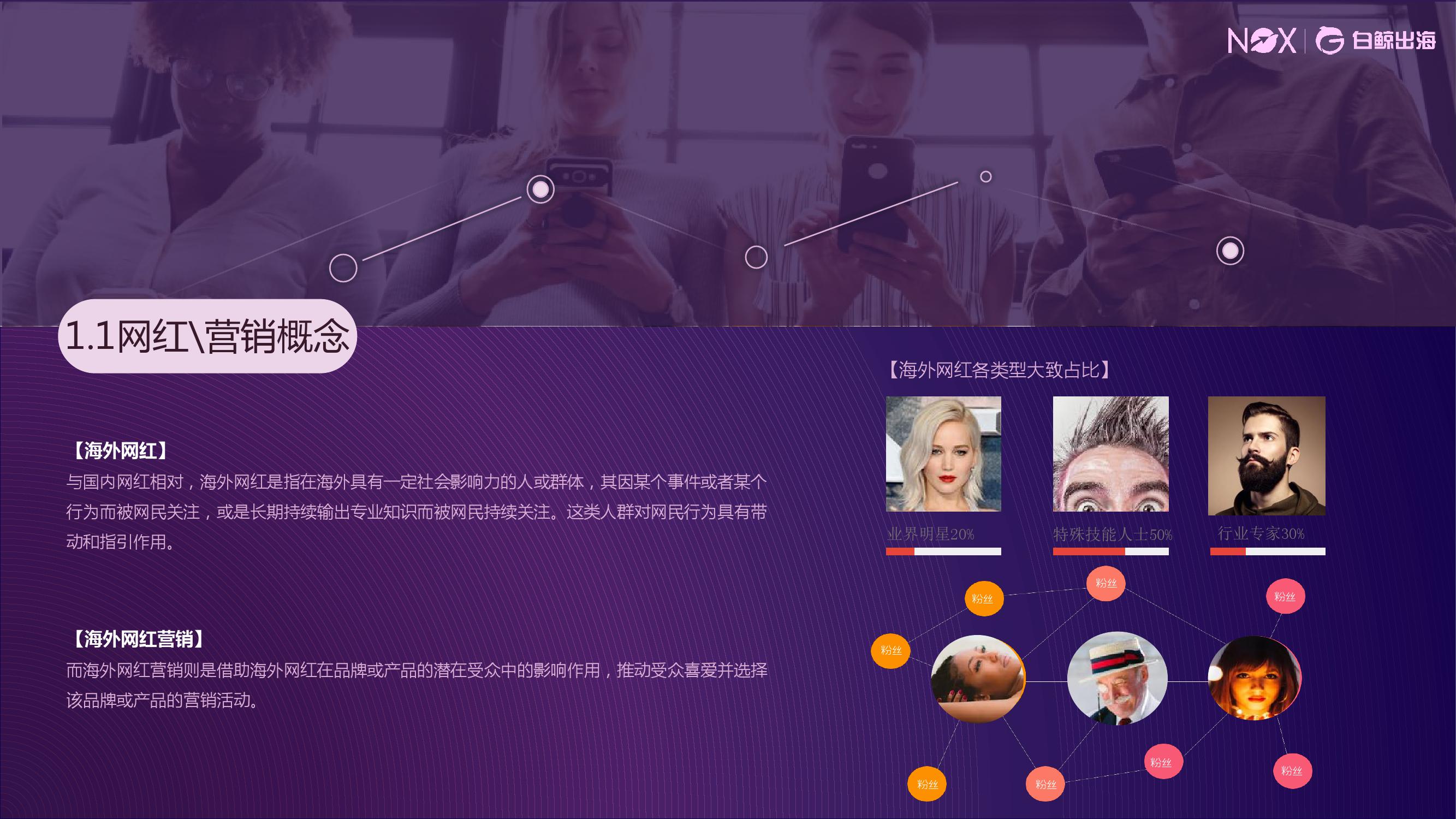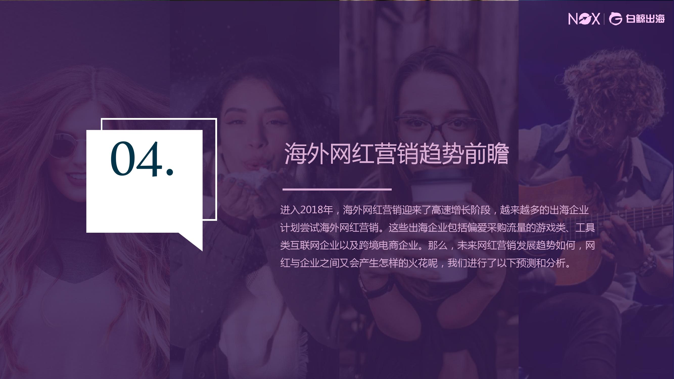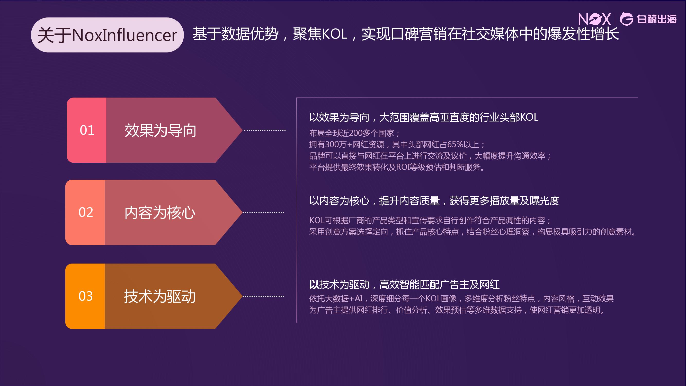 本报告从海外网红营销的起源、现状、问题及发展等诸多维度,对海外网红营销之于品牌、产品推广的价值进行分享与洞察。帮助国内出海企业(跨境电商、移动开发者、游戏开发商等)快速了解海外网红发展轨迹及趋势,科学判定与预测海外网红营销所面临的机遇、挑战及中长期战略价值。